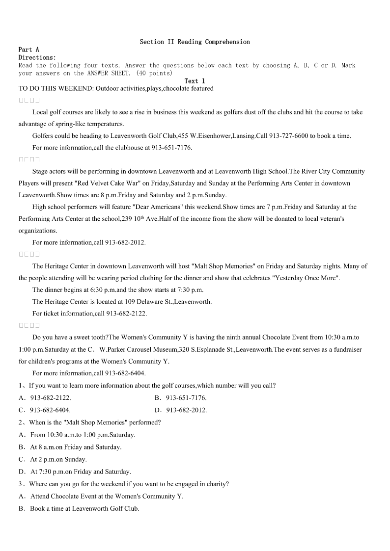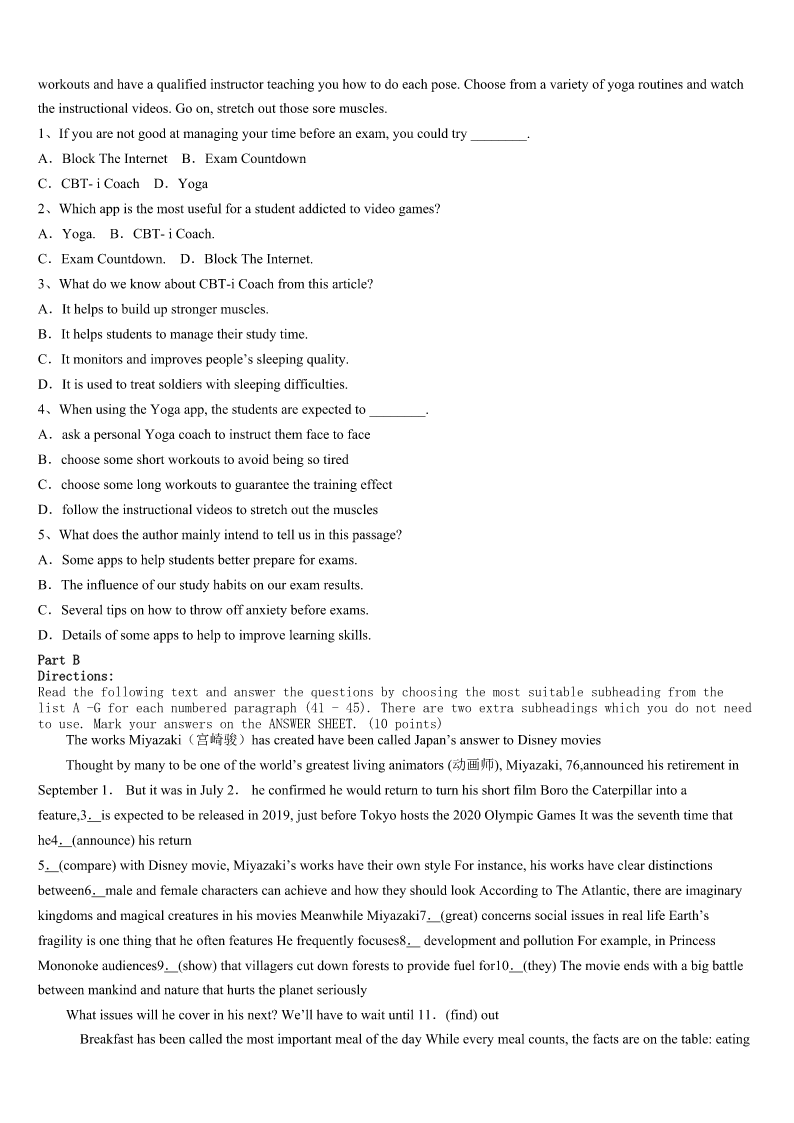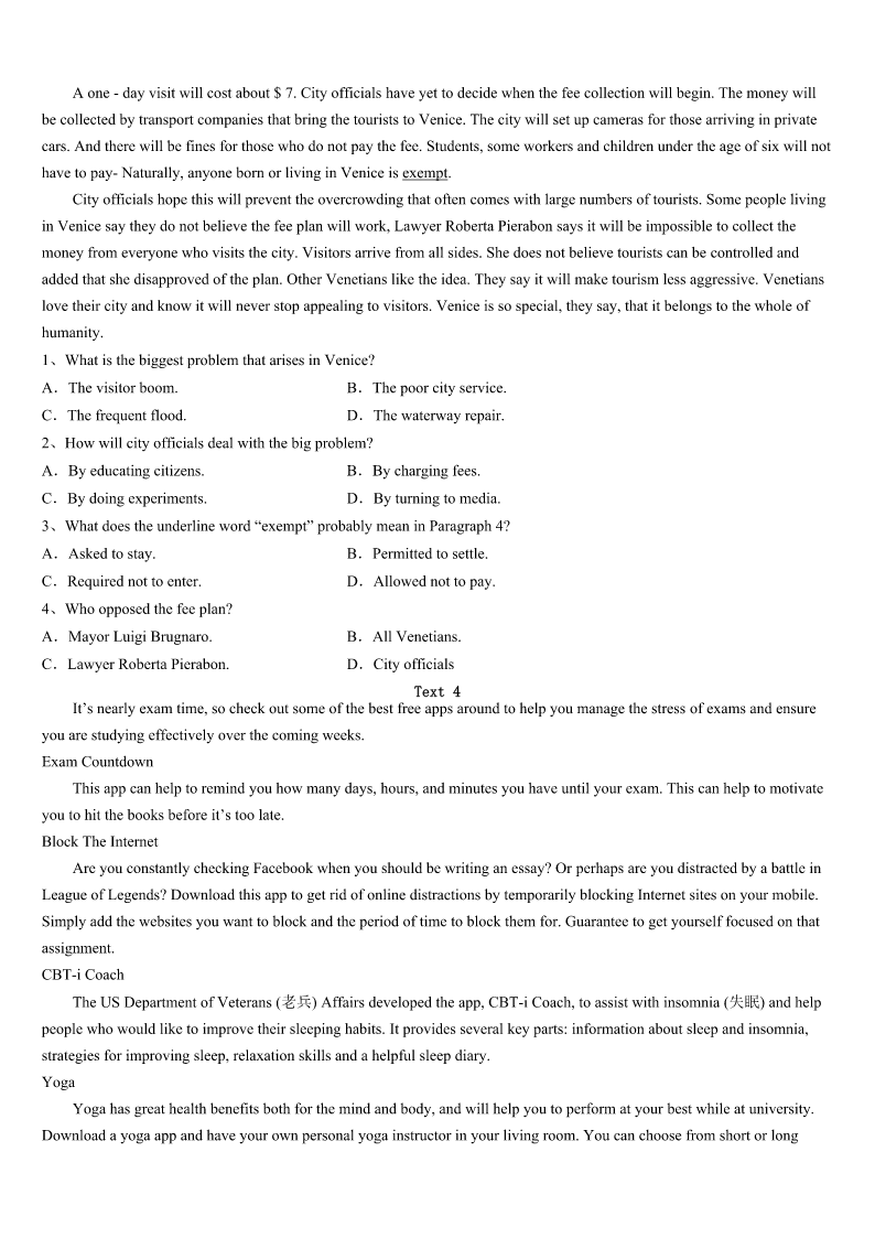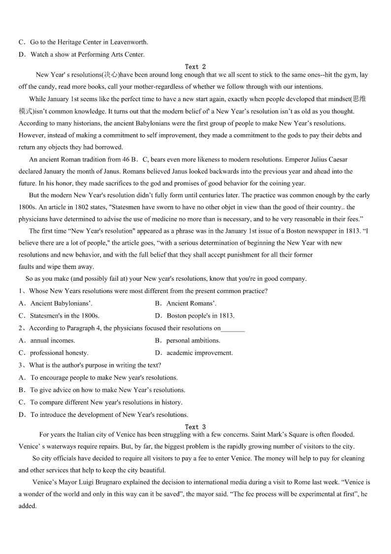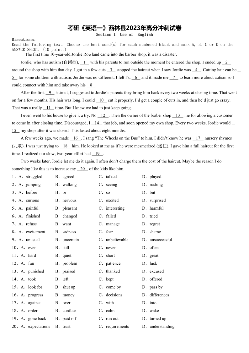考研《英语一》西林县2023年高分冲刺试卷 SectionIUseofEnglish Directions: Readthefollowingtext.Choosethebestword(s)foreachnumberedblankandmarkA,B,CorDonthe ANSWERSHEET.(10points) Thefirsttime10yearoldJordieRowlandcameintothebarbershop,itwasadisaster. Jordie,whohasautism(自闭症),1withhisparentstorunoutsidethemomentheenteredtheshop.Iendedup2 aroundtheshopwithhimthatday.Igotinafewcuts3stoppedthehaircutwhenIsawJordiewas4.Cuttinghaircanbe 5forsomechildrenwithautism.Jordiewasnodifferent.IfeltI’d6anditmademe7tolearnmoreaboutautismsoI couldconnectwithhimandtakeawayhis8. Afterthefirst9haircut,IsuggestedtoJordie’sparentstheybringhimbackeverytwoweeksatclosingtime.Thatwent onforafewmonths.Hishairwaslong.Icould10cutitproperly.I’dgetacoupleofcutsin,andthenhe’djustgocrazy. Thatwasareally11time.ButIknewwehadtojustkeepgoing. Ievenwenttohishousetogiveitatry.No12.Thentheownerofthebarbershop13meforallowingacustomer tocomeinafterclosingtime.Discouraged,I14thatjob,andsoonopenedmyownshop.Everytwoweeks,Jordiewould 15myshopafteritwasclosed.Thislastedabouteightmonths. Afewweeksago,wemade16.Isang“TheWheelsontheBus”tohim.Ididn’tknowhewas17nurseryrhymes (儿歌).Iwasjusttryingto18him.Helookedatmeasifheweremesmerized(迷住).Igavehimafullhaircutforthefirst time.Irealizedourslow,twoyearefforthad19. Twoweekslater,Jordieletmedoitagain.Ioftendon’tchargethemthecostofthehaircut.MaybethereasonIdo somethinglikethisistoincreasemy20ofthekidslikehim. 1、A.struggledB.agreedC.talkedD.played 2、A.jumpingB.walkingC.seeingD.rushing 3、A.beforeB.orC.soD.but 4、A.curiousB.nervousC.excitedD.surprised 5、A.painfulB.pleasantC.interestingD.harmful 6、A.finishedB.changedC.failedD.tried 7、A.refuseB.wantC.manageD.regret 8、A.excitementB.sadnessC.fearD.shame 9、A.unusualB.uncertainC.unbelievableD.unsuccessful 10、A.everB.stillC.neverD.often 11、A.hardB.quietC.shortD.great 12、A.funB.problemC.patienceD.luck 13、A.punishedB.praisedC.thankedD.excused 14、A.tookB.leftC.keptD.offered 15、A.lookforB.shutupC.comebyD.passby 16、A.progressB.moneyC.decisionsD.differences