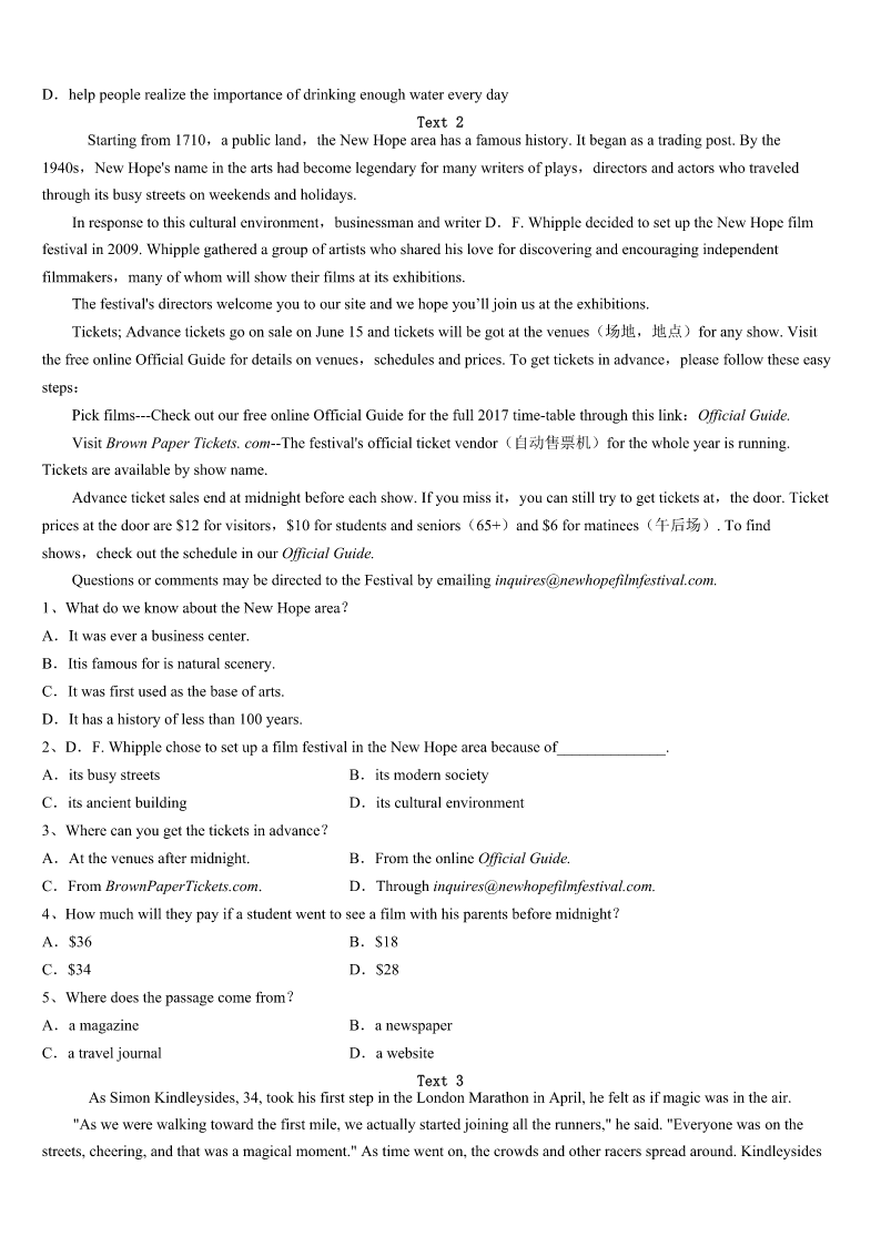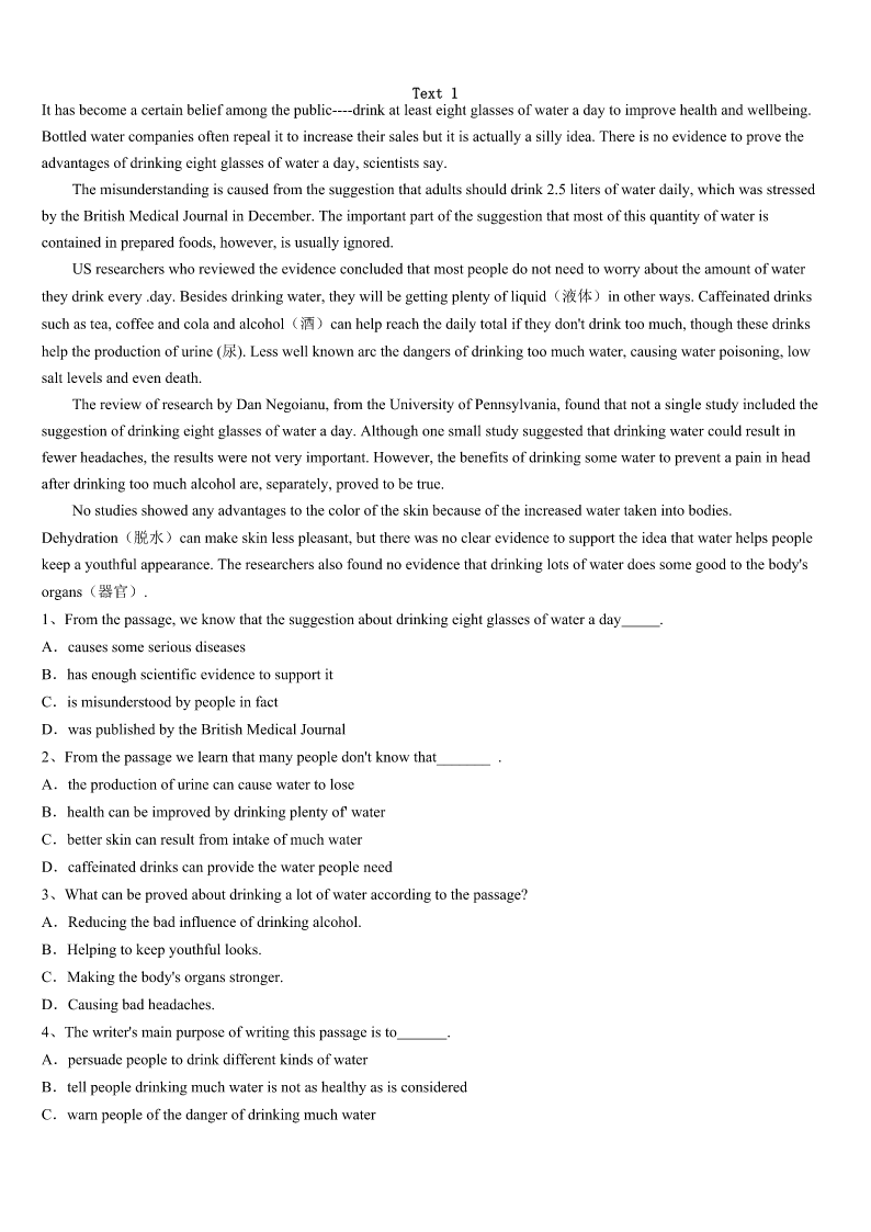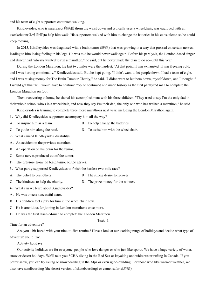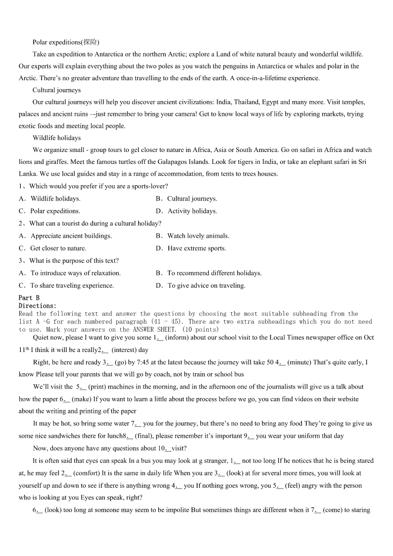 考研《英语一》青海省海北藏族自治州海晏县2023年模拟预测试卷 SectionIUseofEnglish Directions: Readthefollowingtext.Choosethebestword(s)foreachnumberedblankandmarkA,B,CorDonthe ANSWERSHEET.(10points) ThestoryofhowIgotmyjobwasafunnyone. Oneday,Iwas1alongastreettoaninterviewwhenayellowcarsuddenly2in.3anothercarcomingintheother4 ,Ihadtobrakehardand5anothercyclist.Webothfell,but6neitherofuswashurt.Ibecame7andcycledasfast aspossibletothedriveroftheyellowcartotellhimhowIconsideredhim.Itoldhimwhatabad8Ithoughthewasandthat hewasa(n)9tootherpeopleontheroad.Hisfaceturned10.Iwarnedhimnottodrive11inthefuturesothat everyoneelsecouldenjoyalonglife. Iwasintimeforthe12.Havingwalkedintotheroom,tomy13,Ifoundoneofthethreeinterviewers14tobethe driveroftheyellowcar.Welookedateachotherforawhile,15silent.ThenIdecidedtolook16thewholematterasa greatjoke!I17andtoldhimthatItalkedmuchthelasttimewemetandthatthistimeitwasturnforhimtotalkagreat deal.Lostinthoughtforawhile,he18thatIwasnotgoingtosayanythingabouthisbaddriving.Theinterviewwent19 .Twodayslater,Ireceivedaletterofferingmethejob.Iwaspleasedthatthemanager-thedriveroftheyellowcar,didn’t 20myrudenesstohim.Throughtheexperience,Ifindsomethingthatseemsimpossibleatfirstturnsouttobegood. 1、A.cyclingB.walkingC.runningD.driving 2、A.stoppedB.cutC.passedD.waited 3、A.AsB.ForC.WithD.By 4、A.conditionB.positionC.locationD.direction 5、A.knockedB.bumpedC.beatD.rushed 6、A.happilyB.unfortunatelyC.luckilyD.disappointedly 7、A.sorryB.excitedC.nervousD.angry 8、A.driverB.workerC.cyclistD.boss 9、A.pityB.idiotC.riskD.fool 10、A.blackB.whiteC.paleD.red 11、A.carelesslyB.carefullyC.slowlyD.patiently 12、A.jobB.interviewC.meetingD.appointment 13、A.excitementB.joyC.angerD.astonishment 14、A.happenedB.wantedC.seemedD.planned 15、A.makingB.keepingC.breakingD.stopping 16、A.upB.atC.onD.into 17、A.laughedB.excusedC.noddedD.calmed 18、A.hopedB.foundC.heardD.wished 19、A.fastB.terriblyC.wellD.slowly 20、A.realizeB.wantC.knowD.mind SectionIIReadingComprehension PartA Directions: Readthefollowingfourtexts.Answerthe