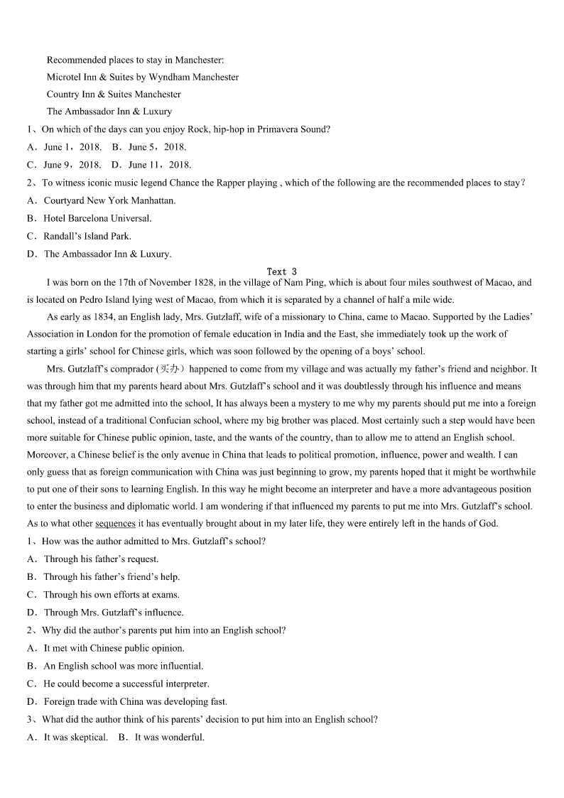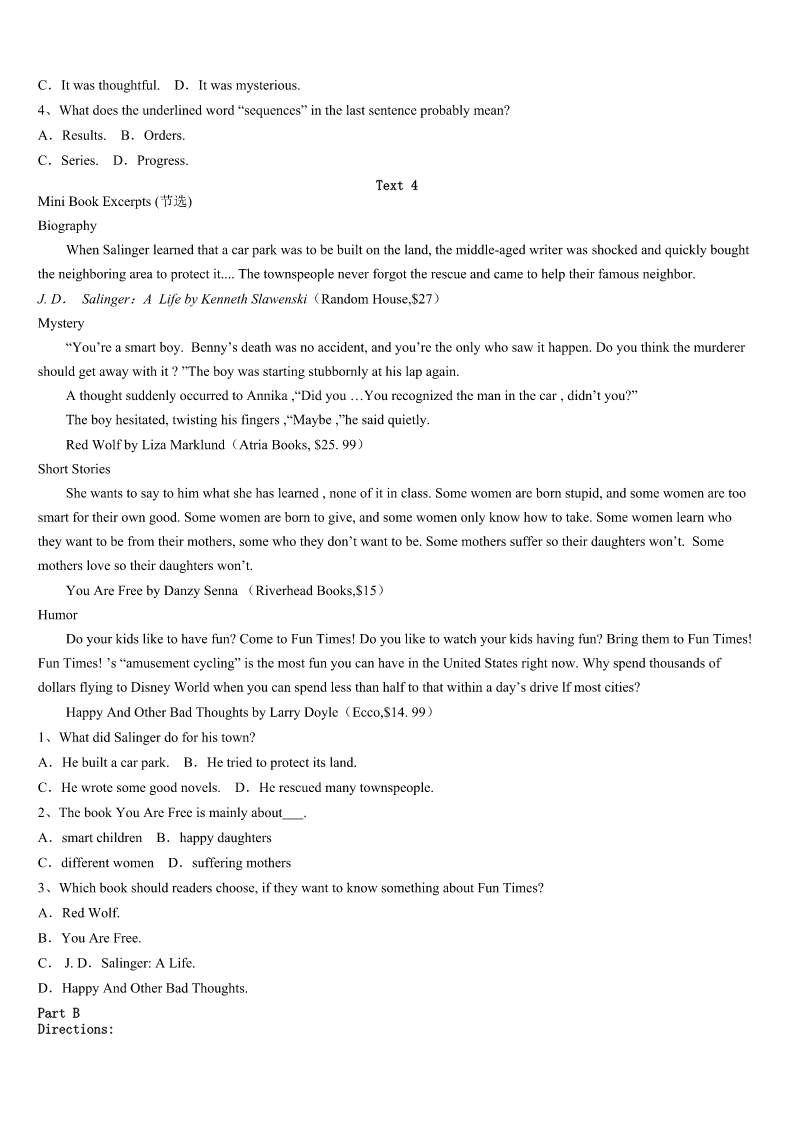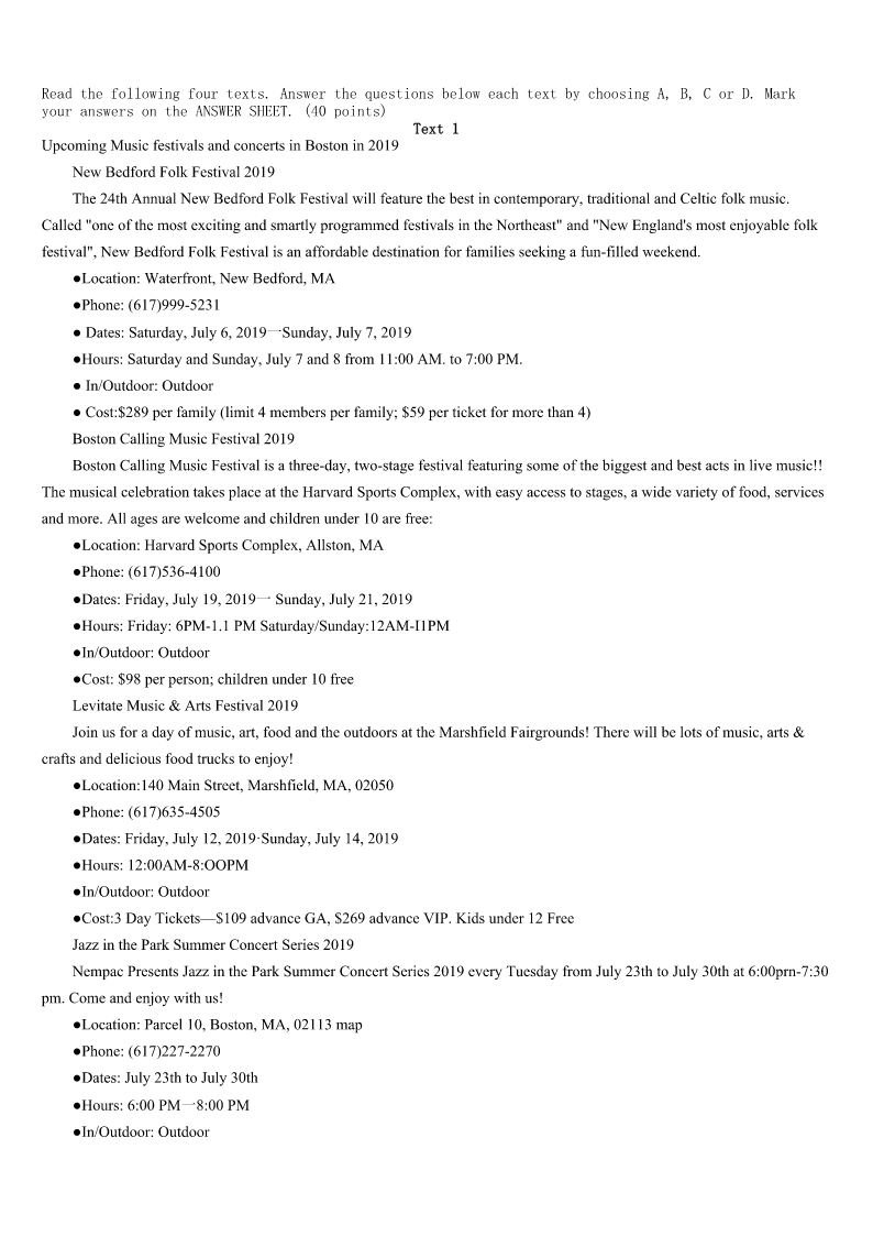 考研《英语一》高密市2023年高分冲刺试题 SectionIUseofEnglish Directions: Readthefollowingtext.Choosethebestword(s)foreachnumberedblankandmarkA,B,CorDonthe ANSWERSHEET.(10points) Igotanewpairofeyeglassesrecently.Becausestigmatism(去像散性)hadstartedto1withmy nearsightedness,makingthingsalittlebit2 Ithastakenmeseveraldaystogetusedtothenew3,Whileitwasgreatseeingclearlyata4againandwonderful beingableto5abookwithoutitbeinganinchfrommyface,thecombinationlenses(组合镜片)werea(n)6for me.TheproblemwasthatwheneverIwas7somethingfaraway,Ihadtokeepmyeyesup,8Iwouldgetawaveof blurriness(模糊)whenI9lookedthroughthereadingpartofthelenses.Iam10thatmyeyesarenowgettingusedto thenewglasses.Itisno11livinginanunclearworld.Ireally12thehelpofthenewglasses. Iamgratefulforthisnewpairofglassesforanotherreasontoo.Theyhavetaughtmea(n)13thatIwillholdcloseto myheartforever:Wheneveryou14toseetheroadaheadclearly,lookup!TooofteninmylifeIhavekepttheeyesofmy soullooking15totheground.WhenI16,theworldseemedlikeascary,unclear,anddepressingplace.WhenI raisedthoseeyes,though,my17alwaysbecameclear.IsawthatlifeisgoodandwhenIhelpothers,Imakeiteven18 .Isawthatnomatterwhateachdaymaythrowatme,Ican19itwithalovingheartandajoyfulspirit.Wheneveryourlife seems20oroverwhelming,justlookup! 1、A.battleB.compareC.dealD.mix 2、A.unusualB.impracticalC.unclearD.impossible 3、A.cultureB.pairC.temperatureD.house. 4、A.distanceB.lengthC.speedD.rate 5、A.pickB.printC.translateD.read 6、A.experimentB.forceC.challengeD.choice 7、A.listeningtoB.talkingaboutC.thinkingofD.lookingat 8、A.otherwiseB.howeverC.thereforeD.meanwhile 9、A.eventuallyB.accidentally.C.unfortunatelyD.gradually 10、A.gladB.awareC.certainD.proud 11、A.useB.funC.doubtD.wonder 12、A.wantB.offerC.appreciateD.refuse 13、A.truthB.wayC.effectD.language 14、A.regretB.manageC.agreeD.need 15、A.forwardB.aroundC.downD.back 16、A.didB.admittedtoC.finishedD.left 17、A.interestB.viewC.prejudiceD.ability 18、A.slowerB.saferC.easierD.better 19、A.loseB.pushC.faceD.remember 20、A.excitingB.frighteningC.meaningfulD.peaceful Se