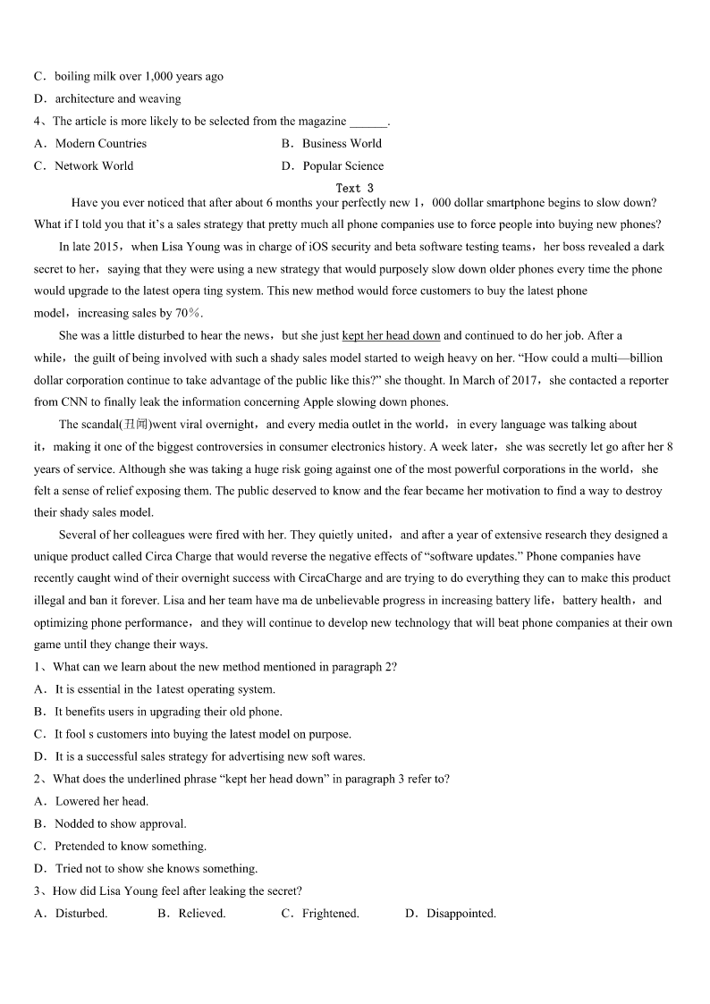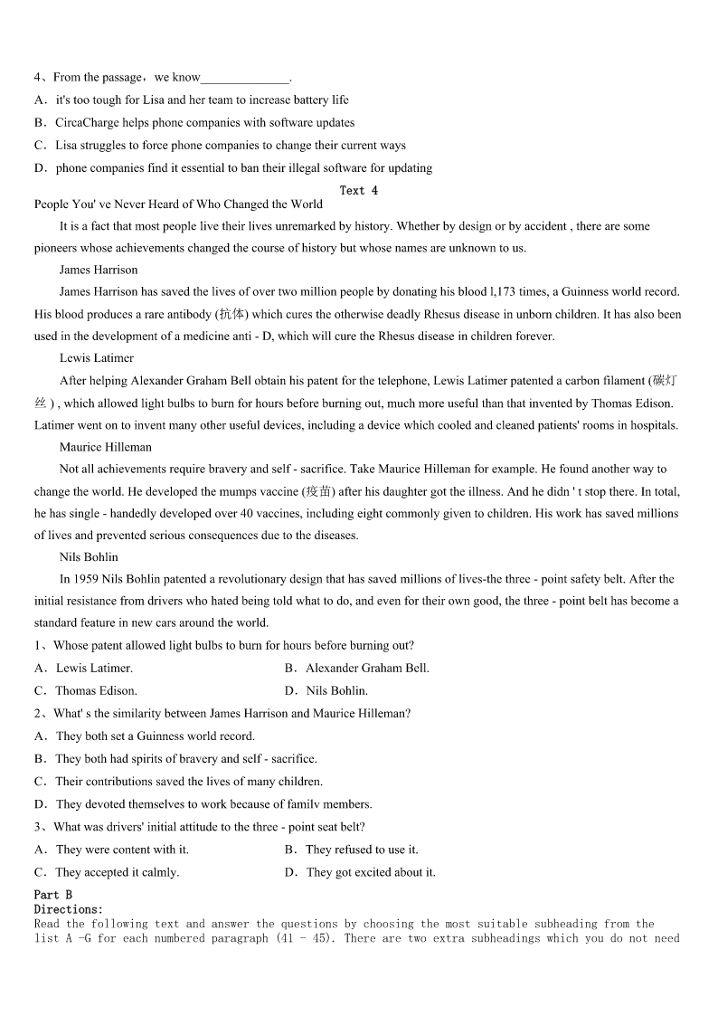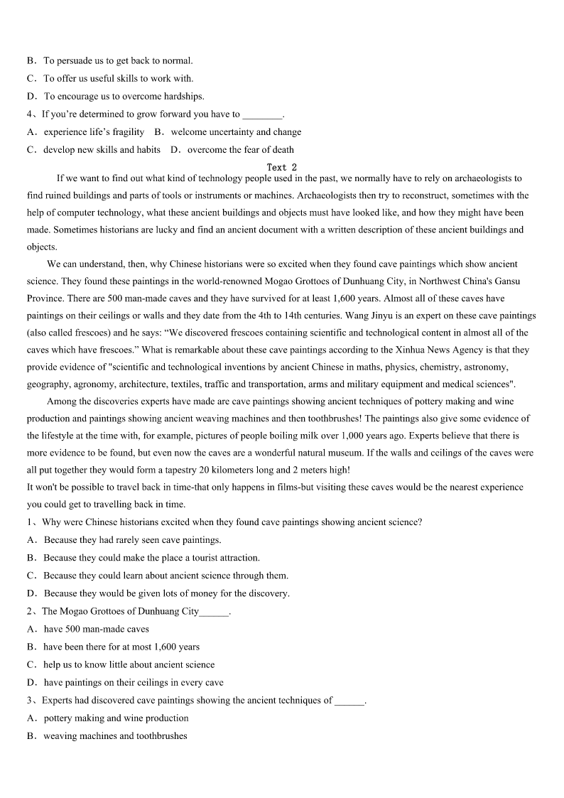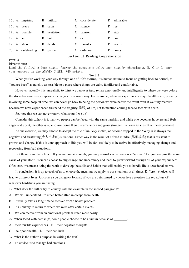 考研《英语一》海南省海口市美兰区2023年巅峰冲刺试卷 SectionIUseofEnglish Directions: Readthefollowingtext.Choosethebestword(s)foreachnumberedblankandmarkA,B,CorDonthe ANSWERSHEET.(10points) Myhusbandkissedmegoodbye,stroke(轻抚)thebaby’scheekandthenrushedoutofthedoor,intohisbusyday.With thecoldofthemorningfading,Ifedmybabyanditfellfastasleep.UsuallyIwouldplaceitinbedandquicklyhavethehouse somewhatin1. However,thismorning,Istayedseated,just2,withthebabyinmyarms.Thethoughtsraninto3ofthemornings withmyhusband,afatherrushingoutofthedoortomeettheobligationsoflife.Itwasonlyasmalljumptothoughtsofmy own4. MymotherpassedawaywhenIwasten,andasIlooked5,Icouldseehowmuchofafamilymanmydadwas.He wenttoworkeverymorningand6tohisfamilyeveryevening.He7food,clothing,warmth,andprotection.Hewasa faithfulfather. Settingthebabydown,Idialedthe8number.Ihadjustrealizedthe9oftheordinary-thedailylifegoingon aroundusthatweoftentookforgranted,andthatitneededtobe10. “Hi,Dad.”Isaid,11backtears. “Hey,Bud.Howareyou?”12wasinhisvoice. “Fine,I’mjustcallingtosay…thankyou.”Igotitoutbeforemythroat13toomuchformetospeak. “Whatfor?” “Forgettingupandgoingtoworkeverymorningofmylife.NowthatIhavemyown14andIseemyhusbanddoing thesame,Ijustwantedtothankyouforbeing15.” Therewas16foramomentasmydadcomposedhimself,andwithasmall17inhisvoicehesaid,“You’re welcome,Bud.” Idon’tremembermuchoftherestofthecall,18thatmomentofrevelation(显露)aboutmyfather,Iwillneverforget. Therearethosewhoareknownfortheirheroic19,andalsothosewhoareknownfortheirfortunesandfame,butitisthe 20everydayfatherswhoarethetrueheroes.I’mthankfulthatmyfatherwasoneofthem. 1、A.useB.lineC.orderD.fashion 2、A.thinkingB.dreamingC.imaginingD.praying 3、A.conversationsB.strugglesC.incidentsD.memories 4、A.babyB.husbandC.motherD.father 5、A.outB.awayC.backD.around 6、A.movedB.returnedC.escapedD.walked 7、A.providedB.collectedC.soughtD.bought 8、A.popularB.relativeC.regularD.familiar 9、A.differenceB.significanceC.balanceD.absence 10、A.recognizedB.arrangedC.reducedD.achieved 11、A.sendingB.pushingC.holdi