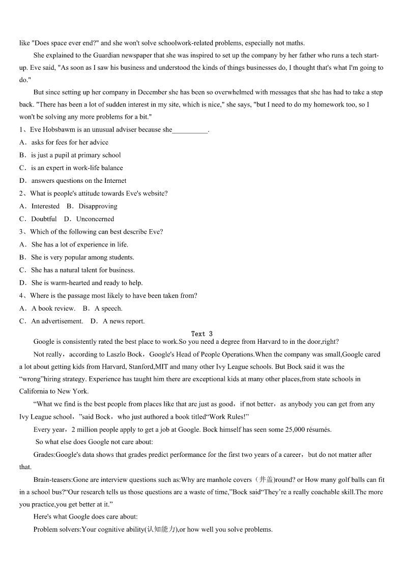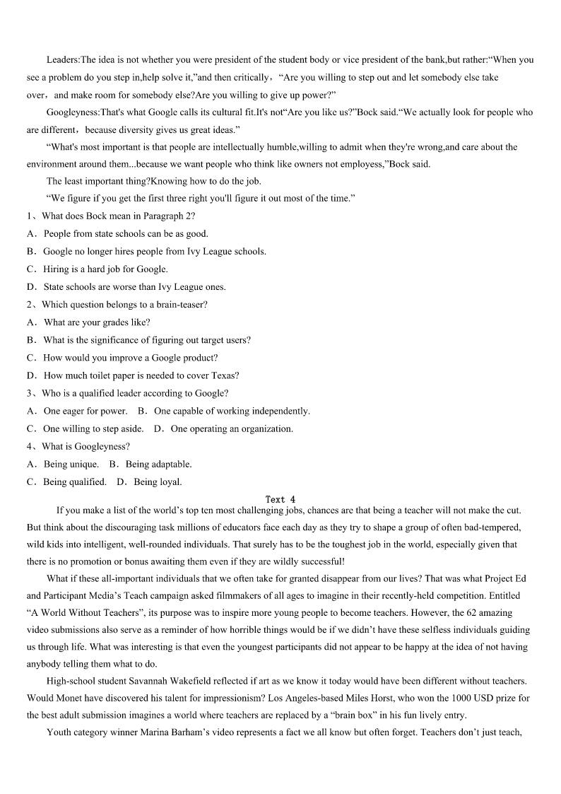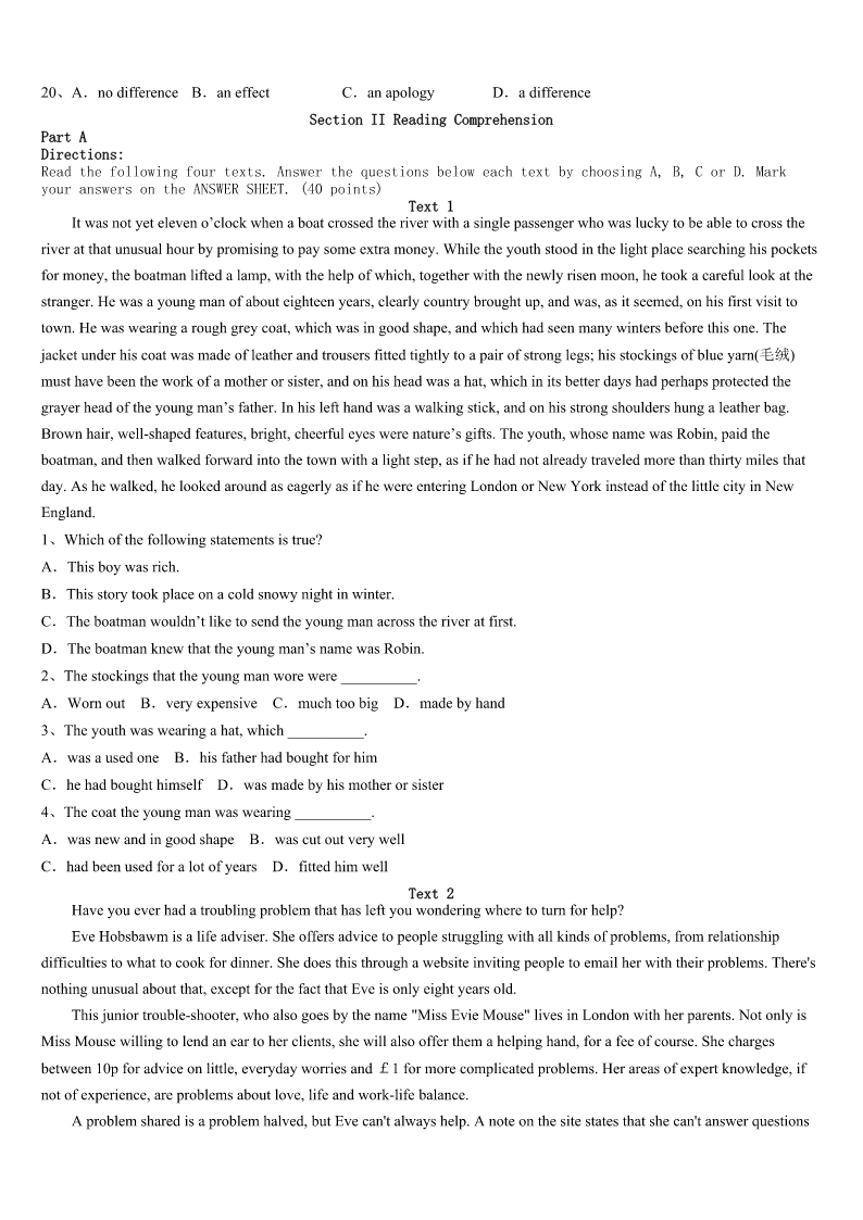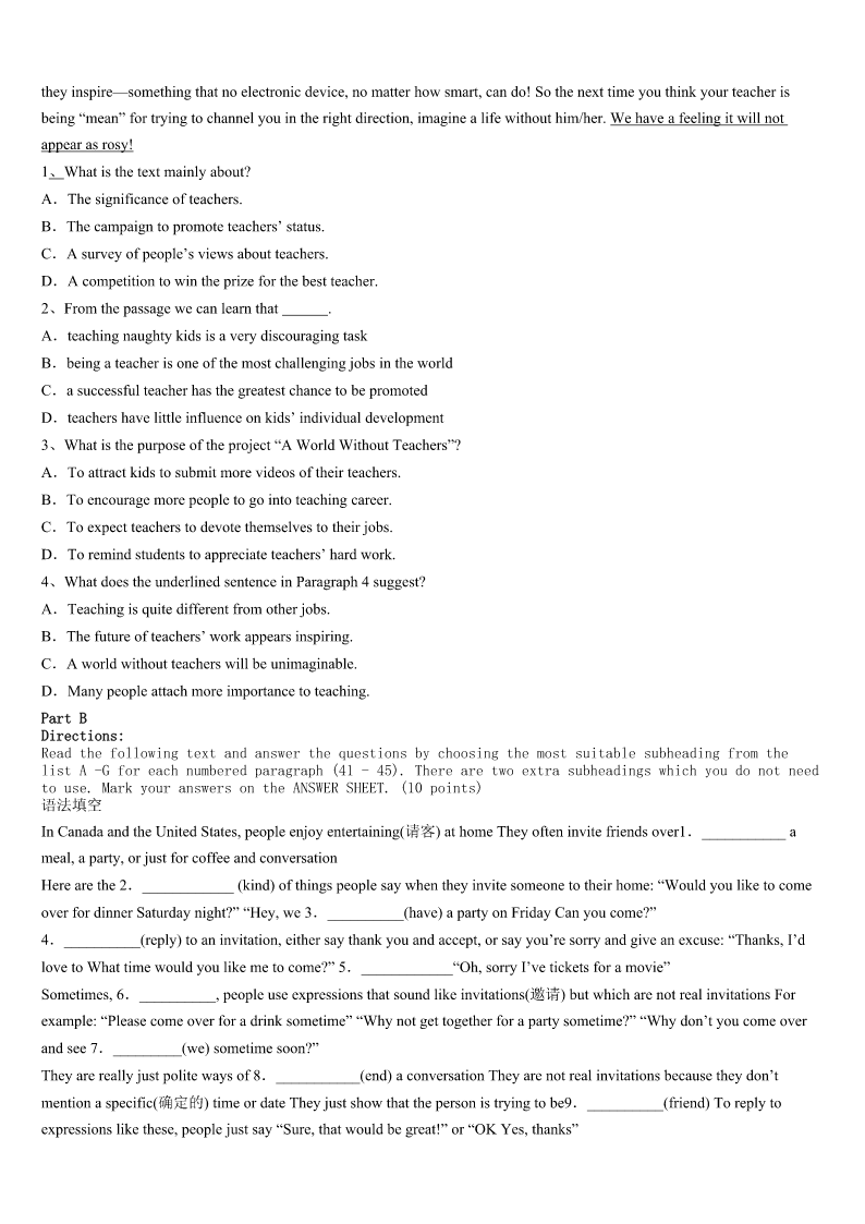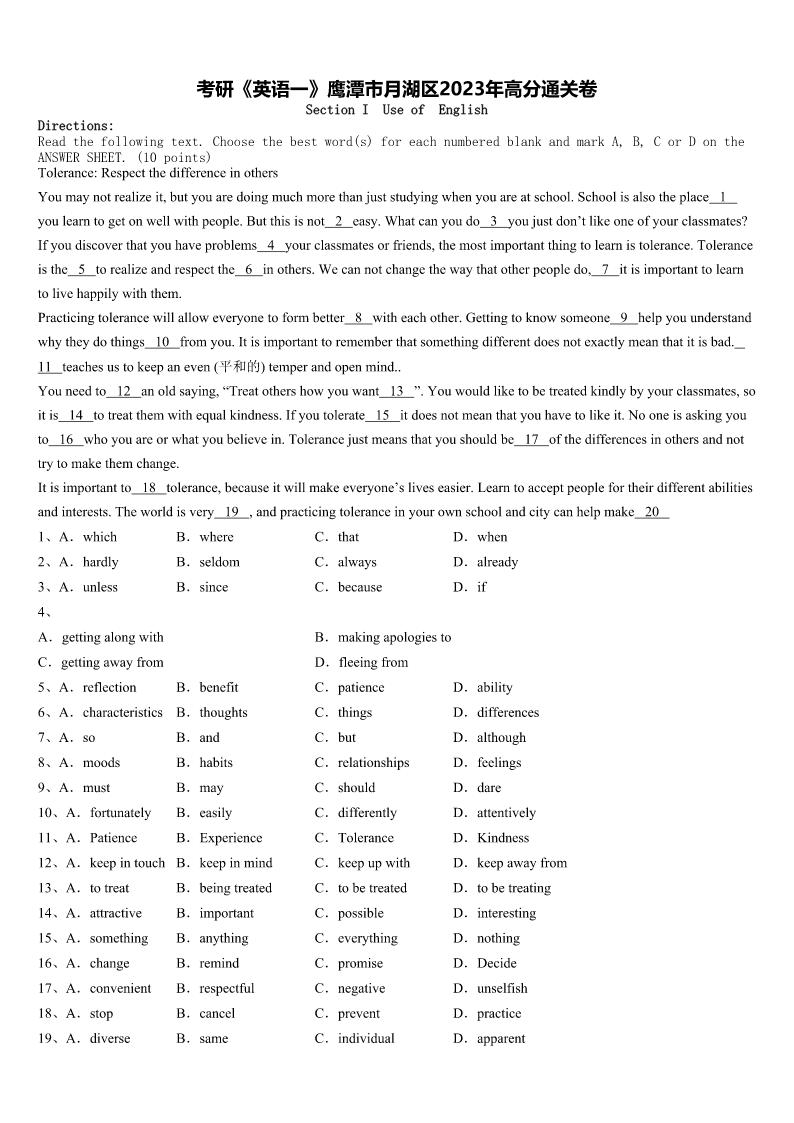 考研《英语一》鹰潭市月湖区2023年高分通关卷 SectionIUseofEnglish Directions: Readthefollowingtext.Choosethebestword(s)foreachnumberedblankandmarkA,B,CorDonthe ANSWERSHEET.(10points) Tolerance:Respectthedifferenceinothers Youmaynotrealizeit,butyouaredoingmuchmorethanjuststudyingwhenyouareatschool.Schoolisalsotheplace1 youlearntogetonwellwithpeople.Butthisisnot2easy.Whatcanyoudo3youjustdon’tlikeoneofyourclassmates? Ifyoudiscoverthatyouhaveproblems4yourclassmatesorfriends,themostimportantthingtolearnistolerance.Tolerance isthe5torealizeandrespectthe6inothers.Wecannotchangethewaythatotherpeopledo,7itisimportanttolearn tolivehappilywiththem. Practicingtolerancewillalloweveryonetoformbetter8witheachother.Gettingtoknowsomeone9helpyouunderstand whytheydothings10fromyou.Itisimportanttorememberthatsomethingdifferentdoesnotexactlymeanthatitisbad. 11teachesustokeepaneven(平和的)temperandopenmind.. Youneedto12anoldsaying,“Treatothershowyouwant13”.Youwouldliketobetreatedkindlybyyourclassmates,so itis14totreatthemwithequalkindness.Ifyoutolerate15itdoesnotmeanthatyouhavetolikeit.Nooneisaskingyou to16whoyouareorwhatyoubelievein.Tolerancejustmeansthatyoushouldbe17ofthedifferencesinothersandnot trytomakethemchange. Itisimportantto18tolerance,becauseitwillmakeeveryone’sliveseasier.Learntoacceptpeoplefortheirdifferentabilities andinterests.Theworldisvery19,andpracticingtoleranceinyourownschoolandcitycanhelpmake20 1、A.whichB.whereC.thatD.when 2、A.hardlyB.seldomC.alwaysD.already 3、A.unlessB.sinceC.becauseD.if 4、 A.gettingalongwithB.makingapologiesto C.gettingawayfromD.fleeingfrom 5、A.reflectionB.benefitC.patienceD.ability 6、A.characteristicsB.thoughtsC.thingsD.differences 7、A.soB.andC.butD.although 8、A.moodsB.habitsC.relationshipsD.feelings 9、A.mustB.mayC.shouldD.dare 10、A.fortunatelyB.easilyC.differentlyD.attentively 11、A.PatienceB.ExperienceC.ToleranceD.Kindness 12、A.keepintouchB.keepinmindC.keepupwithD.keepawayfrom 13、A.totreatB.beingtreatedC.tobetreatedD.tobetreating 14、A.attractiveB.importantC.possibleD.in