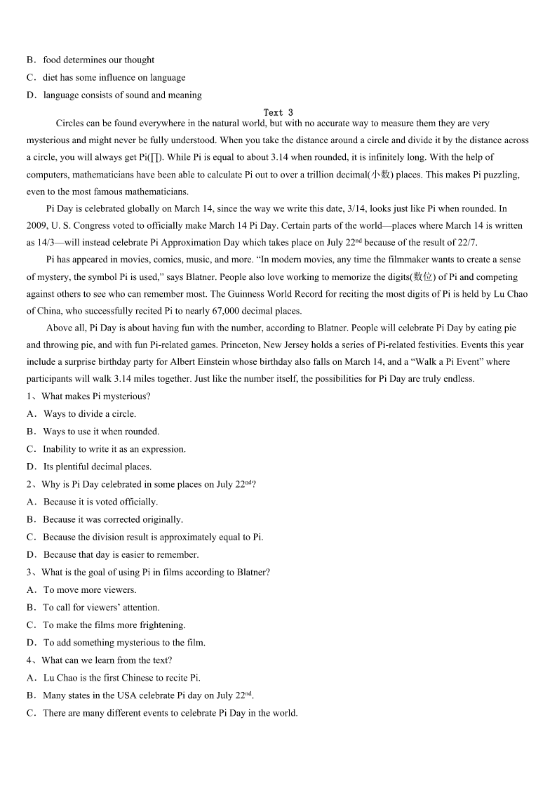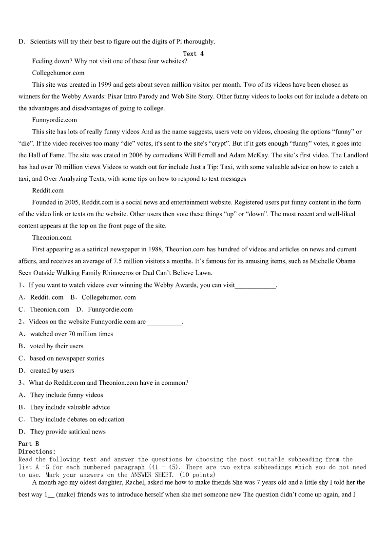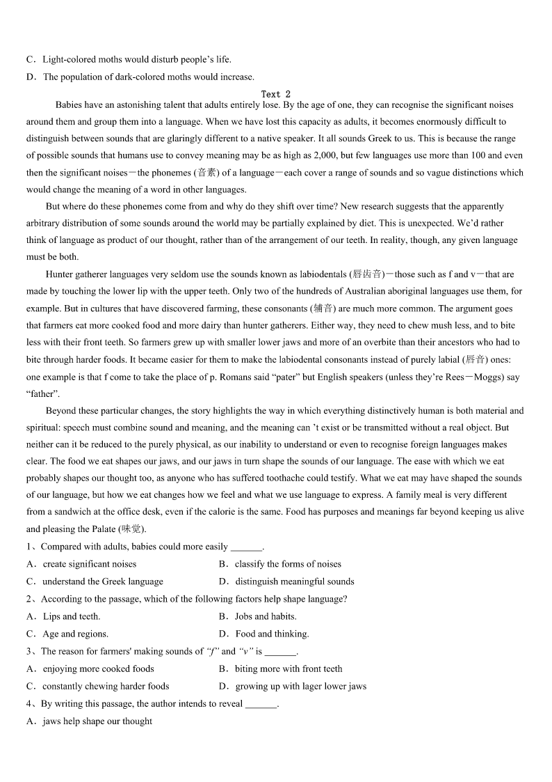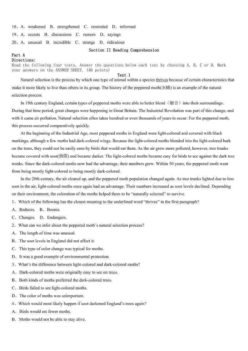 考研《英语一》浙江省铜陵市2023年高分通关卷 SectionIUseofEnglish Directions: Readthefollowingtext.Choosethebestword(s)foreachnumberedblankandmarkA,B,CorDonthe ANSWERSHEET.(10points) GrandmaisninetythisChristmas.Irememberoncevisitingher,cryingwhenmybigsistertoldme“ThereisnoSanta Claus!”,becauseIknewshealwaystoldthe1. “NoSantaClaus?”shesnorted(哼着说).“Ridiculous!Don’t2it.Thatrumorhasbeengoingaroundforyears.Now,put onyourcoat,andlet’sgo.” “Go?Gowhere,Grandma?”Iasked. “Where”3tobeKerby’sGeneralStore.Aswewalkedin,Grandma4metwentydollars.“Takethemoney,”she said,“andbuysomethingforsomeonewhoneedsit.I’llwaitforyououtdoors.” Iwasonlyeightyearsold,andhadnevershoppedforanything5.ForafewmomentsIjuststoodthere,6,wondering whattobuy,and7onearthtobuyitfor. IthoughtofeverybodyIknew:myfamily,friends,classmates...SuddenlyIthoughtofBobbie,akidsittingbehindmeinthe classroom.Hedidn’thavea8;heneverwentoutduringthewinter.Iheldthebill9.IwouldbuyBobbieacoat.Isawared onewithahattoit.Itlookedreally10.Hewouldlikethat. That11,GrandmahelpedmewrapthecoatinChristmaspaperandwrite,“ToBobbie,From12”onit.Thenshedrove metoBobbie’shouse.Grandma13downthestreet,andwehidinthebushesbyhisfrontwalk.ThenGrandmapushedme gently.“Allright,SantaClaus,getgoing!”she14. Itookadeepbreath,15forhisfrontdoor,threwthe16down,ranghisdoorbellandflewback.Togetherwewaited 17inthedarknessforthefrontdoortoopen.Finallyitdid,andtherestoodBobbie. Fortyyearshaven’t18thethrillofthosemoments.Thatnight,Irealizedthoseawful19aboutSantaClauswerejust whatGrandmasaid:theywere20.Santawasaliveandwell,andwewereonhisteam. 1、A.storyB.truthC.jokeD.lie 2、A.believeB.ignoreC.suspectD.admit 3、A.seemedB.supposedC.provedD.imagined 4、A.borrowedB.deliveredC.threwD.handed 5、A.aloneB.lonelyC.specialD.expensive 6、A.boredB.depressedC.frightenedD.confused 7、A.whenB.howC.whoD.what 8、A.moneyB.coatC.friendD.hat 9、A.excitedlyB.nervouslyC.anxiouslyD.thoughtfully 10、A.newB.warmC.cheapD.beautiful 11、A.morningB.weekendC.eveningD.afternoon 12、A.GrandmaB.classmatesC.friendsD.SantaClaus 13、A