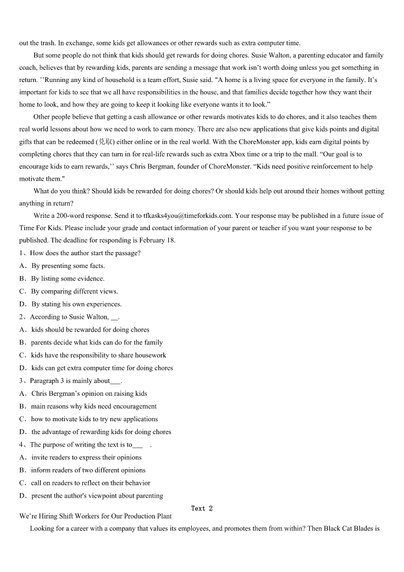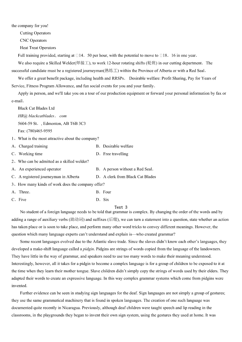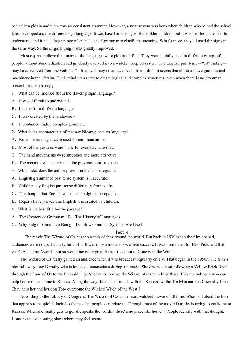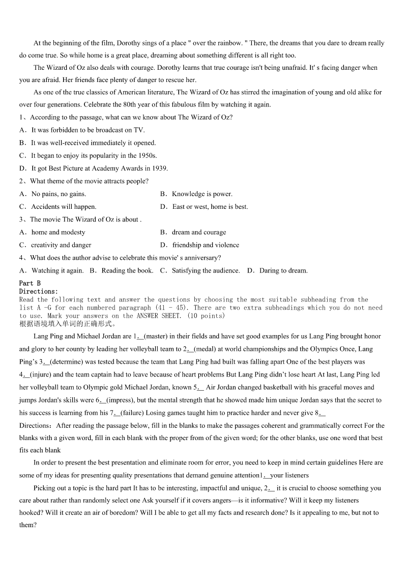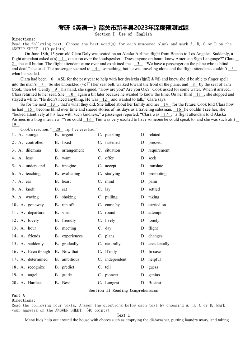 考研《英语一》韶关市新丰县2023年深度预测试题 SectionIUseofEnglish Directions: Readthefollowingtext.Choosethebestword(s)foreachnumberedblankandmarkA,B,CorDonthe ANSWERSHEET.(10points) OnJune18th,15-year-oldClaraDalywasseatedonanAlaskaAirlinesflightfromBostontoLosAngeles.Suddenly,a flightattendantaskeda(n)1questionovertheloudspeaker:“DoesanyoneonboardknowAmericanSignLanguage?”Clara 2thecallbutton.Theflightattendantcameoverandexplainedthe3.“Wehaveapassengerontheplanewhoisblind anddeaf,”shesaid.Thepassengerseemedto4something,buthewastravelingaloneandtheflightattendantscouldn’t5 whatheneeded. Clarahadbeen6ASLforthepastyeartohelpwithherdyslexia(诵读困难)andknewshe’dbeabletofingerspell intotheman’s7.Sosheunbuckled(松开)herseatbelt,walkedtowardthefrontoftheplane,and8bytheseatofTim Cook,then64.Gently9hishand,shesigned,“Howareyou?AreyouOK?”Cookaskedforsomewater.Whenitarrived, Clarareturnedtoherseat.She10againabitlaterbecausehewantedtoknowthetime.Onherthird11,shestoppedand stayedawhile.“Hedidn’tneedanything.Hewas12andwantedtotalk,”Clarasays. Soforthenext13,that’swhattheydid.Shetalkedaboutherfamilyandher14forthefuture.CooktoldClarahow hehad15becomeblindovertimeandsharedstoriesofhisdaysasatravelingsalesman.16hecouldn’tseeher,she “lookedattentivelyathisfacewithsuchkindness,”apassengerreported.“Clarawas17,”aflightattendanttoldAlaska Airlinesinabloginterview.“Youcould18Timwasveryexcitedtohavesomeonehecouldspeakto,andshewassucha(n) 19.” Cook’sreaction:“20tripI’veeverhad.” 1、A.strangeB.urgentC.puzzlingD.related 2、A.controlledB.fixedC.fastenedD.pressed 3、A.dilemmaB.arrangementC.situationD.requirement 4、A.loseB.wantC.offerD.seek 5、A.understandB.imagineC.acceptD.translate 6、A.teachingB.evaluatingC.studyingD.promoting 7、A.earB.heartC.mindD.palm 8、A.kneltB.satC.layD.settled 9、A.wavingB.shakingC.pullingD.taking 10、A.gotawayB.ranoffC.camebyD.carriedon 11、A.departureB.visitC.roundD.attempt 12、A.lovelyB.friendlyC.livelyD.lonely 13、A.hourB.meetingC.dayD.flight 14、A.friendsB.experiencesC.plansD.changes 15、A.suddenlyB.gr