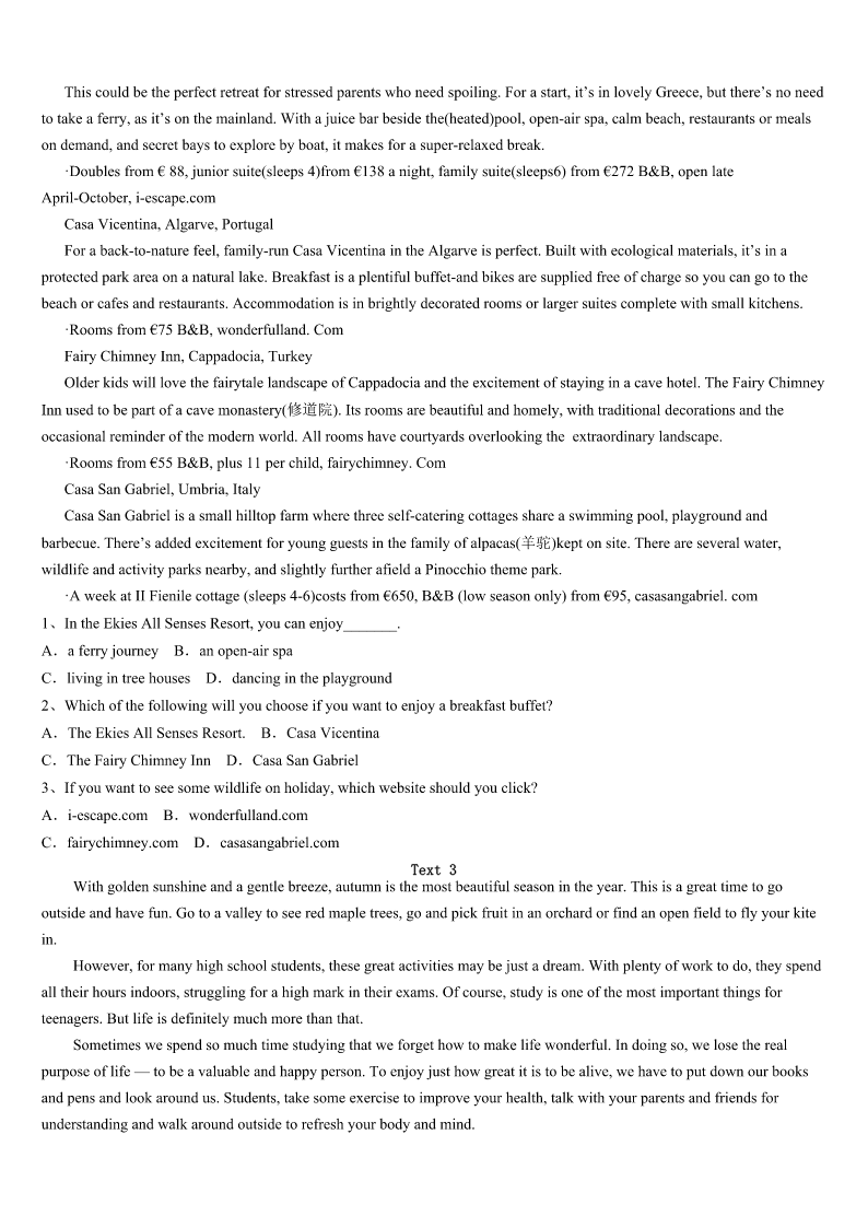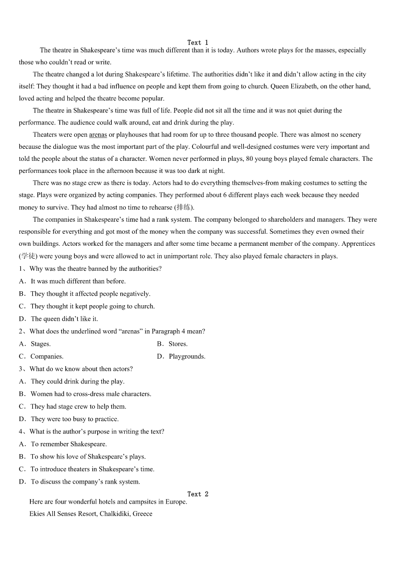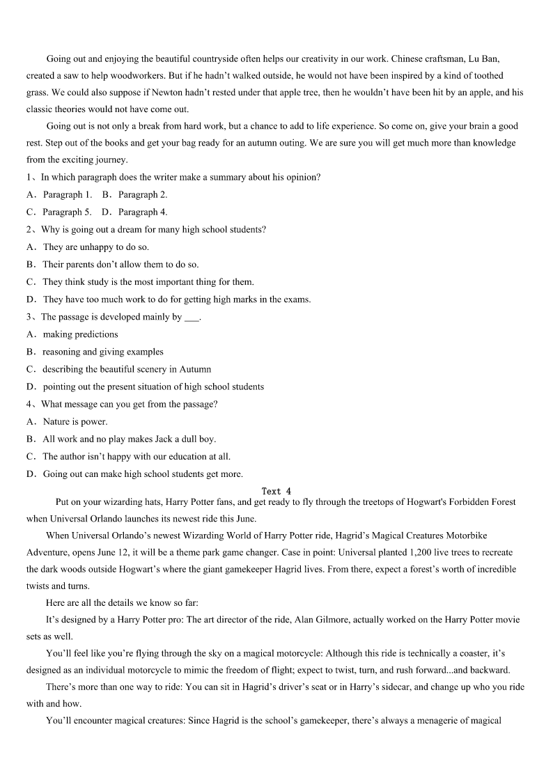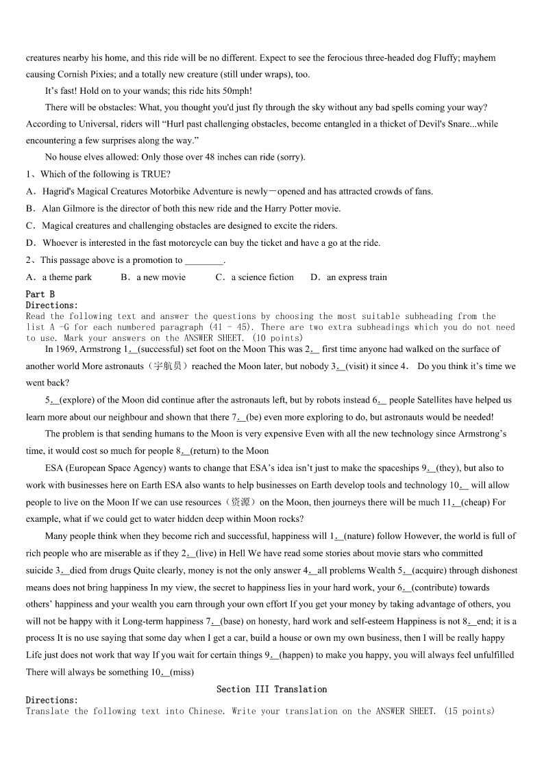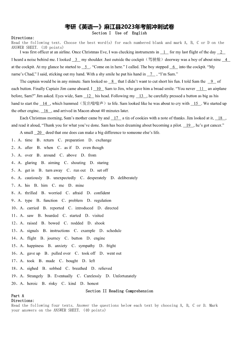 考研《英语一》麻江县2023年考前冲刺试卷 SectionIUseofEnglish Directions: Readthefollowingtext.Choosethebestword(s)foreachnumberedblankandmarkA,B,CorDonthe ANSWERSHEET.(10points) Iwasfirstofficeratanairline.OnceChristmasEve,Iwascheckinginstrumentsin1formylastflightoftheday2 Iheardanoisebehindme.Ilooked3myshoulder.Justoutsidethecockpit(驾驶舱)doorwaywasaboyofaboutnine4 atthecockpit.Atmyglancehestartedto5.“Comeoninhere.”Icalled.Theboystepped6intothecockpit.“My name’sChad,”Isaid,stickingoutmyhand.Withashysmileheputhishandin7,“I’mSam.” Thecaptainwouldbeinanyminute.Samlookedso8thatIdidn’twanttocutshorthisfun.ItoldSamthe9of eachbutton.FinallyCaptainJimcameaboard.I10SamtoJim,whogavehimabroadsmile.“Younever11anairplane before,Sam?”Jimasked.Eyeswide,Sam12hishead.Followingmy13,hecarefullypressedabuttonasbigashis handtostartthe14,whichhummed(发出嗡嗡声)tolife.Samlookedlikehewasabouttocrywith15.Westartedup theotherengine,16,andarrivedinMaconabout40minuteslater. EachChristmasmorning,Sam’smothercamebyand17atinofcookieswithanoteofthanks.Jimlookedatit,18, andreaditaloud,“Thankyouforwhatyou’vedone.Samhasbeendreamingaboutbecomingapilot.19,he’sgotcancer.” Asmall20deedthatonedoescanmakeabigdifferencetosomeoneelse’slife. 1、A.timeB.returnC.preparationD.exchange 2、A.afterB.whenC.asifD.eventhough 3、A.overB.aroundC.aboveD.from 4、A.glaringB.aimingC.shoutingD.staring 5、A.getinB.turnawayC.runoutD.setoff 6、A.cautiouslyB.unexpectedlyC.desperatelyD.deliberately 7、A.hisB.himC.meD.mine 8、A.thrilledB.worriedC.afraidD.confident 9、A.typeB.functionC.problemD.regulation 10、A.carriedB.reportedC.introducedD.directed 11、A.sawB.boardedC.startedD.visited 12、A.raisedB.bowedC.noddedD.shook 13、A.signalsB.instructionsC.exampleD.schedule 14、A.flightB.journeyC.buttonD.engine 15、A.happinessB.anxietyC.sympathyD.fright 16、A.gaveupB.pulledoverC.tookoffD.wentout 17、A.tookB.madeC.boughtD.left 18、A.sighedB.sobbedC.breathedD.relieved 19、A.StrangelyB.EventuallyC.CarelesslyD.Unfortunately 20、A.heroicB.riskyC.kindD.honest SectionIIReadingComprehension