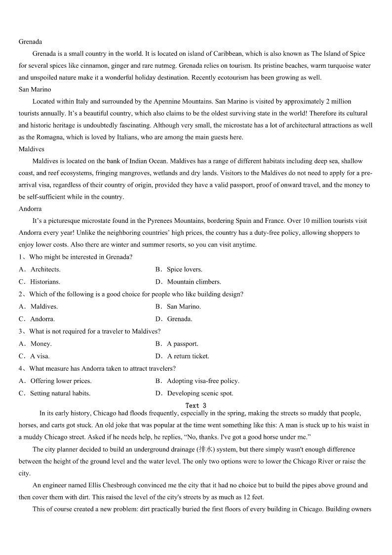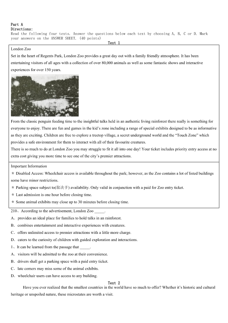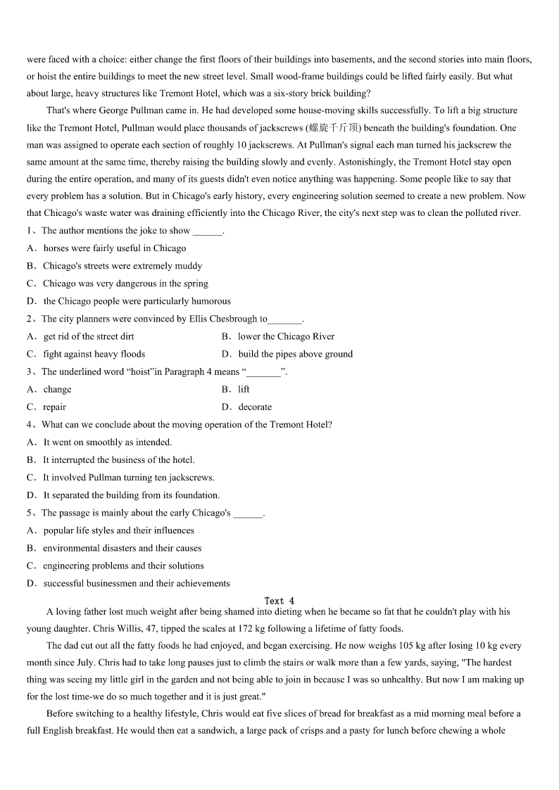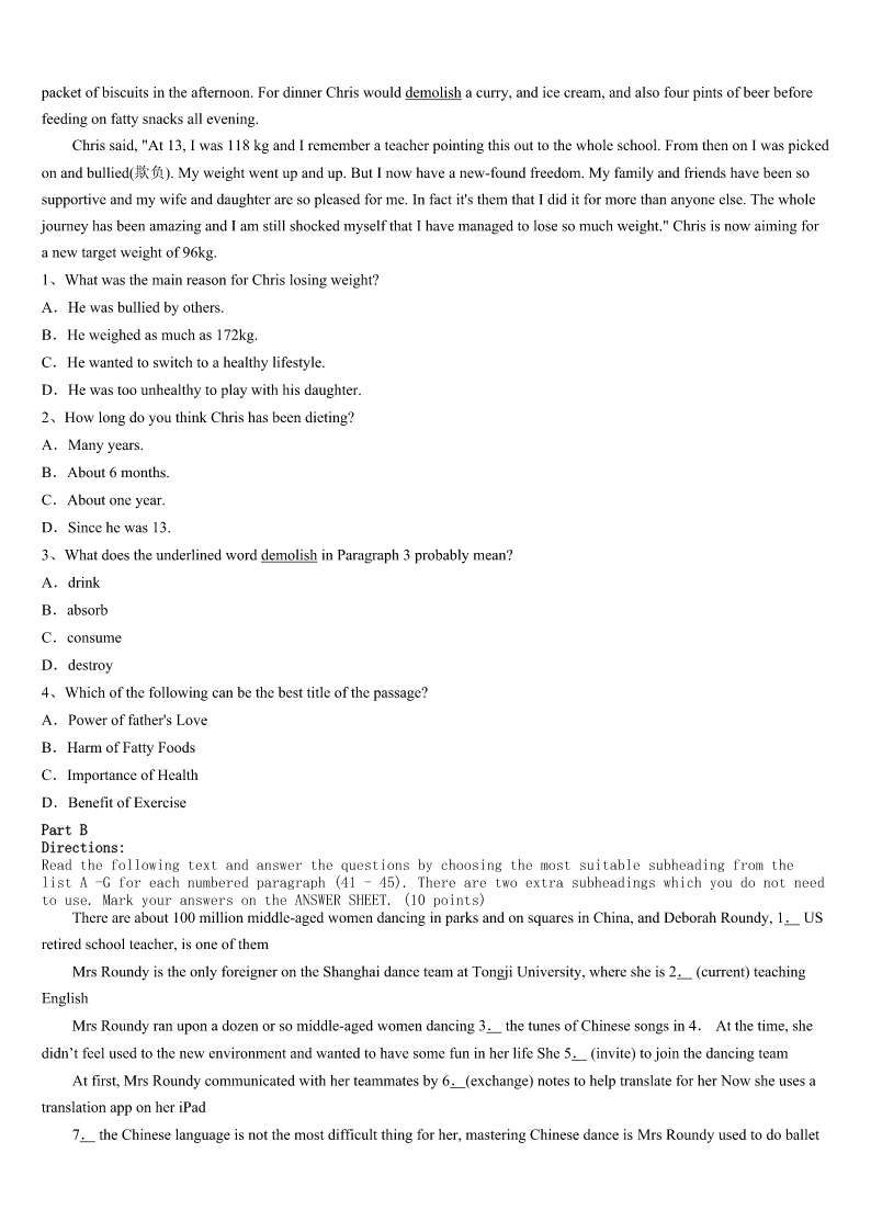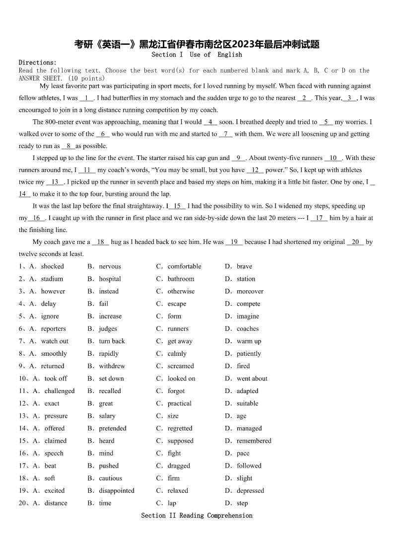 考研《英语一》黑龙江省伊春市南岔区2023年最后冲刺试题 SectionIUseofEnglish Directions: Readthefollowingtext.Choosethebestword(s)foreachnumberedblankandmarkA,B,CorDonthe ANSWERSHEET.(10points) Myleastfavoritepartwasparticipatinginsportmeets,forIlovedrunningbymyself.Whenfacedwithrunningagainst fellowathletes,Iwas1.Ihadbutterfliesinmystomachandthesuddenurgetogotothenearest2.Thisyear,3,Iwas encouragedtojoininalongdistancerunningcompetitionbymycoach. The800-metereventwasapproaching,meaningthatIwould4soon.Ibreatheddeeplyandtriedto5myworries.I walkedovertosomeofthe6whowouldrunwithmeandstartedto7withthem.Wewerealllooseningupandgetting readytorunas8aspossible. Isteppeduptothelinefortheevent.Thestarterraisedhiscapgunand9.Abouttwenty-fiverunners10.Withthese runnersaroundme,I11mycoach’swords,“Youmaybesmall,butyouhave12power.”So,Ikeptupwithathletes twicemy13.Ipickeduptherunnerinseventhplaceandbasedmystepsonhim,makingitalittlebitfaster.Onebyone,I 14tomakeittothetopfour,burstingaroundthelap. Itwasthelastlapbeforethefinalstraightaway.I15Ihadthepossibilitytowin.SoIwidenedmysteps,speedingup my16.Icaughtupwiththerunnerinfirstplaceandweranside-by-sidedownthelast20meters---I17himbyahairat thefinishingline. Mycoachgavemea18hugasIheadedbacktoseehim.Hewas19becauseIhadshortenedmyoriginal20by twelvesecondsatleast. 1、A.shockedB.nervousC.comfortableD.brave 2、A.stadiumB.hospitalC.bathroomD.station 3、A.howeverB.insteadC.otherwiseD.moreover 4、A.delayB.failC.escapeD.compete 5、A.ignoreB.increaseC.formD.imagine 6、A.reportersB.judgesC.runnersD.coaches 7、A.watchoutB.turnbackC.getawayD.warmup 8、A.smoothlyB.rapidlyC.calmlyD.patiently 9、A.returnedB.withdrewC.screamedD.fired 10、A.tookoffB.setdownC.lookedonD.wentabout 11、A.challengedB.recalledC.forgotD.adapted 12、A.exactB.greatC.practicalD.suitable 13、A.pressureB.salaryC.sizeD.age 14、A.offeredB.pretendedC.regrettedD.managed 15、A.claimedB.heardC.supposedD.remembered 16、A.speechB.mindC.fightD.pace 17、A.beatB.pushedC.draggedD.followed 18、A.softB.cautiousC.firmD.slight 19、A.excitedB.d
