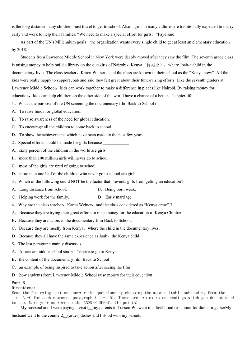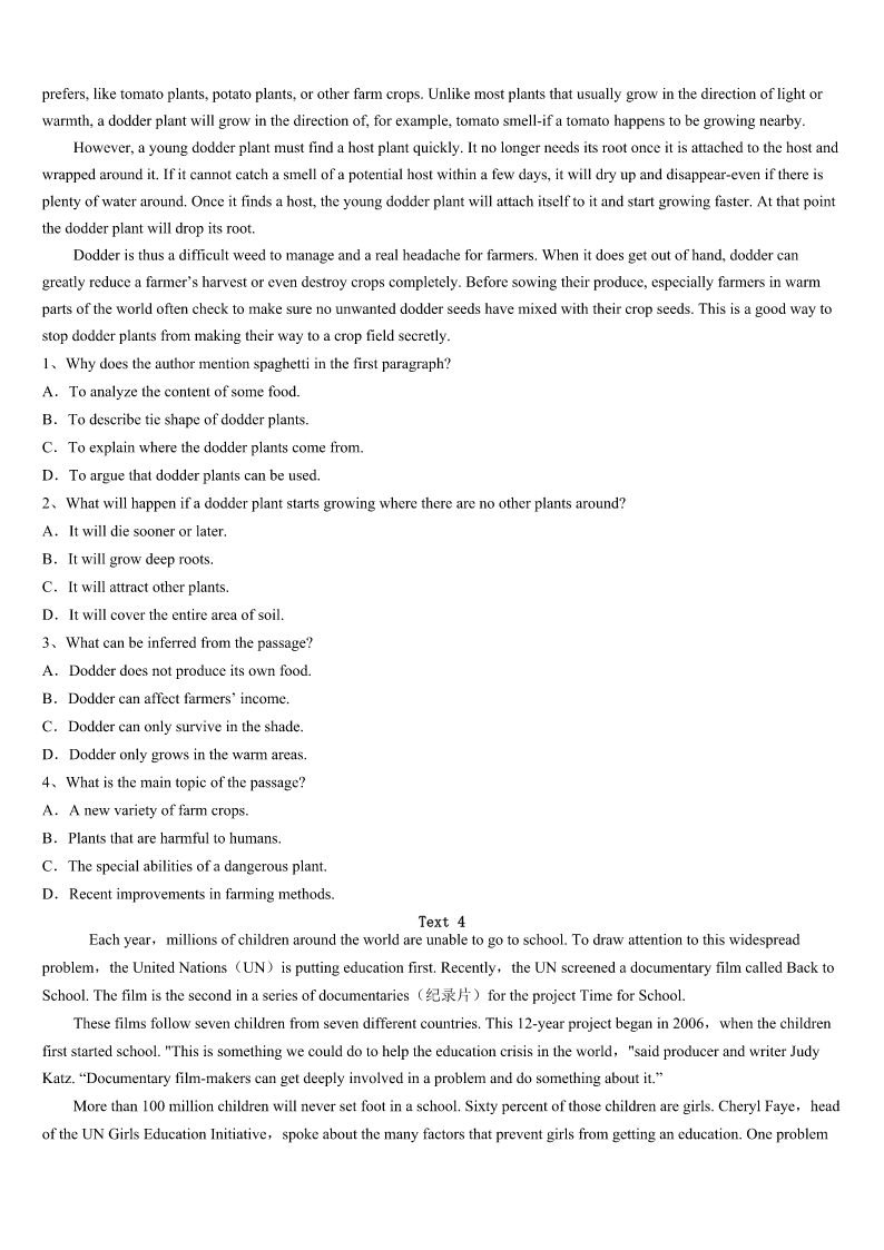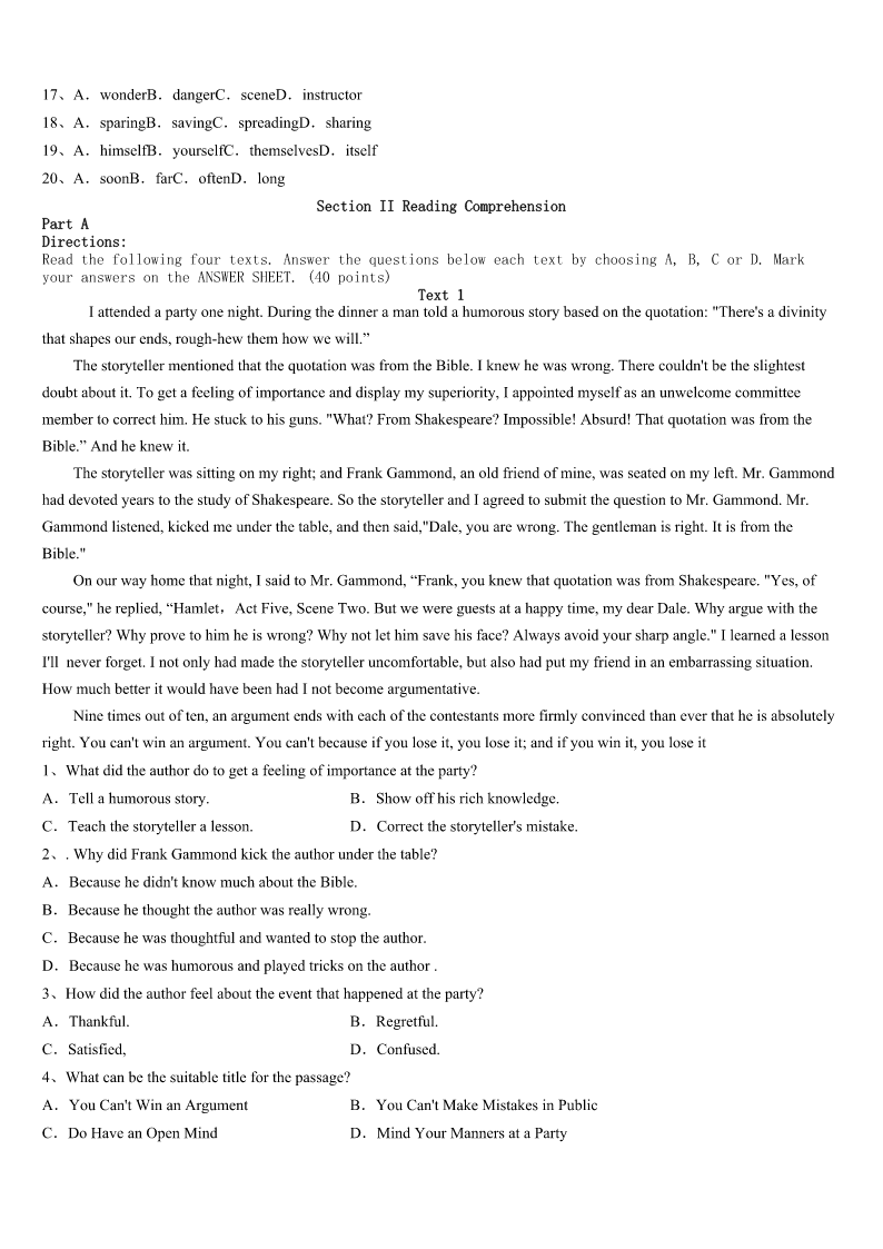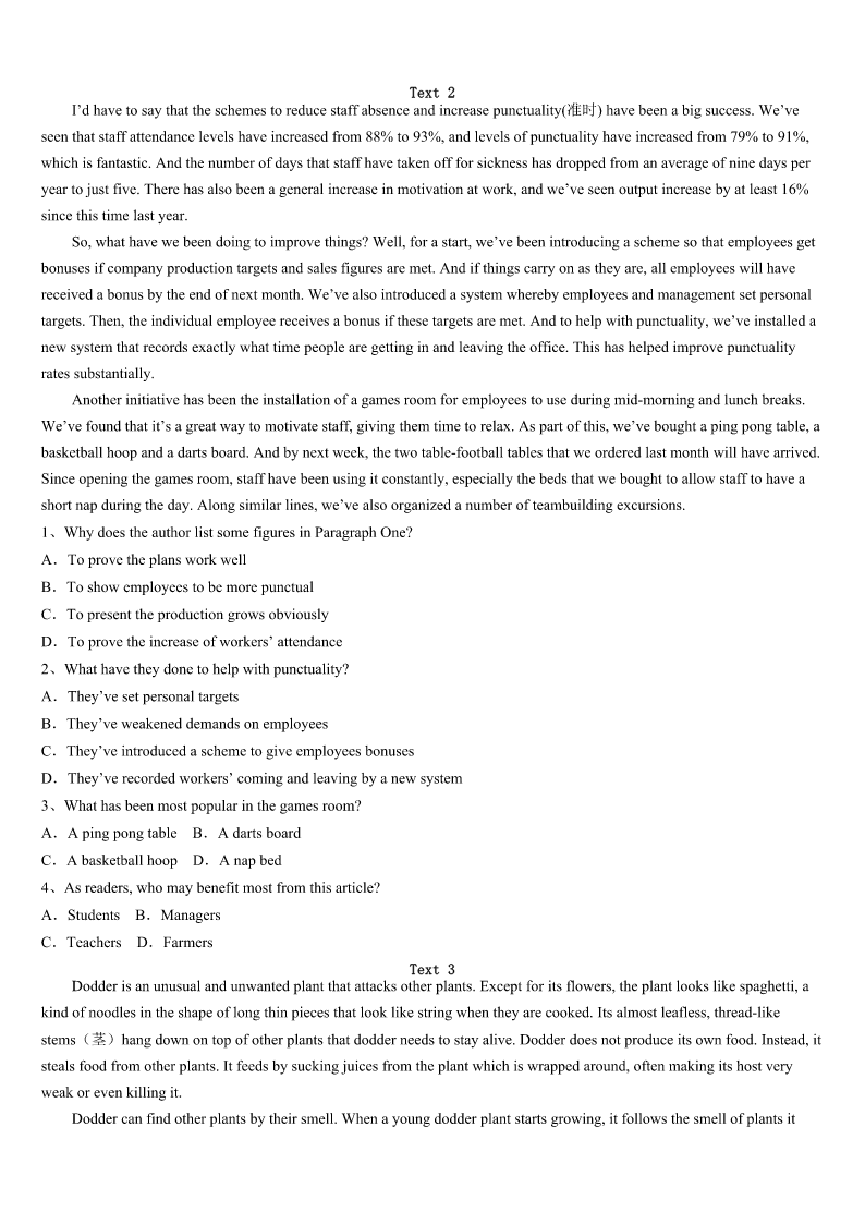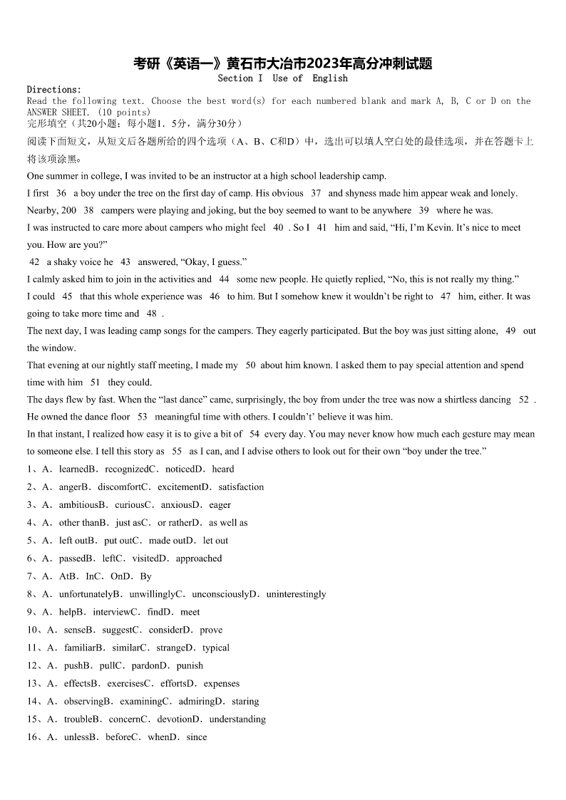 考研《英语一》黄石市大冶市2023年高分冲刺试题 SectionIUseofEnglish Directions: Readthefollowingtext.Choosethebestword(s)foreachnumberedblankandmarkA,B,CorDonthe ANSWERSHEET.(10points) 完形填空(共20小题;每小题1.5分,满分30分) 阅读下面短文,从短文后各题所给的四个选项(A、B、C和D)中,选出可以填人空白处的最佳选项,并在答题卡上 将该项涂黑 Onesummerincollege,Iwasinvitedtobeaninstructoratahighschoolleadershipcamp. Ifirst36aboyunderthetreeonthefirstdayofcamp.Hisobvious37andshynessmadehimappearweakandlonely. Nearby,20038camperswereplayingandjoking,buttheboyseemedtowanttobeanywhere39wherehewas. Iwasinstructedtocaremoreaboutcamperswhomightfeel40.SoI41himandsaid,“Hi,I’mKevin.It’snicetomeet you.Howareyou?” 42ashakyvoicehe43answered,“Okay,Iguess.” Icalmlyaskedhimtojoinintheactivitiesand44somenewpeople.Hequietlyreplied,“No,thisisnotreallymything.” Icould45thatthiswholeexperiencewas46tohim.ButIsomehowknewitwouldn’tberightto47him,either.Itwas goingtotakemoretimeand48. Thenextday,Iwasleadingcampsongsforthecampers.Theyeagerlyparticipated.Buttheboywasjustsittingalone,49out thewindow. Thateveningatournightlystaffmeeting,Imademy50abouthimknown.Iaskedthemtopayspecialattentionandspend timewithhim51theycould. Thedaysflewbyfast.Whenthe“lastdance”came,surprisingly,theboyfromunderthetreewasnowashirtlessdancing52. Heownedthedancefloor53meaningfultimewithothers.Icouldn’t’believeitwashim. Inthatinstant,Irealizedhoweasyitistogiveabitof54everyday.Youmayneverknowhowmucheachgesturemaymean tosomeoneelse.Itellthisstoryas55asIcan,andIadviseotherstolookoutfortheirown“boyunderthetree.” 1、A.learnedB.recognizedC.noticedD.heard 2、A.angerB.discomfortC.excitementD.satisfaction 3、A.ambitiousB.curiousC.anxiousD.eager 4、A.otherthanB.justasC.orratherD.aswellas 5、A.leftoutB.putoutC.madeoutD.letout 6、A.passedB.leftC.visitedD.approached 7、A.AtB.InC.OnD.By 8、A.unfortunatelyB.unwillinglyC.unconsciouslyD.uninterestingly 9、A.helpB.interviewC.findD.meet 10、A.senseB.suggestC.considerD.prove 11、A.familiarB.similarC.strangeD.typical 12、A.pushB.pullC.pardonD.punish 13、A.effectsB.exercisesC.effortsD.expenses 14、A