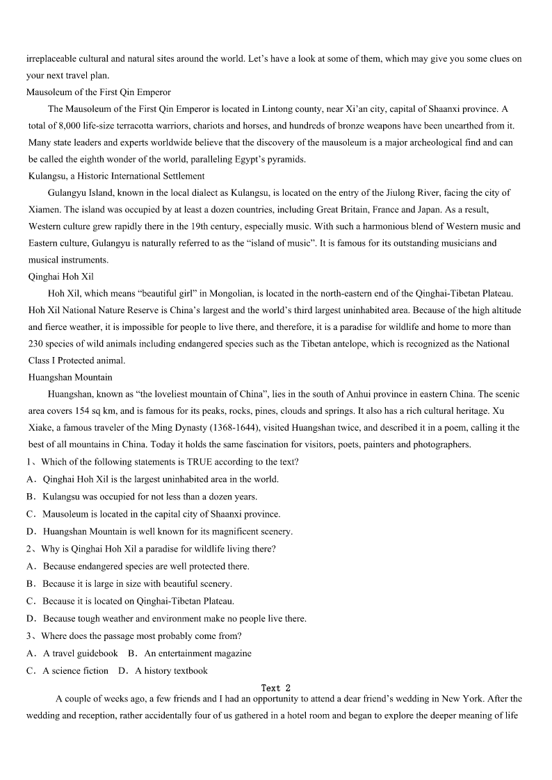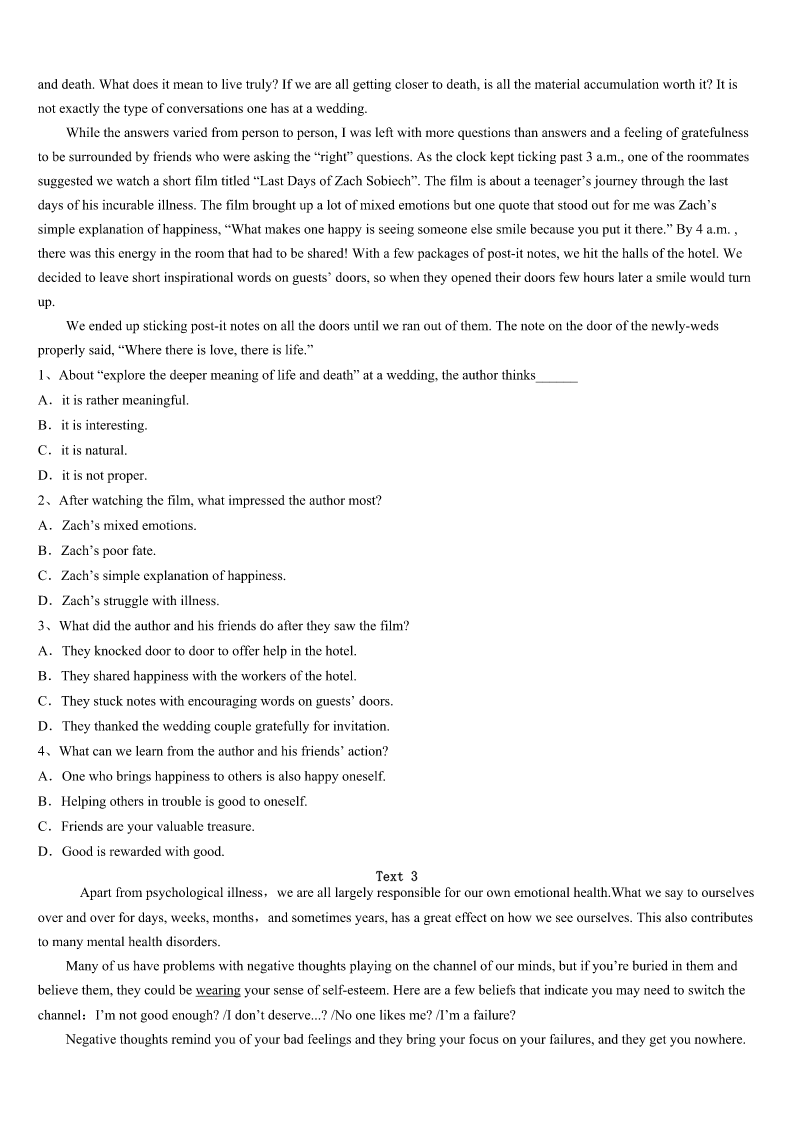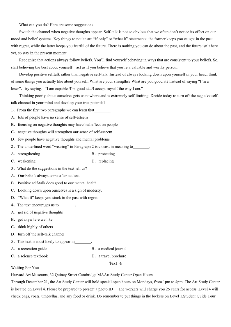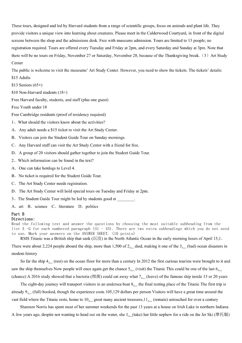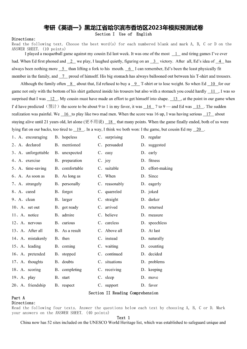 考研《英语一》黑龙江省哈尔滨市香坊区2023年模拟预测试卷 SectionIUseofEnglish Directions: Readthefollowingtext.Choosethebestword(s)foreachnumberedblankandmarkA,B,CorDonthe ANSWERSHEET.(10points) IplayedaracquetballgameagainstmycousinEdlastweek.Itwasoneofthemost1andtiringgamesI’veever had.WhenEdfirstphonedand2weplay,Ilaughedquietly,figuringonan3victory.Afterall,Ed’sideaof4has alwaysbeennothingmore5thanliftingaforktohismouth.6Icanremember,Ed’sbeentheleastphysicallyfit memberinthefamily,and7proudofhimself.HisbigstomachhasalwaysballoonedoutbetweenhisT-shirtandtrousers. Althoughthefamilyoften8aboutthat,Edrefusedtobuya9T-shirtortoloseweight.SowhenEd10forour gamenotonlywiththebottomofhisshirtgatheredinsidehistrousersbutalsowithastomachyoucouldhardly11,Iwasso surprisedthatIwas12.Mycousinmusthavemadeanefforttogethimselfintoshape.13,atthepointinourgamewhen I'dhavepredicted(预计)thescoretobeabout9to1inmyfavor,itwas147to9—andEdwas15.Thesudden realizationwaspainful.We16toplayliketwomadmen.Whenthescorewas16up,Iwashavingserious17about stayingaliveuntil21yearsold,letalone(更不用说)18thatmanypoints.Whenthegamefinallyended,bothofuswere lyingflatonourbacks,tootiredto19.Inaway,Ithinkwebothwon:Ithegame,butcousinEdmy20. 1、A.encouragingB.hopelessC.surprisingD.regular 2、A.declaredB.mentionedC.persuadedD.suggested 3、A.unforgettableB.unexpectedC.easyD.early 4、A.exerciseB.preparationC.joyD.fitness 5、A.time-savingB.comfortableC.suitableD.effort-making 6、A.AssoonasB.AslongasC.WhenD.Since 7、A.strangelyB.personallyC.reasonablyD.eagerly 8、A.caredB.forgotC.quarreledD.joked 9、A.cleanB.largerC.straightD.darker 10、A.setoutB.gotreadyC.arrivedD.returned 11、A.noticeB.admireC.believeD.measure 12、A.nervousB.curiousC.carelessD.speechless 13、A.AfterallB.AsaresultC.AboveallD.Atlast 14、A.mistakenlyB.thenC.insteadD.naturally 15、A.leadingB.comingC.waitingD.counting 16、A.pretendedB.stoppedC.continuedD.decided 17、A.thoughtsB.doubtsC.situationsD.problems 18、A.scoringB.completingC.receivingD.keeping 19、A.playB.startC.sleepD.move 20、A.friendshipB.re