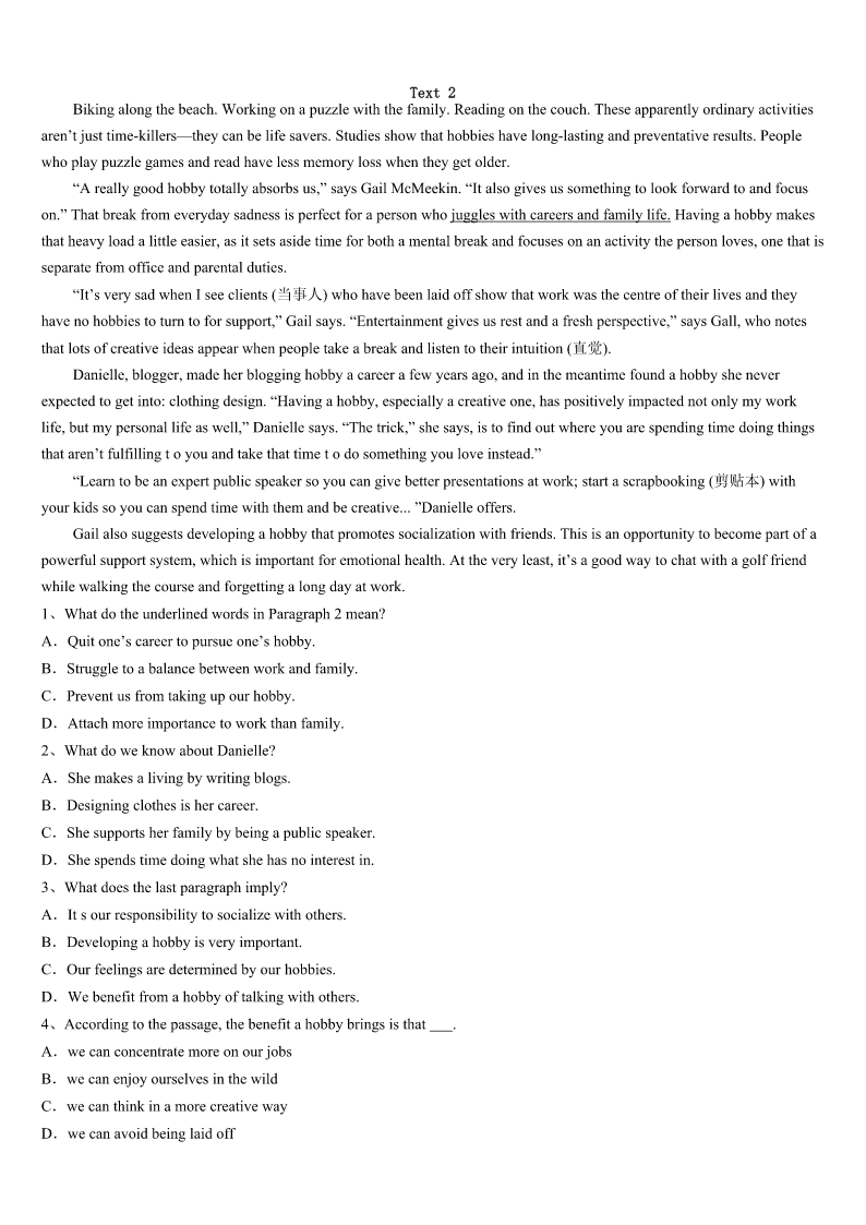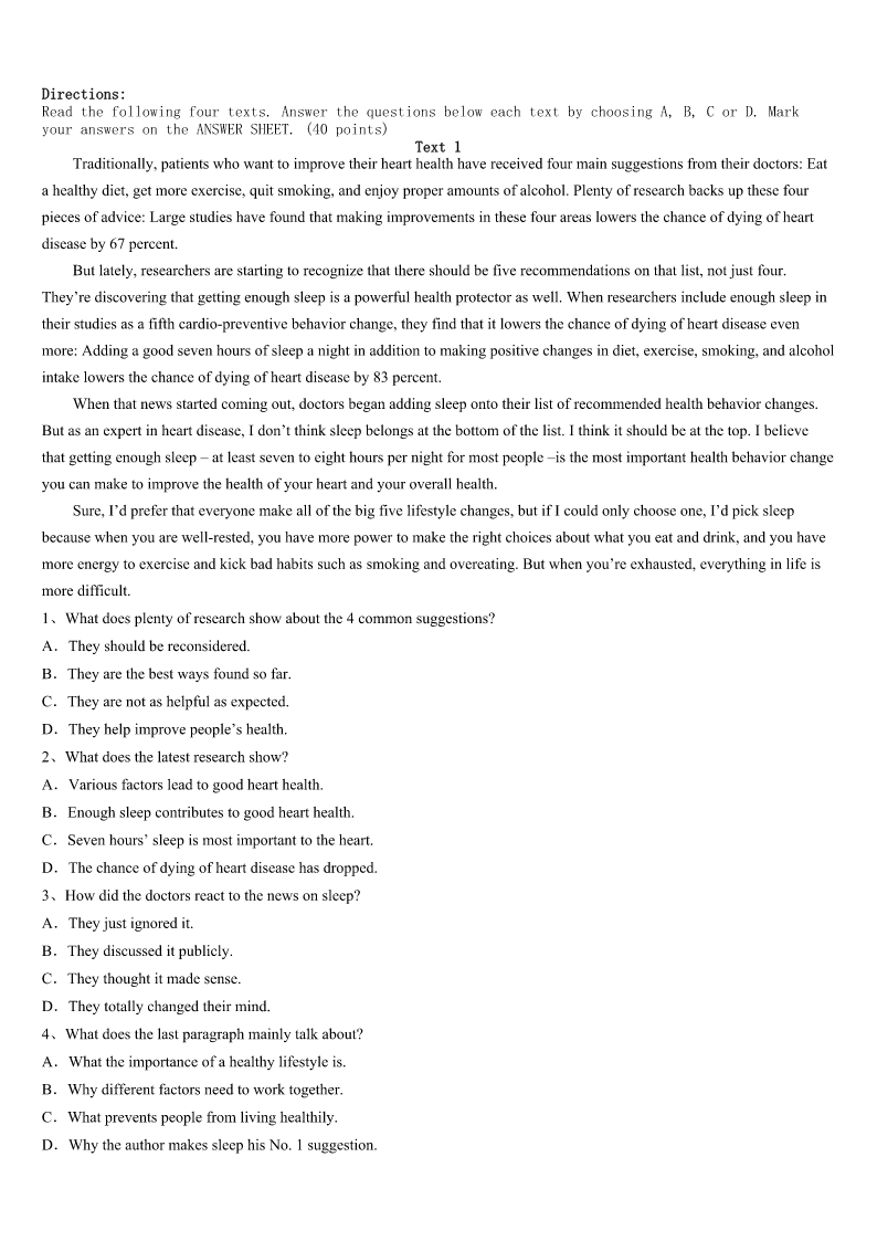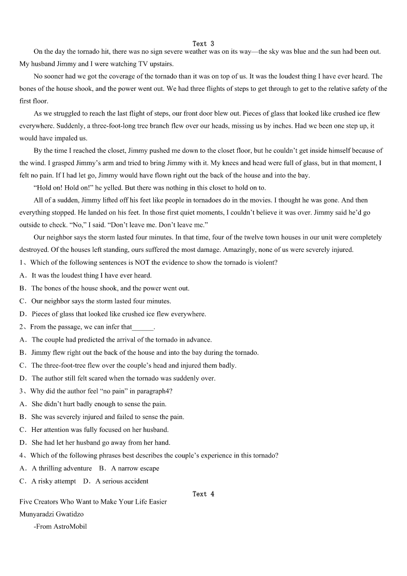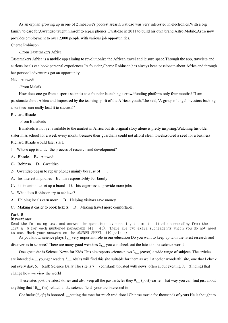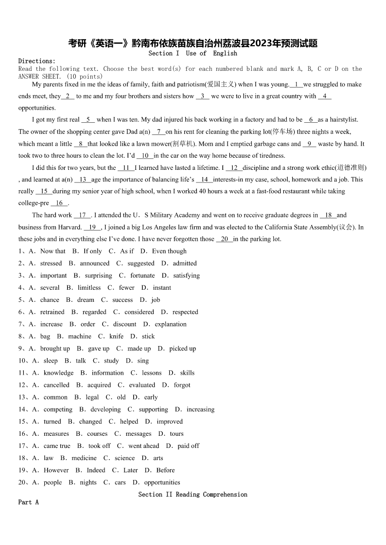 考研《英语一》黔南布依族苗族自治州荔波县2023年预测试题 SectionIUseofEnglish Directions: Readthefollowingtext.Choosethebestword(s)foreachnumberedblankandmarkA,B,CorDonthe ANSWERSHEET.(10points) Myparentsfixedinmetheideasoffamily,faithandpatriotism(爱国主义)whenIwasyoung.1westruggledtomake endsmeet,they2tomeandmyfourbrothersandsistershow3weweretoliveinagreatcountrywith4 opportunities. Igotmyfirstreal5whenIwasten.Mydadinjuredhisbackworkinginafactoryandhadtobe6asahairstylist. TheowneroftheshoppingcentergaveDada(n)7onhisrentforcleaningtheparkinglot(停车场)threenightsaweek, whichmeantalittle8thatlookedlikealawnmower(割草机).MomandIemptiedgarbagecansand9wastebyhand.It tooktwotothreehourstocleanthelot.I’d10inthecaronthewayhomebecauseoftiredness. Ididthisfortwoyears,butthe11Ilearnedhavelastedalifetime.I12disciplineandastrongworkethic(道德准则) ,andlearnedata(n)13agetheimportanceofbalancinglife’s14interestsinmycase,school,homeworkandajob.This really15duringmysenioryearofhighschool,whenIworked40hoursaweekatafastfoodrestaurantwhiletaking collegepre16. Thehardwork17.IattendedtheU.SMilitaryAcademyandwentontoreceivegraduatedegreesin18and businessfromHarvard.19,IjoinedabigLosAngeleslawfirmandwaselectedtotheCaliforniaStateAssembly(议会).In thesejobsandineverythingelseI’vedone.Ihaveneverforgottenthose20intheparkinglot. 1、A.NowthatB.IfonlyC.AsifD.Eventhough 2、A.stressedB.announcedC.suggestedD.admitted 3、A.importantB.surprisingC.fortunateD.satisfying 4、A.severalB.limitlessC.fewerD.instant 5、A.chanceB.dreamC.successD.job 6、A.retrainedB.regardedC.consideredD.respected 7、A.increaseB.orderC.discountD.explanation 8、A.bagB.machineC.knifeD.stick 9、A.broughtupB.gaveupC.madeupD.pickedup 10、A.sleepB.talkC.studyD.sing 11、A.knowledgeB.informationC.lessonsD.skills 12、A.cancelledB.acquiredC.evaluatedD.forgot 13、A.commonB.legalC.oldD.early 14、A.competingB.developingC.supportingD.increasing 15、A.turnedB.changedC.helpedD.improved 16、A.measuresB.coursesC.messagesD.tours 17、A.cametrueB.tookoffC.wentaheadD.paidoff 18、A.lawB.medicineC.scienceD
