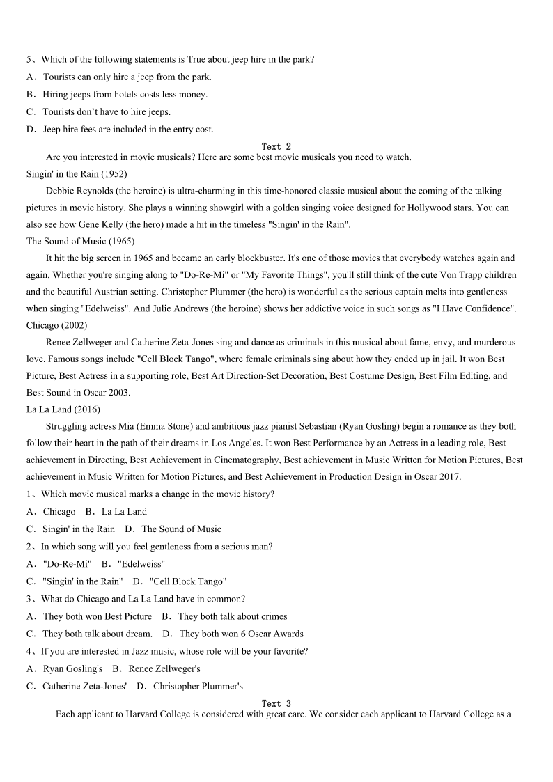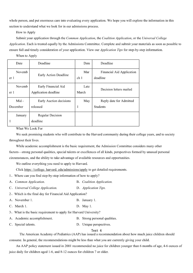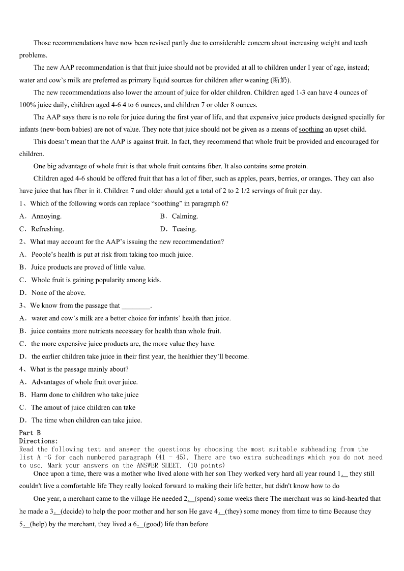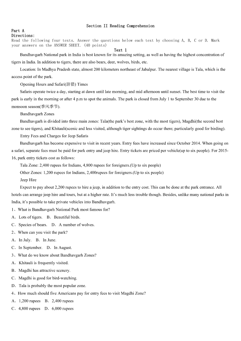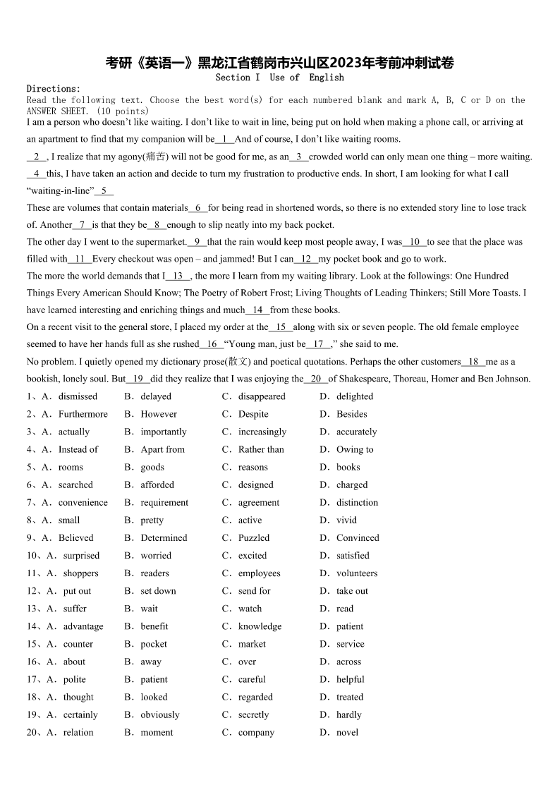 考研《英语一》黑龙江省鹤岗市兴山区2023年考前冲刺试卷 SectionIUseofEnglish Directions: Readthefollowingtext.Choosethebestword(s)foreachnumberedblankandmarkA,B,CorDonthe ANSWERSHEET.(10points) Iamapersonwhodoesn’tlikewaiting.Idon’tliketowaitinline,beingputonholdwhenmakingaphonecall,orarrivingat anapartmenttofindthatmycompanionwillbe1Andofcourse,Idon’tlikewaitingrooms. 2,Irealizethatmyagony(痛苦)willnotbegoodforme,asan3crowdedworldcanonlymeanonething–morewaiting. 4this,Ihavetakenanactionanddecidetoturnmyfrustrationtoproductiveends.Inshort,IamlookingforwhatIcall “waitinginline”5 Thesearevolumesthatcontainmaterials6forbeingreadinshortenedwords,sothereisnoextendedstorylinetolosetrack of.Another7isthattheybe8enoughtoslipneatlyintomybackpocket. TheotherdayIwenttothesupermarket.9thattherainwouldkeepmostpeopleaway,Iwas10toseethattheplacewas filledwith11Everycheckoutwasopen–andjammed!ButIcan12mypocketbookandgotowork. ThemoretheworlddemandsthatI13,themoreIlearnfrommywaitinglibrary.Lookatthefollowings:OneHundred ThingsEveryAmericanShouldKnow;ThePoetryofRobertFrost;LivingThoughtsofLeadingThinkers;StillMoreToasts.I havelearnedinterestingandenrichingthingsandmuch14fromthesebooks. Onarecentvisittothegeneralstore,Iplacedmyorderatthe15alongwithsixorsevenpeople.Theoldfemaleemployee seemedtohaveherhandsfullassherushed16“Youngman,justbe17,”shesaidtome. Noproblem.Iquietlyopenedmydictionaryprose(散文)andpoeticalquotations.Perhapstheothercustomers18measa bookish,lonelysoul.But19didtheyrealizethatIwasenjoyingthe20ofShakespeare,Thoreau,HomerandBenJohnson. 1、A.dismissedB.delayedC.disappearedD.delighted 2、A.FurthermoreB.HoweverC.DespiteD.Besides 3、A.actuallyB.importantlyC.increasinglyD.accurately 4、A.InsteadofB.ApartfromC.RatherthanD.Owingto 5、A.roomsB.goodsC.reasonsD.books 6、A.searchedB.affordedC.designedD.charged 7、A.convenienceB.requirementC.agreementD.distinction 8、A.smallB.prettyC.activeD.vivid 9、A.BelievedB.DeterminedC.PuzzledD.Convinced 10、A.surprisedB.worriedC.excitedD.satisfied 11、A.shoppersB.readersC.employees
