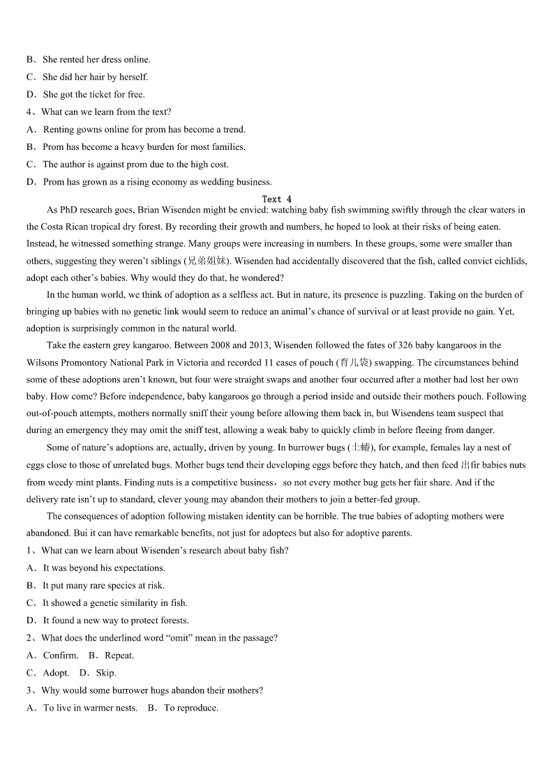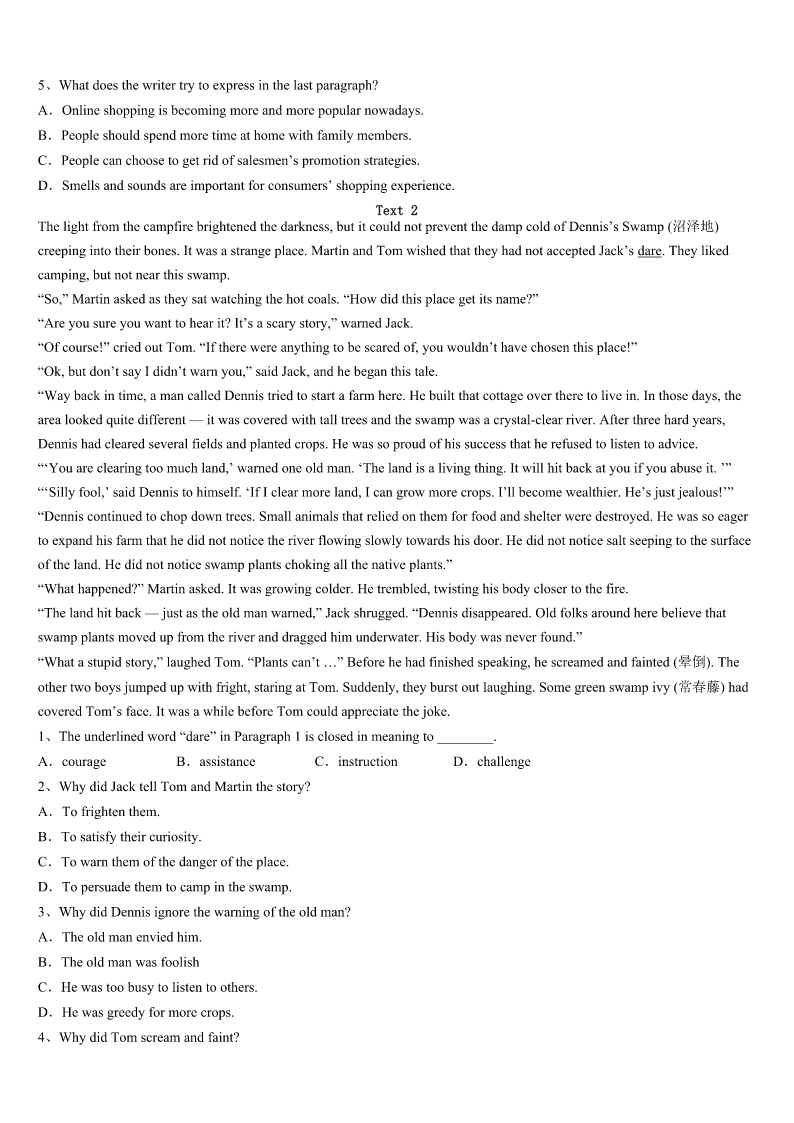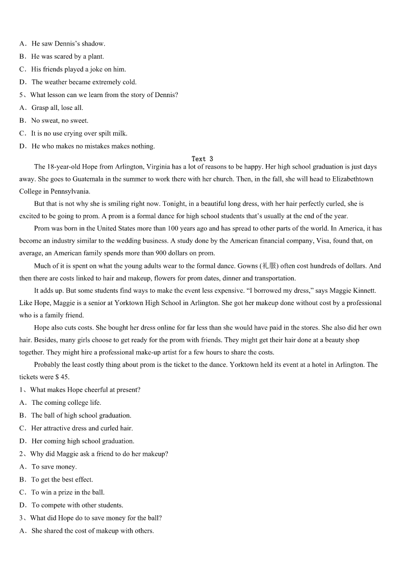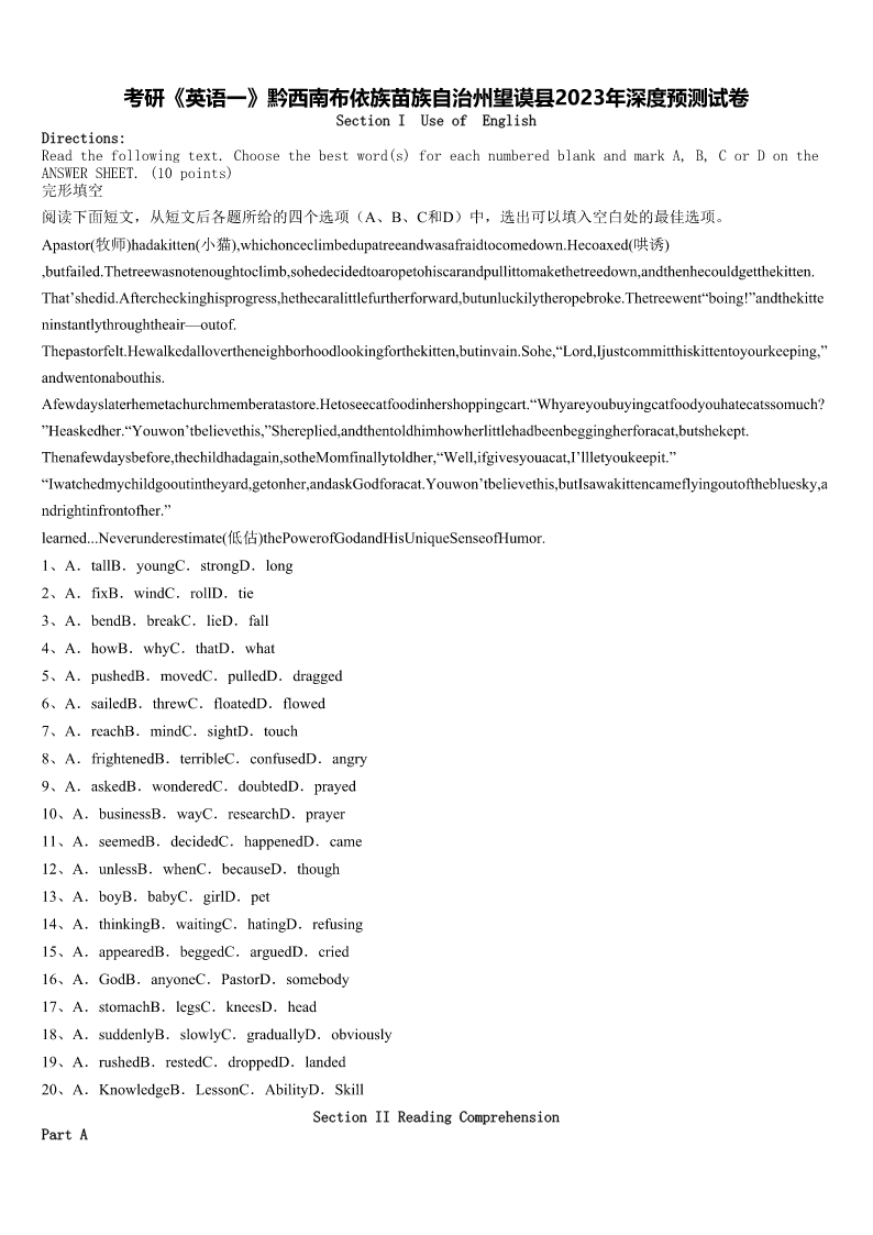 考研《英语一》黔西南布依族苗族自治州望谟县2023年深度预测试卷 SectionIUseofEnglish Directions: Readthefollowingtext.Choosethebestword(s)foreachnumberedblankandmarkA,B,CorDonthe ANSWERSHEET.(10points) 完形填空 阅读下面短文,从短文后各题所给的四个选项(A、B、C和D)中,选出可以填入空白处的最佳选项。 Apastor(牧师)hadakitten(小猫),whichonceclimbedupatreeandwasafraidtocomedown.Hecoaxed(哄诱) ,butfailed.Thetreewasnotenoughtoclimb,sohedecidedtoaropetohiscarandpullittomakethetreedown,andthenhecouldgetthekitten. That’shedid.Aftercheckinghisprogress,hethecaralittlefurtherforward,butunluckilytheropebroke.Thetreewent“boing!”andthekitte ninstantlythroughtheair—outof. Thepastorfelt.Hewalkedallovertheneighborhoodlookingforthekitten,butinvain.Sohe,“Lord,Ijustcommitthiskittentoyourkeeping,” andwentonabouthis. Afewdayslaterhemetachurchmemberatastore.Hetoseecatfoodinhershoppingcart.“Whyareyoubuyingcatfoodyouhatecatssomuch? ”Heaskedher.“Youwon’tbelievethis,”Shereplied,andthentoldhimhowherlittlehadbeenbeggingherforacat,butshekept. Thenafewdaysbefore,thechildhadagain,sotheMomfinallytoldher,“Well,ifgivesyouacat,I’llletyoukeepit.” “Iwatchedmychildgooutintheyard,getonher,andaskGodforacat.Youwon’tbelievethis,butIsawakittencameflyingoutofthebluesky,a ndrightinfrontofher.” learned...Neverunderestimate(低估)thePowerofGodandHisUniqueSenseofHumor. 1、A.tallB.youngC.strongD.long 2、A.fixB.windC.rollD.tie 3、A.bendB.breakC.lieD.fall 4、A.howB.whyC.thatD.what 5、A.pushedB.movedC.pulledD.dragged 6、A.sailedB.threwC.floatedD.flowed 7、A.reachB.mindC.sightD.touch 8、A.frightenedB.terribleC.confusedD.angry 9、A.askedB.wonderedC.doubtedD.prayed 10、A.businessB.wayC.researchD.prayer 11、A.seemedB.decidedC.happenedD.came 12、A.unlessB.whenC.becauseD.though 13、A.boyB.babyC.girlD.pet 14、A.thinkingB.waitingC.hatingD.refusing 15、A.appearedB.beggedC.arguedD.cried 16、A.GodB.anyoneC.PastorD.somebody 17、A.stomachB.legsC.kneesD.head 18、A.suddenlyB.slowlyC.graduallyD.obviously 19、A.rushedB.restedC.droppedD.landed 20、A.KnowledgeB.LessonC.AbilityD.Skill SectionIIReadingComprehension PartA Directions: Readthefol