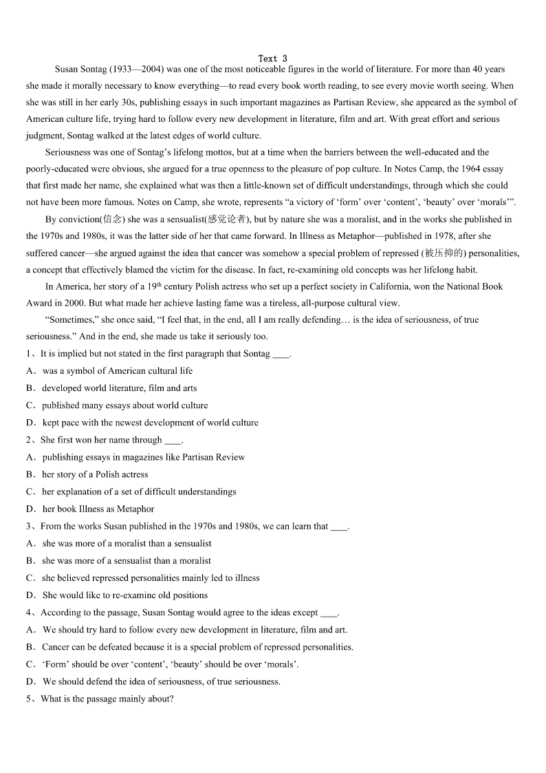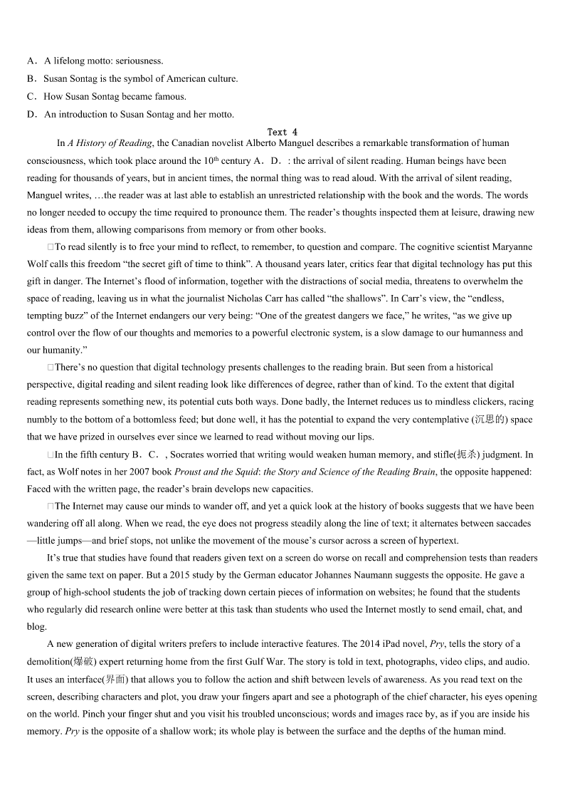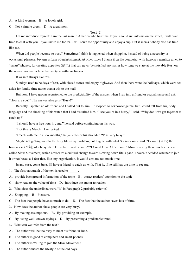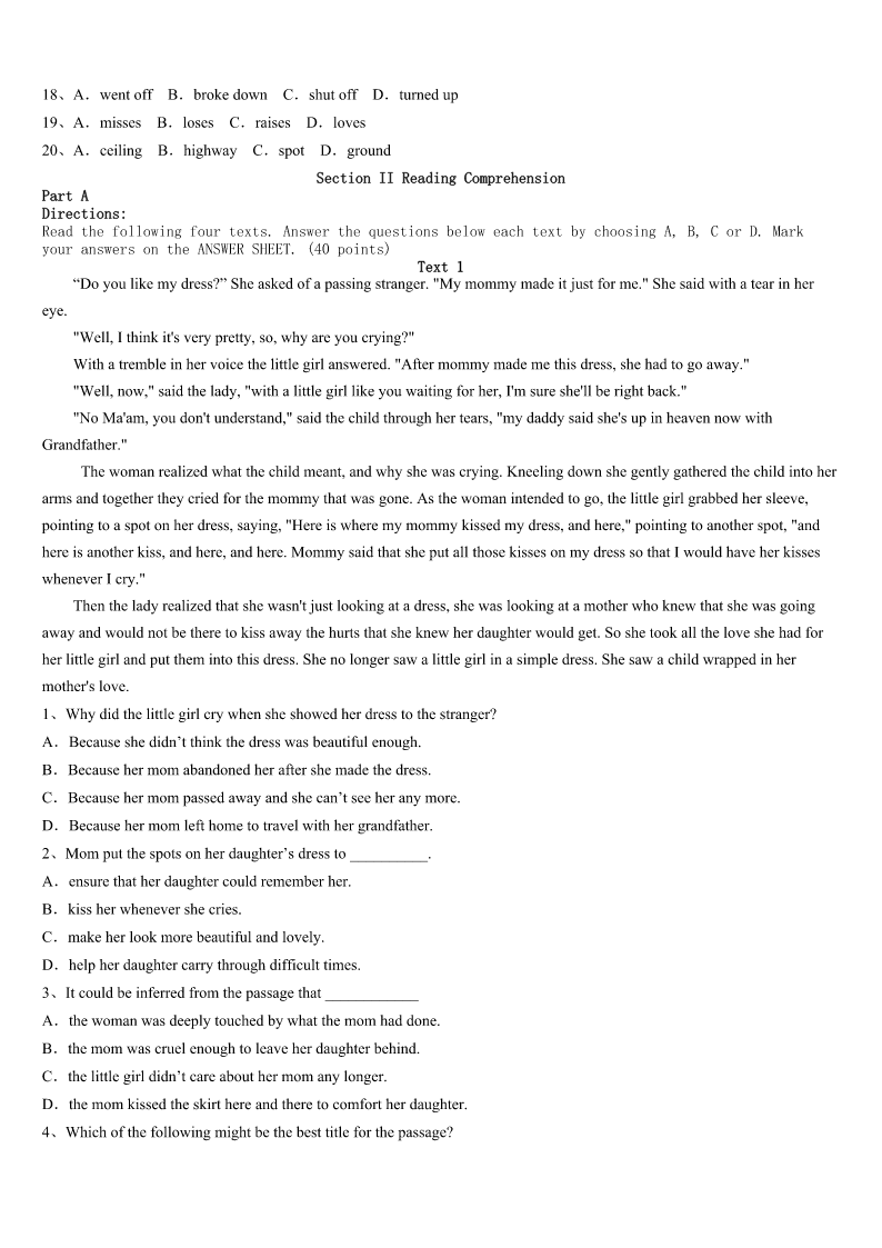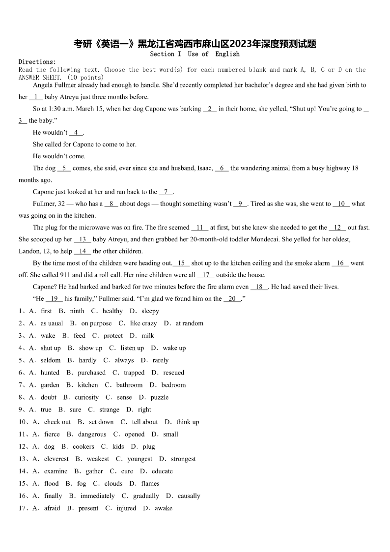 考研《英语一》黑龙江省鸡西市麻山区2023年深度预测试题 SectionIUseofEnglish Directions: Readthefollowingtext.Choosethebestword(s)foreachnumberedblankandmarkA,B,CorDonthe ANSWERSHEET.(10points) AngelaFullmeralreadyhadenoughtohandle.She’drecentlycompletedherbachelor’sdegreeandshehadgivenbirthto her1babyAtreyujustthreemonthsbefore. Soat1:30a.m.March15,whenherdogCaponewasbarking2intheirhome,sheyelled,“Shutup!You’regoingto 3thebaby.” Hewouldn’t4. ShecalledforCaponetocometoher. Hewouldn’tcome. Thedog5comes,shesaid,eversincesheandhusband,Isaac,6thewanderinganimalfromabusyhighway18 monthsago. Caponejustlookedatherandranbacktothe7. Fullmer,32—whohasa8aboutdogs—thoughtsomethingwasn’t9.Tiredasshewas,shewentto10what wasgoingoninthekitchen. Theplugforthemicrowavewasonfire.Thefireseemed11atfirst,butsheknewsheneededtogetthe12outfast. Shescoopedupher13babyAtreyu,andthengrabbedher20-month-oldtoddlerMondecai.Sheyelledforheroldest, Landon,12,tohelp14theotherchildren. Bythetimemostofthechildrenwereheadingout.15shotuptothekitchenceilingandthesmokealarm16went off.Shecalled911anddidarollcall.Herninechildrenwereall17outsidethehouse. Capone?Hehadbarkedandbarkedfortwominutesbeforethefirealarmeven18.Hehadsavedtheirlives. “He19hisfamily,”Fullmersaid.“I’mgladwefoundhimonthe20.” 1、A.firstB.ninthC.healthyD.sleepy 2、A.asuaualB.onpurposeC.likecrazyD.atrandom 3、A.wakeB.feedC.protectD.milk 4、A.shutupB.showupC.listenupD.wakeup 5、A.seldomB.hardlyC.alwaysD.rarely 6、A.huntedB.purchasedC.trappedD.rescued 7、A.gardenB.kitchenC.bathroomD.bedroom 8、A.doubtB.curiosityC.senseD.puzzle 9、A.trueB.sureC.strangeD.right 10、A.checkoutB.setdownC.tellaboutD.thinkup 11、A.fierceB.dangerousC.openedD.small 12、A.dogB.cookersC.kidsD.plug 13、A.cleverestB.weakestC.youngestD.strongest 14、A.examineB.gatherC.cureD.educate 15、A.floodB.fogC.cloudsD.flames 16、A.finallyB.immediatelyC.graduallyD.causally 17、A.afraidB.presentC.injuredD.awake 18、A.wentoffB.brokedownC.shutoffD.turnedup 19、A.missesB.losesC.raisesD.loves 20、A.ceilingB.highwayC.spotD.ground SectionI