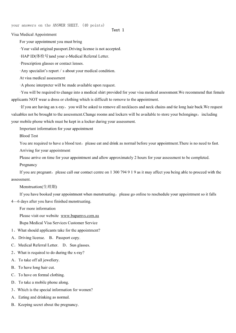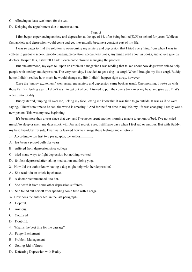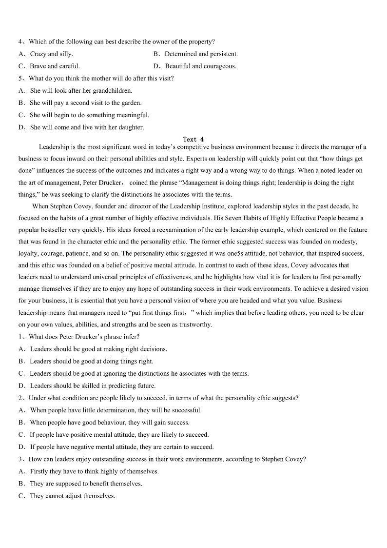 考研《英语一》海南省三亚市万宁市2023年考前冲刺试卷 SectionIUseofEnglish Directions: Readthefollowingtext.Choosethebestword(s)foreachnumberedblankandmarkA,B,CorDonthe ANSWERSHEET.(10points) Myfriendcalledmeovertotheplayarea.Myheart1.Thelookonherfaceprettymuch2itall.Isawmy25-momh- oldsittingwithherhead3lownexttoyourlittleboyashischeckswereredwithlotsoftears. Theplayareawasquitecrazyandyouhadn't4yetrealizedwhatmylittlegirlhaddonetoyourson.My5 maternal(母亲的)reactionwastoholdyourpreciouspoorbabyupinmyarmsandimmediately6you.Asweexchanged 7,youimmediately8tohughimandcomforthiminyourarms.Youdidn't9meormychildandIwillbehonest-I wouldn'thave10ifyoudid. Icouldblameitonthe11she'sgoingthrough,asweareexperiencingatightfamilybudget.IcouldthinkofwhereImust havegonewrongasshehasmetthiskindofmatterbeforeandclearlynotlearnedher12.Icouldrunthroughseveralvalid reasonsofwhyifusis13,andIjustwisheditwouldn'thavehappenedatall,14speaking. AsIsatingreatembarrassmentandshame,Iwasso15youhadgotthem.Thereweremanydayswhenwewereleftto feelsohelplessand16wherewewentwrong.Todayyoukept17.Youdidn'tpointfingersatmysometimesbadly-behaved 25-month-oldgirl.You18thatneitherofuswantedtobeintheposition,andyoudidn'tmakeitharderonmeormydaughter whomadeabad19.YoumadethisMamaoffourrealizethatmychildrenare20,andtheymakemistakes. 1、A.beatB.brightenedC.fliedD.sank 2、A.suggestedB.mentionedC.drewD.stopped 3、A.stickingB.fallingC.handingD.hanging 4、A.alsoB.evenC.justD.never 5、A.intelligentB.naturalC.regretfulD.forced 6、A.watchoutforB.standforC.cheerforD.lookfor 7、A.toysB.giftsC.eyesD.opinions 8、A.devotedB.contributedC.appliedD.reached 9、A.judgedB.ignoredC.lookedD.responded 10、A.runawayB.heldonC.brokendownD.givenup 11、A.surpriseB.stageC.examinationD.game 12、A.skillB.studyC.intentionD.lesson 13、A.normalB.regularC.occasionalD.advanced 14、A.generallyB.franklyC.relativelyD.roughly 15、A.gratefulB.hopefulC.fearfulD.careful 16、A.admireB.remindC.proveD.question 17、A.stillB.coolC.energeticD.curious 18、A.refusedB.expectedC.understoodD.doubted 19、A.apolog