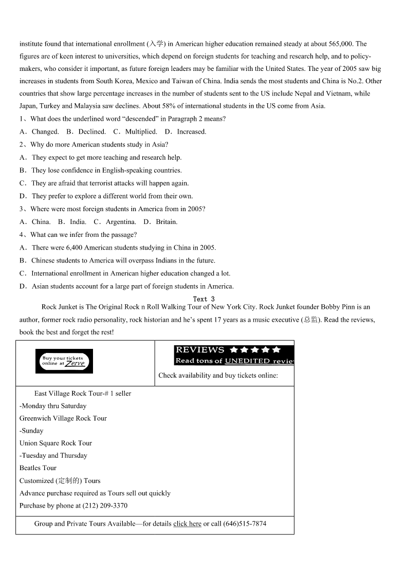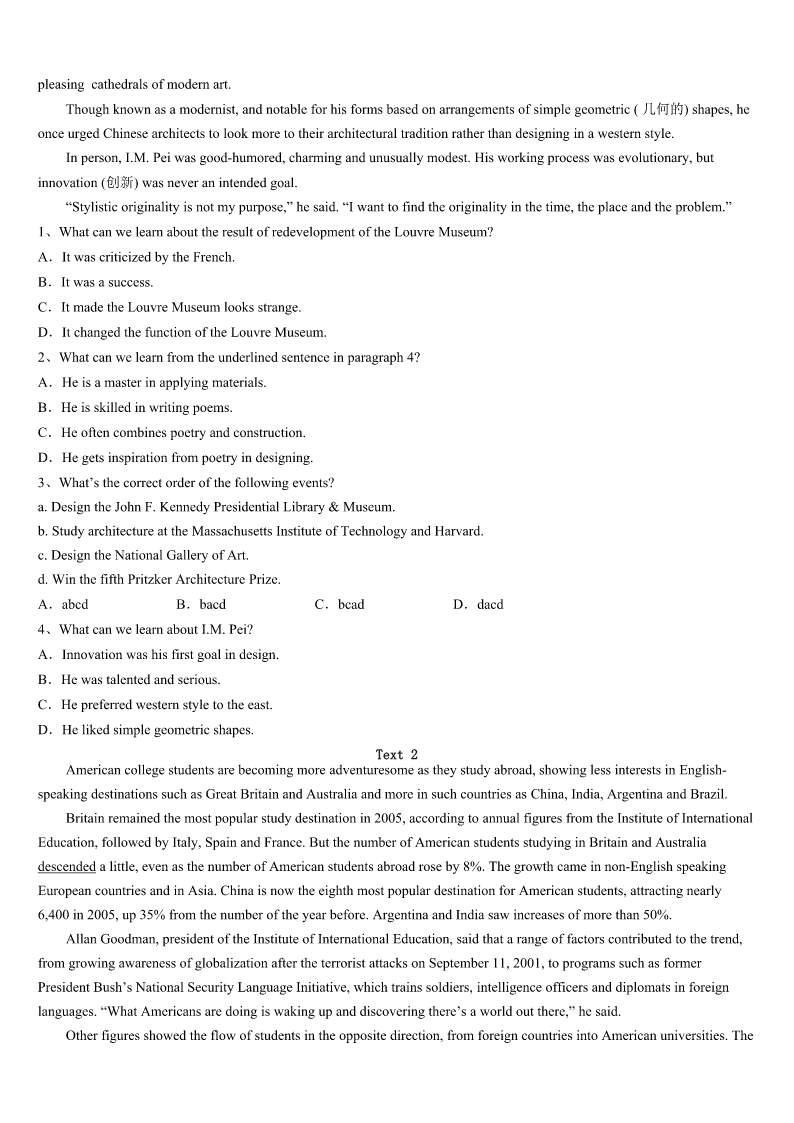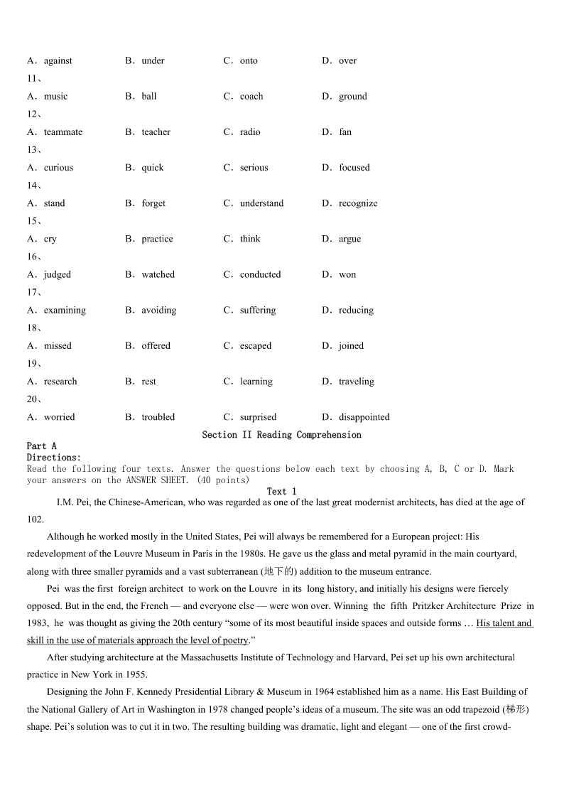 考研《英语一》黔东南南苗族侗族自治州麻江县2023年临考冲刺试题 SectionIUseofEnglish Directions: Readthefollowingtext.Choosethebestword(s)foreachnumberedblankandmarkA,B,CorDonthe ANSWERSHEET.(10points) Practice,practice,andpractice!That’s1TigerWoodsbecameachampiongolfer. TigerWoods2golfwhenhewasveryyoung.3withotherchildrenofhisage,heshowedspecialinterestin golf.Findingthathissonhada4forthisgame,Tiger’sfatherdecidedto5himonhisown.Tohisfather’s surprise,Tigerwasa(n)6golferevenattheageof6. However,beingachild,Tigercouldn’tfocusallthetime,7henevergaveup.Tigerlistenedtosoftmusictoimprovehis 8Hisfatherhelpedhimlearntofocusinspiteofthe9.SometimeshisfatherstoodinfrontofTigerandsaid,“I'matree inyourway,”Hewouldhavetohittheball10hisfather.SometimeshisfatherwoulddanceandsingwhenitwasTiger’s turntohitandTigerhadtofocusonthe11. Thetraininghelpedhim.Oncea12madealoudnoisewhileTigerwasplaying.HeSaidheneverheardthebroadcast becausehewasso13onthegame.Tigercannot14losing.Ifheloses,hewillgooutand15evenharderinordernotto makethesamemistake. Intheyear2000,whenhewas24yearsold,he16fourmajorgolfcompetitions—theUSOpen,theUSAmateur,the BritishOpenandtheBritishAmateur.Butduringthe2008seasonitbecameclearthatTigerwas17paininhisknee.In Aprilhiskneewasoperatedonandhe18thePGA(美国职业高尔夫球协会)tourseason.Afteraneight-monthperiodof 19hereturnedtoplayagaininFebruary2009.Hedidn’tmakehisfans20.Hewonagain. Heissomuchbetterthantheothergolfersthatsomesayheisthegreatestgolfertoeverplaythegame. 1、 A.howB.whenC.whereD.because 2、 A.lookedupB.setupC.tookupD.gaveup 3、 A.MixedB.ComparedC.LivingD.Competing 4、 A.trickB.planC.skillD.gift 5、 A.trainB.saveC.stopD.raise 6、 A.luckyB.commonC.amazingD.careful 7、 A.andB.butC.soD.as 8、 A.confidenceB.strengthC.patienceD.energy 9、 A.disturbanceB.carelessnessC.determinationD.failure 10、 A.againstB.underC.ontoD.over 11、 A.musicB.ballC.coachD.ground 12、 A.teammateB.teacherC.radioD.fan 13、 A.curiousB.quickC.seriousD.focused 14、 A.standB.forgetC.understandD.recognize 15、 A.cryB.practiceC.thinkD.argue 16、 A.judgedB.w