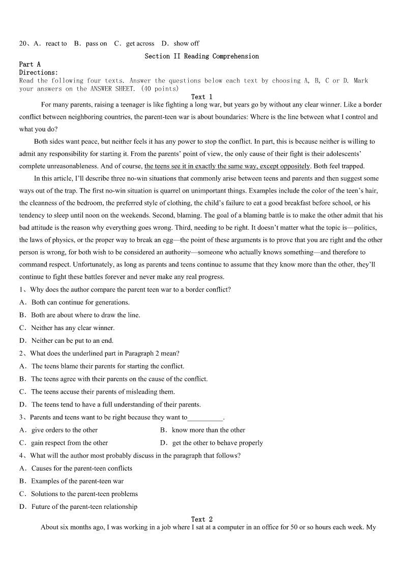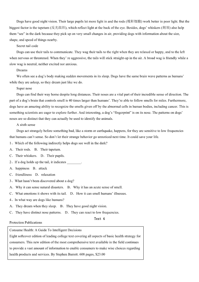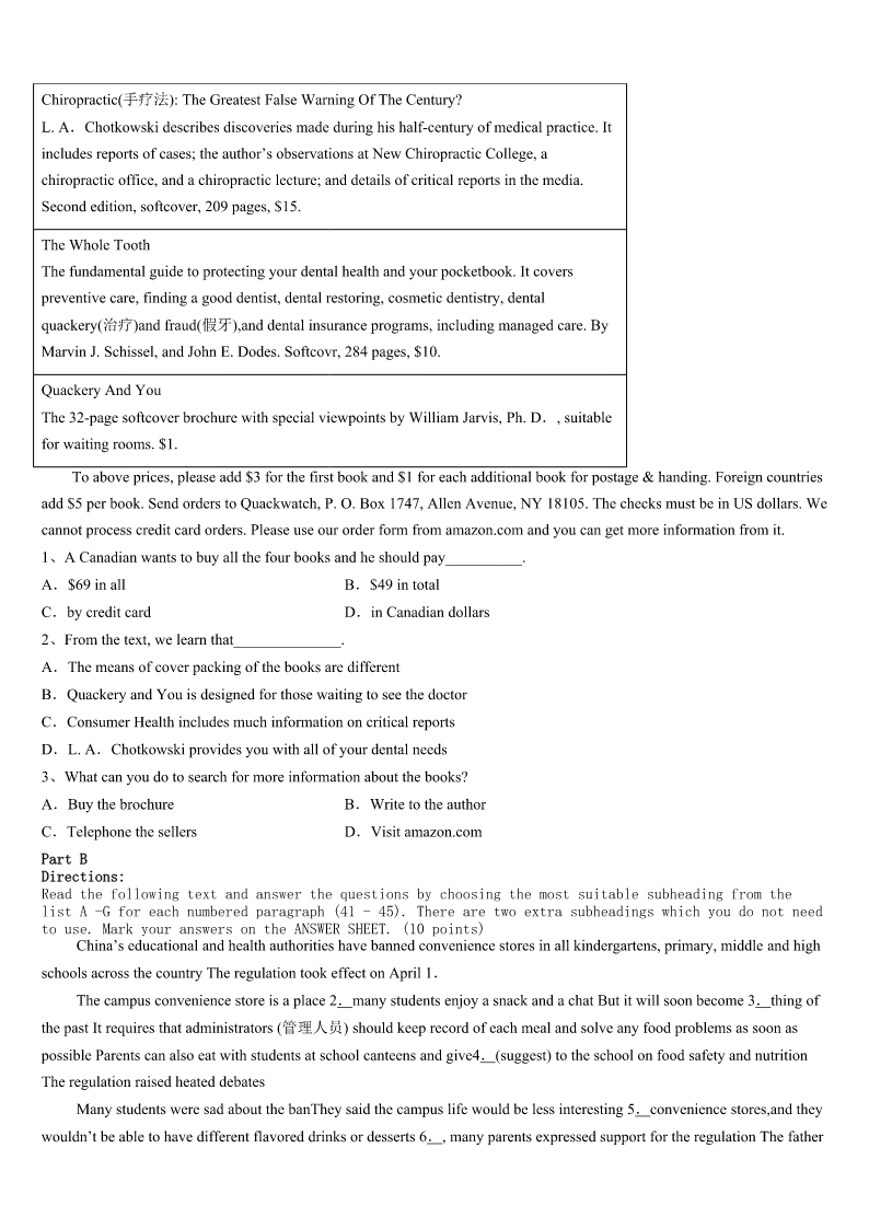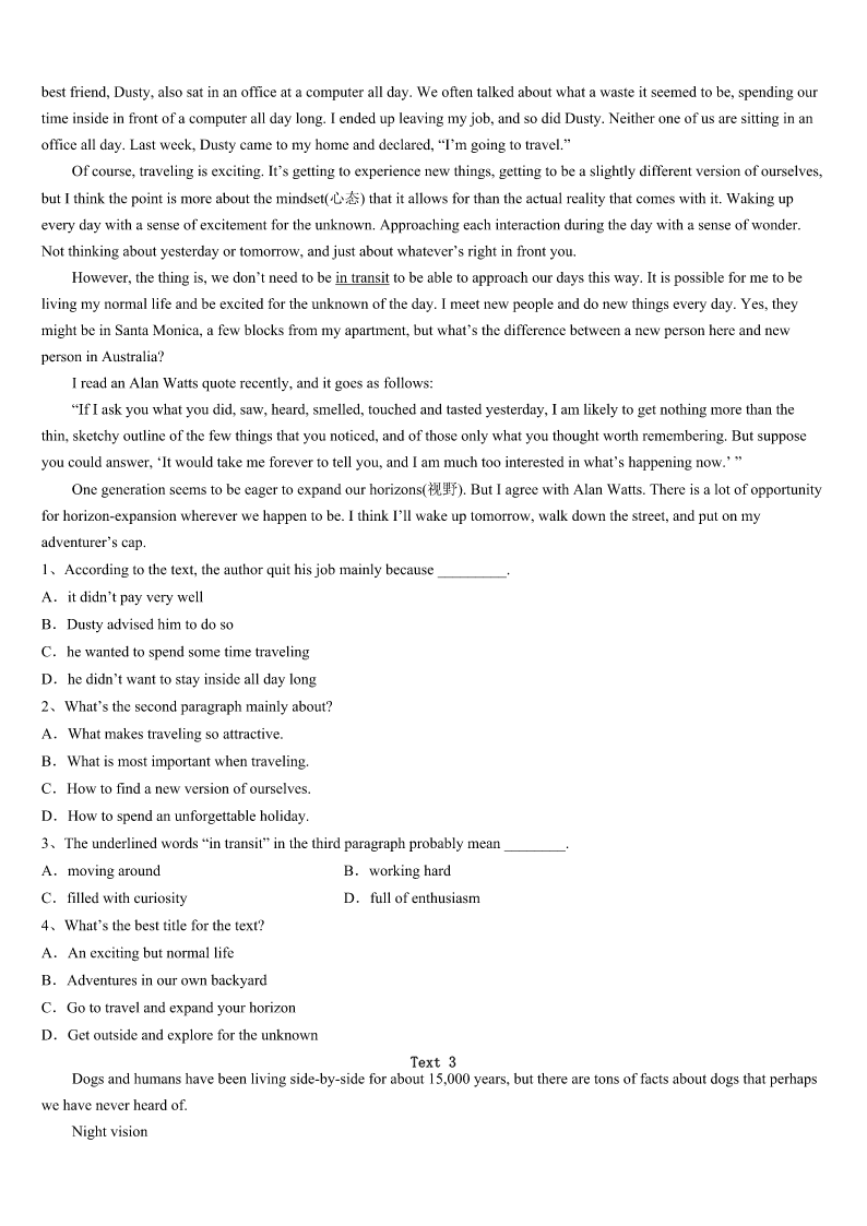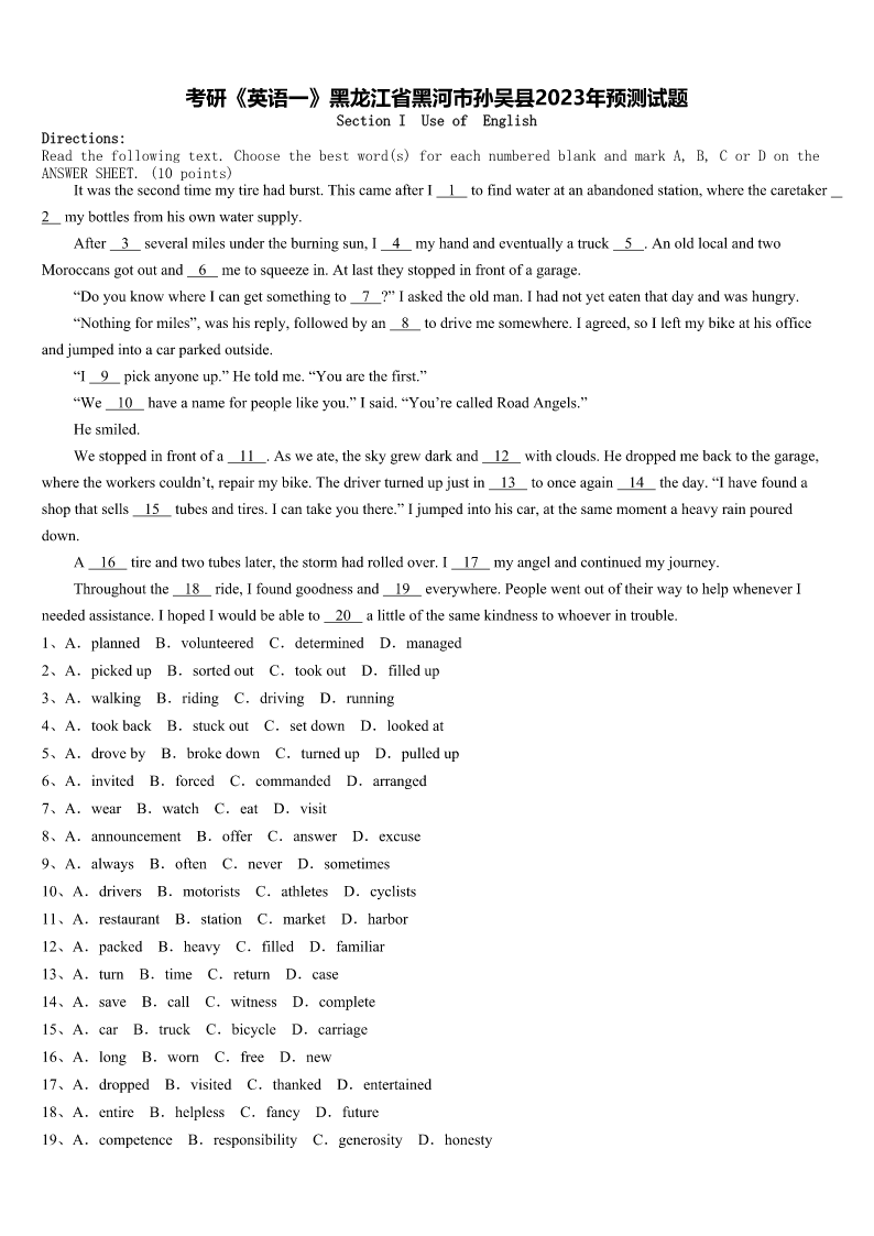 考研《英语一》黑龙江省黑河市孙吴县2023年预测试题 SectionIUseofEnglish Directions: Readthefollowingtext.Choosethebestword(s)foreachnumberedblankandmarkA,B,CorDonthe ANSWERSHEET.(10points) Itwasthesecondtimemytirehadburst.ThiscameafterI1tofindwateratanabandonedstation,wherethecaretaker 2mybottlesfromhisownwatersupply. After3severalmilesundertheburningsun,I4myhandandeventuallyatruck5.Anoldlocalandtwo Moroccansgotoutand6metosqueezein.Atlasttheystoppedinfrontofagarage. “DoyouknowwhereIcangetsomethingto7?”Iaskedtheoldman.Ihadnotyeteatenthatdayandwashungry. “Nothingformiles”,washisreply,followedbyan8todrivemesomewhere.Iagreed,soIleftmybikeathisoffice andjumpedintoacarparkedoutside. “I9pickanyoneup.”Hetoldme.“Youarethefirst.” “We10haveanameforpeoplelikeyou.”Isaid.“You’recalledRoadAngels.” Hesmiled. Westoppedinfrontofa11.Asweate,theskygrewdarkand12withclouds.Hedroppedmebacktothegarage, wheretheworkerscouldn’t,repairmybike.Thedriverturnedupjustin13toonceagain14theday.“Ihavefounda shopthatsells15tubesandtires.Icantakeyouthere.”Ijumpedintohiscar,atthesamemomentaheavyrainpoured down. A16tireandtwotubeslater,thestormhadrolledover.I17myangelandcontinuedmyjourney. Throughoutthe18ride,Ifoundgoodnessand19everywhere.PeoplewentoutoftheirwaytohelpwheneverI neededassistance.IhopedIwouldbeableto20alittleofthesamekindnesstowhoeverintrouble. 1、A.plannedB.volunteeredC.determinedD.managed 2、A.pickedupB.sortedoutC.tookoutD.filledup 3、A.walkingB.ridingC.drivingD.running 4、A.tookbackB.stuckoutC.setdownD.lookedat 5、A.drovebyB.brokedownC.turnedupD.pulledup 6、A.invitedB.forcedC.commandedD.arranged 7、A.wearB.watchC.eatD.visit 8、A.announcementB.offerC.answerD.excuse 9、A.alwaysB.oftenC.neverD.sometimes 10、A.driversB.motoristsC.athletesD.cyclists 11、A.restaurantB.stationC.marketD.harbor 12、A.packedB.heavyC.filledD.familiar 13、A.turnB.timeC.returnD.case 14、A.saveB.callC.witnessD.complete 15、A.carB.truckC.bicycleD.carriage 16、A.longB.wornC.freeD.new 17、A.droppedB.visitedC.thankedD.entertained 18、A.entireB.helplessC.fancyD.fut