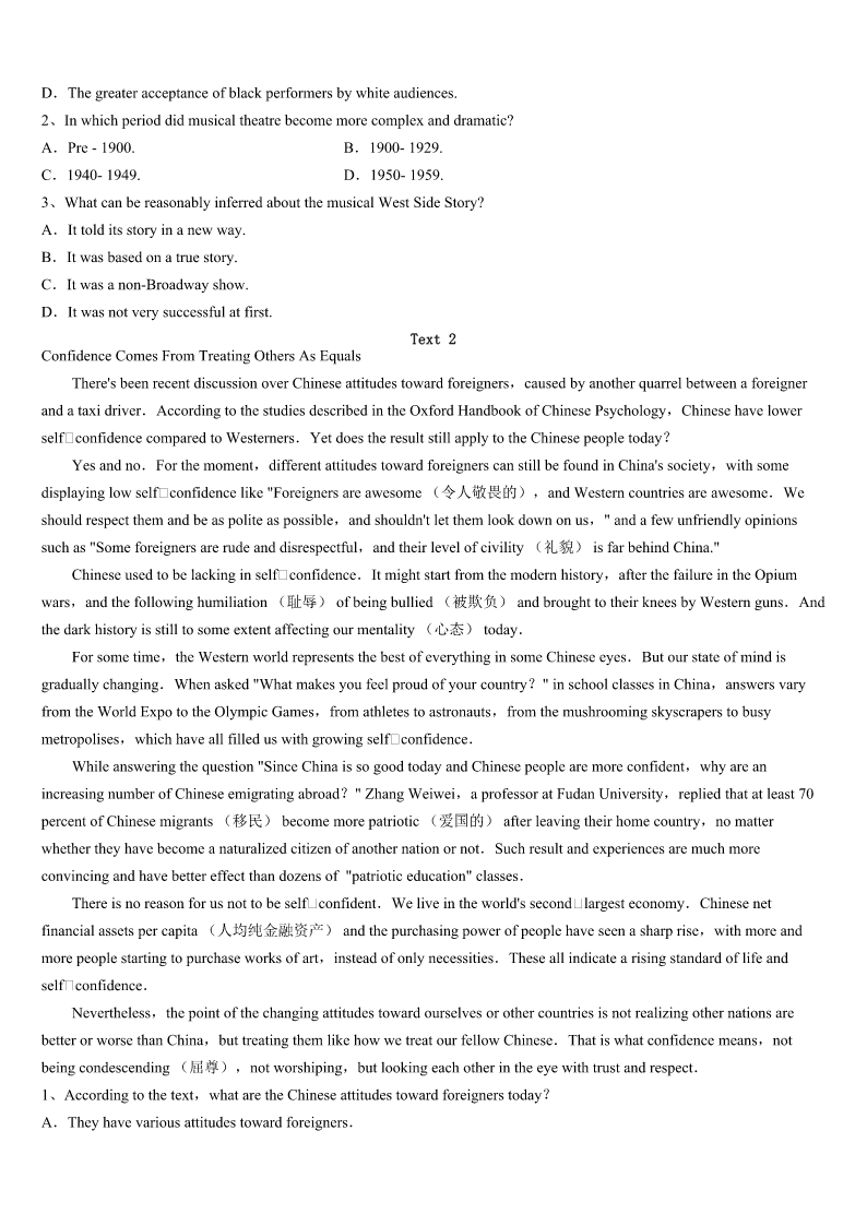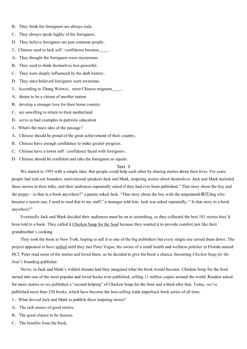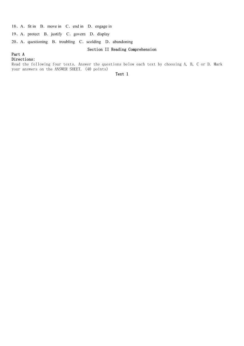 考研《英语一》黔西南布依族苗族自治州贞丰县2023年临考冲刺试题 SectionIUseofEnglish Directions: Readthefollowingtext.Choosethebestword(s)foreachnumberedblankandmarkA,B,CorDonthe ANSWERSHEET.(10points) Orderisthebestmanageroftime.Itillustratesmanysubjects.Thus,obediencetothenaturallawisorder.Virtueisorder. Theworldbeganwithit.1wasoncecommonbeforeitsestablishment. Themerchant,theclerkandthelaborerareallofthesame2,bornwiththesameexpectationsandaffectedbysimilar influences.Theyare,itis3,bornindifferentpositions,butit4withthemselveswhethertheyshalllivenoblyorevilly. Theymaynothavetheirchoiceofrichesorpoverty,buttheyhavetheir5ofbeinggoodorevil. Peopleofthehighestposition,6cultureandeducation,haveoftenasgreathardshipsasthecommonpeople.Theyhave tomaketheirincomesgomuchfurther.Theyhaveto7theirsocialstatus.8theirincomesmaybelesssatisfactory,they aredesperateto9andbringthechildrenupasgentlemen. Hume,afamoushistorian,wasamanofgoodfamilybuthis10wereverysmallwhenhewasyoung.Inhis autobiography,heuseshisowncaseasa(n)11oftheadvantagesoffrugality(节省).Despiteaconsiderabledebt,his mother,awidow,12metthedifficultiesandeventuallyovercamethem.Thoughherincomewaslessthanthatofmany highlypaidmen,sheeducatedherchildrenwellandbroughtthemup13. Humesays,“WhilestudyinginFrance,I14thatplanoflifewhichIhavesteadilyandsuccessfullypursued.I determinedtomakea15frugalitysupplyofmyshortageoffortuneandto16myindependence.”Atthirty-sixhe thoughthimselfrich.Thesearehisownwords:“Myappointments,withmyfrugality,hadhelpedmereachafortunewhich mademe17”. Goethesays,“Itdoesn’tmatterwithinwhatcircleanhonestmanacts,providedheknowshowto18thatcircle.” “Whatisthebestgovernment?”Goetheasks,“Thatwhichteachesusto19ourselves!Leteveryoneonlydotherightinhis place,without20himselfabouttheconfusionoftheworld.” 1、A.ChaosB.OffenceC.PunishmentD.Condemnation 2、A.originB.raceC.natureD.interest 3、A.hopefulB.strangeC.vitalD.true 4、A.agreesB.restsC.correspondsD.conflicts 5、A.ideaB.optionC.freedomD.intention 6、A.indefenceofB.incourseofC.inanticipationofD.inrespectof