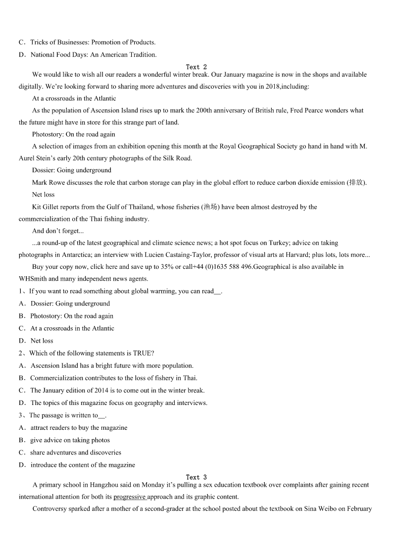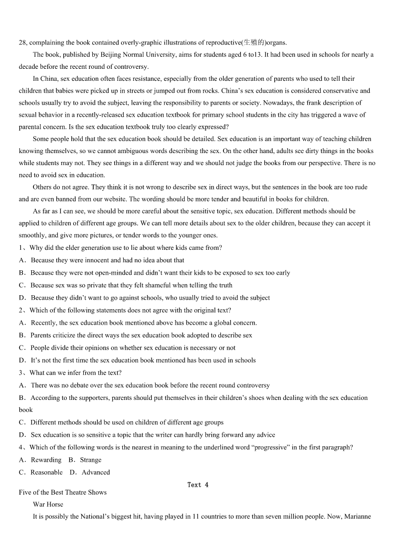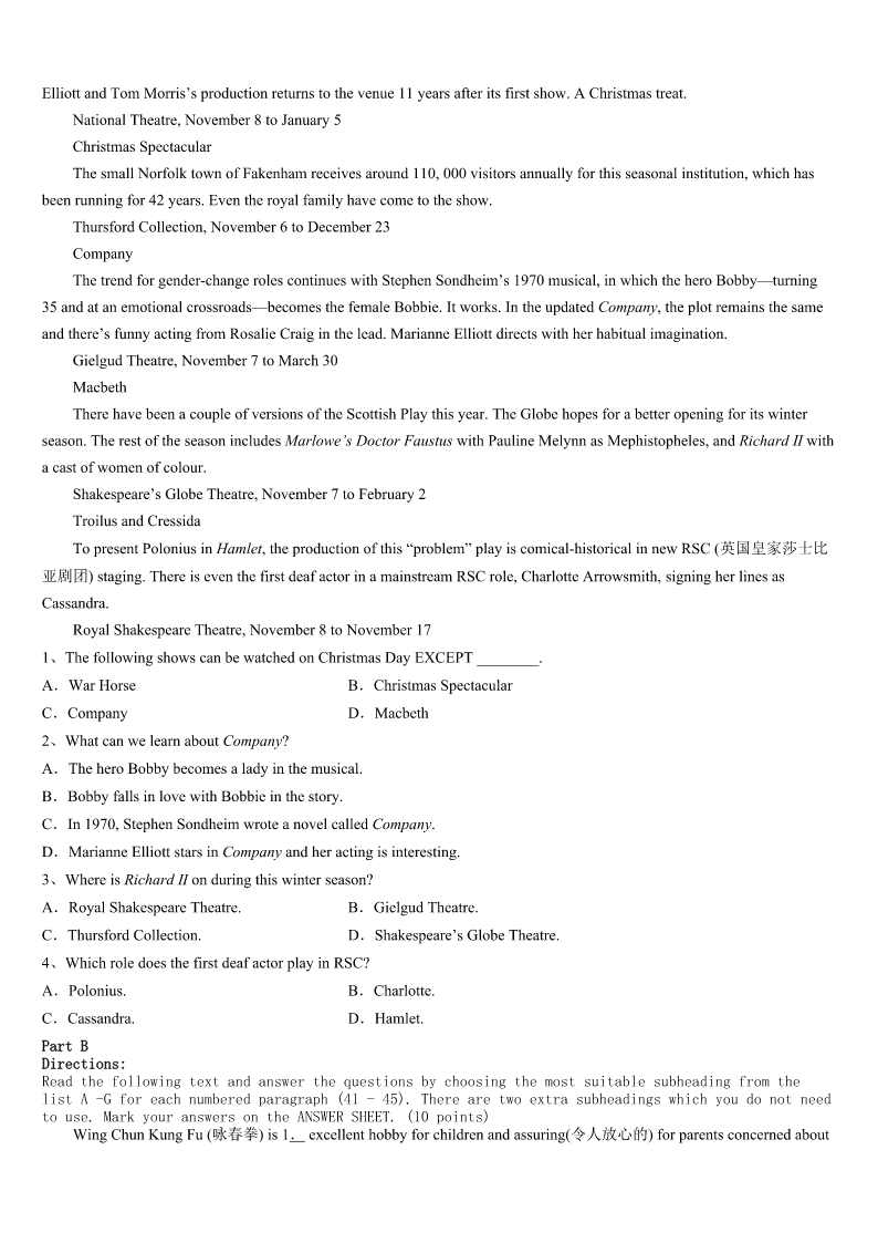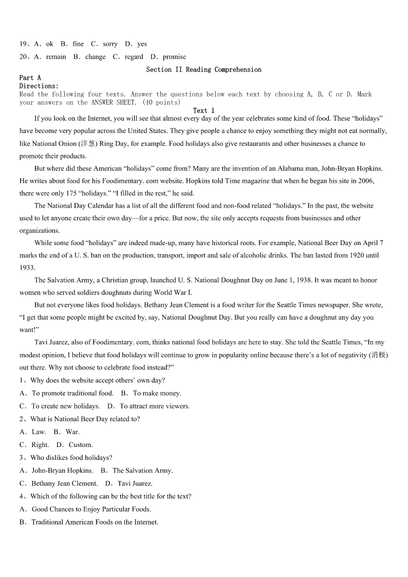 考研《英语一》黑龙江省佳木斯市抚远县2023年深度预测试题 SectionIUseofEnglish Directions: Readthefollowingtext.Choosethebestword(s)foreachnumberedblankandmarkA,B,CorDonthe ANSWERSHEET.(10points) AnewfamilymovedinnextdoorandIgottomeetthemotherofthefamily,Lydia. Lydiaisa(an)1.Westartedtalking,andshewas2abouthowbadherEnglishwas,butIdidn’tcare.Iknewhow harditwasto3asecondlanguage.IenjoyedchattingwithLydiaaswewatchedourkidsplay. Itwaswhatcamenextthat4me:LydiaaskedifI’dbe5tohelpherwithherEnglish. Now,Iamnotateacher.ButI6teachers,andI’mgratefulforteachers,andit’sbecauseIadmirewhattheydoso muchthatIwasvery,very7thatIcouldn’tdoitmyself. ButLydiawassurethatshewantedmyhelp.Iwas8.Iwasn’tsuremy“help”waseven9beingcalledbythat name. 10becausesheaskedme,Isaid“yes.” Andthatwasthebeginningofourfriendship.LydiaandIspentafternoonssittingtogether.Sheaskedmequestionswhen shehadthem-questionsabout11,butalsoquestionsaboutthenewcultureshefoundherselfin.12,Iaskedmyown questions,growing13aboutherhomecountryandculture.We14overoursharedfaithandourstrugglesasmothers. WhenIcomplimented(恭维)her15,shebegantoteachmeaboutKoreanfood,16leadingtoasharedtriptoexplore theKoreangrocerystoresinourcity. BecauseofLydia,IlearnedmoreaboutmyownhometownthanI17couldhavelearnedbymyself. I’mstillnotsurethatI’manygoodasa18.ButI’mgratefulIsaid“19”whenmyneighboraskedmetohelpher withherEnglish.Thatmeantspendingextratimewithmyneighbor,andthatextratimemeantshedidn’t20justmy neighbor.Shebecamemyfriend. 1、A.AmericanB.KoreanC.nativeD.woman 2、A.confidentB.upsetC.apologeticD.concerned 3、A.understandB.rememberC.teachD.master 4、A.shockedB.struckC.challengedD.grasped 5、A.willingB.readyC.nervousD.grateful 6、A.hateB.fearC.thankD.admire 7、A.sadB.anxiousC.sureD.uncertain 8、A.doubtfulB.faithfulC.enthusiasticD.optimistic 9、A.worthB.uselessC.fruitfulD.rewarding 10、A.AndB.SoC.YetD.Or 11、A.lifeB.languageC.studyD.family 12、A.InadditionB.InturnC.InreturnD.Insuccession 13、A.passionateB.curiousC.worriedD.excited 14、A.arguedB.combinedC.separatedD.bonded 15、A.skillB.study