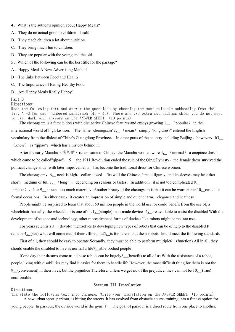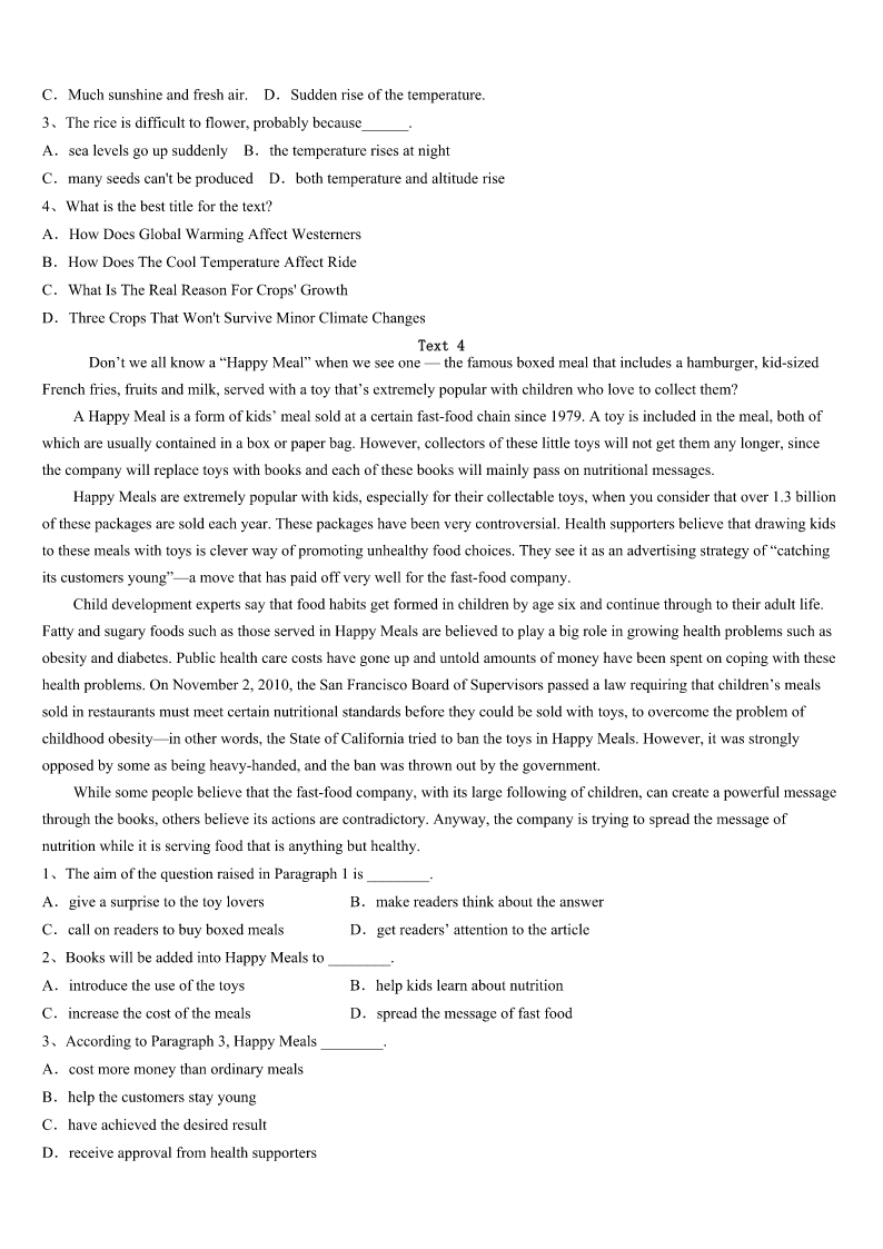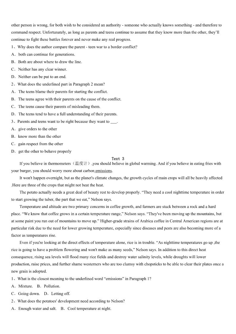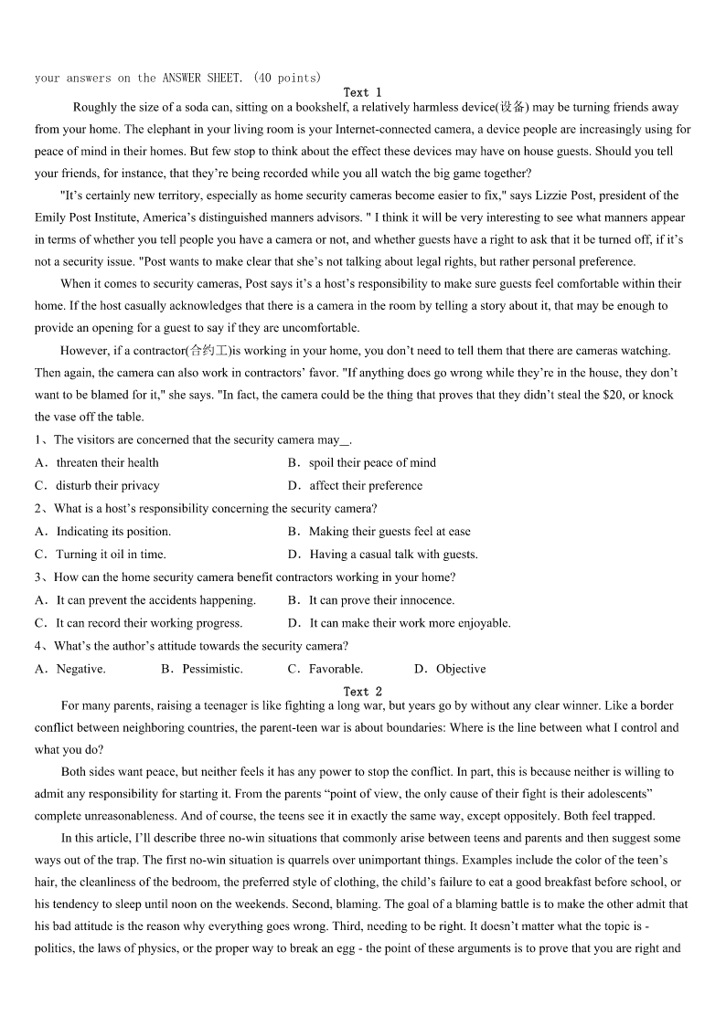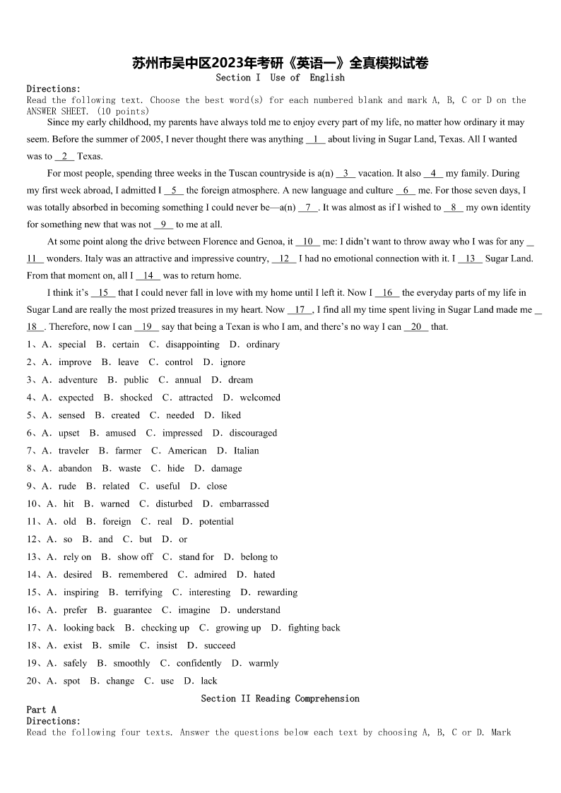 苏州市吴中区2023年考研《英语一》全真模拟试卷 SectionIUseofEnglish Directions: Readthefollowingtext.Choosethebestword(s)foreachnumberedblankandmarkA,B,CorDonthe ANSWERSHEET.(10points) Sincemyearlychildhood,myparentshavealwaystoldmetoenjoyeverypartofmylife,nomatterhowordinaryitmay seem.Beforethesummerof2005,Ineverthoughttherewasanything1aboutlivinginSugarLand,Texas.AllIwanted wasto2Texas. Formostpeople,spendingthreeweeksintheTuscancountrysideisa(n)3vacation.Italso4myfamily.During myfirstweekabroad,IadmittedI5theforeignatmosphere.Anewlanguageandculture6me.Forthosesevendays,I wastotallyabsorbedinbecomingsomethingIcouldneverbe—a(n)7.ItwasalmostasifIwishedto8myownidentity forsomethingnewthatwasnot9tomeatall. AtsomepointalongthedrivebetweenFlorenceandGenoa,it10me:Ididn’twanttothrowawaywhoIwasforany 11wonders.Italywasanattractiveandimpressivecountry,12Ihadnoemotionalconnectionwithit.I13SugarLand. Fromthatmomenton,allI14wastoreturnhome. Ithinkit’s15thatIcouldneverfallinlovewithmyhomeuntilIleftit.NowI16theeverydaypartsofmylifein SugarLandarereallythemostprizedtreasuresinmyheart.Now17,IfindallmytimespentlivinginSugarLandmademe 18.Therefore,nowIcan19saythatbeingaTexaniswhoIam,andthere’snowayIcan20that. 1、A.specialB.certainC.disappointingD.ordinary 2、A.improveB.leaveC.controlD.ignore 3、A.adventureB.publicC.annualD.dream 4、A.expectedB.shockedC.attractedD.welcomed 5、A.sensedB.createdC.neededD.liked 6、A.upsetB.amusedC.impressedD.discouraged 7、A.travelerB.farmerC.AmericanD.Italian 8、A.abandonB.wasteC.hideD.damage 9、A.rudeB.relatedC.usefulD.close 10、A.hitB.warnedC.disturbedD.embarrassed 11、A.oldB.foreignC.realD.potential 12、A.soB.andC.butD.or 13、A.relyonB.showoffC.standforD.belongto 14、A.desiredB.rememberedC.admiredD.hated 15、A.inspiringB.terrifyingC.interestingD.rewarding 16、A.preferB.guaranteeC.imagineD.understand 17、A.lookingbackB.checkingupC.growingupD.fightingback 18、A.existB.smileC.insistD.succeed 19、A.safelyB.smoothlyC.confidentlyD.warmly 20、A.spotB.changeC.useD.lack SectionIIReadingComprehension