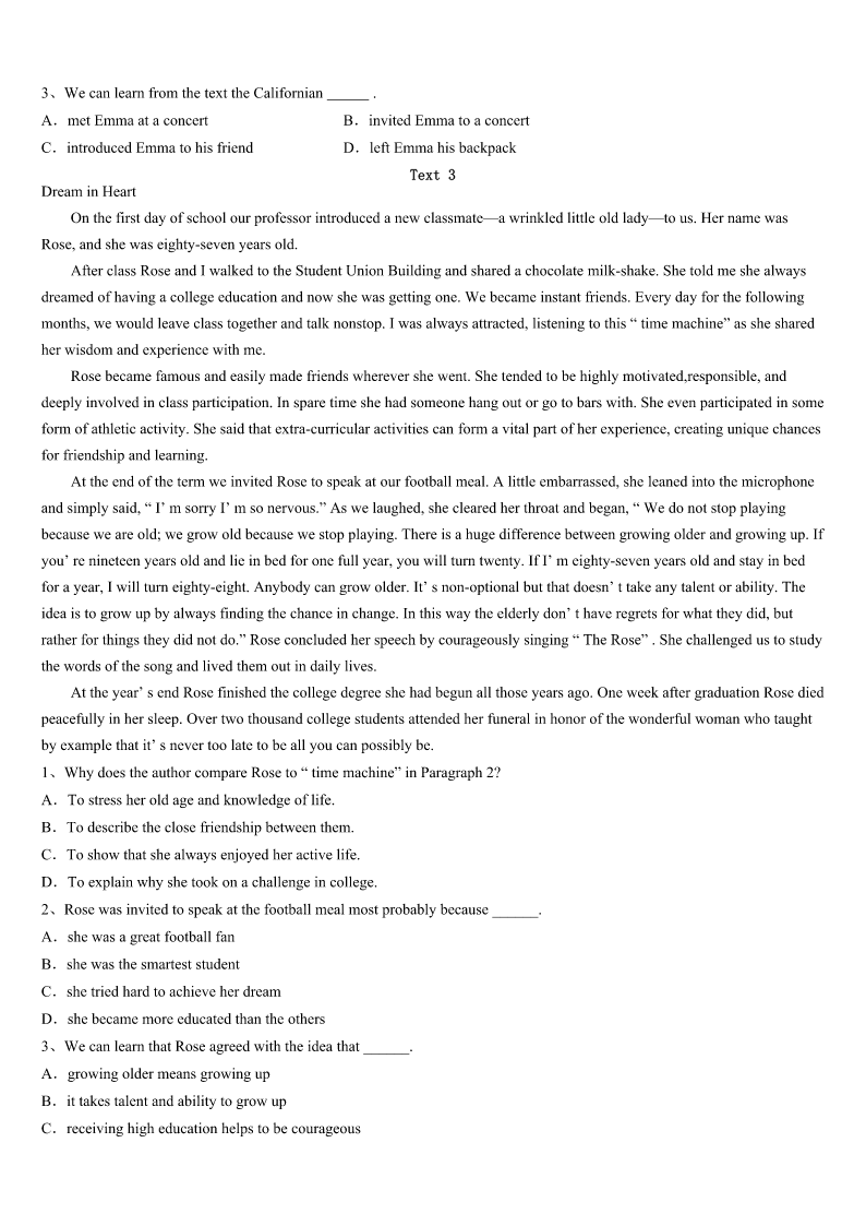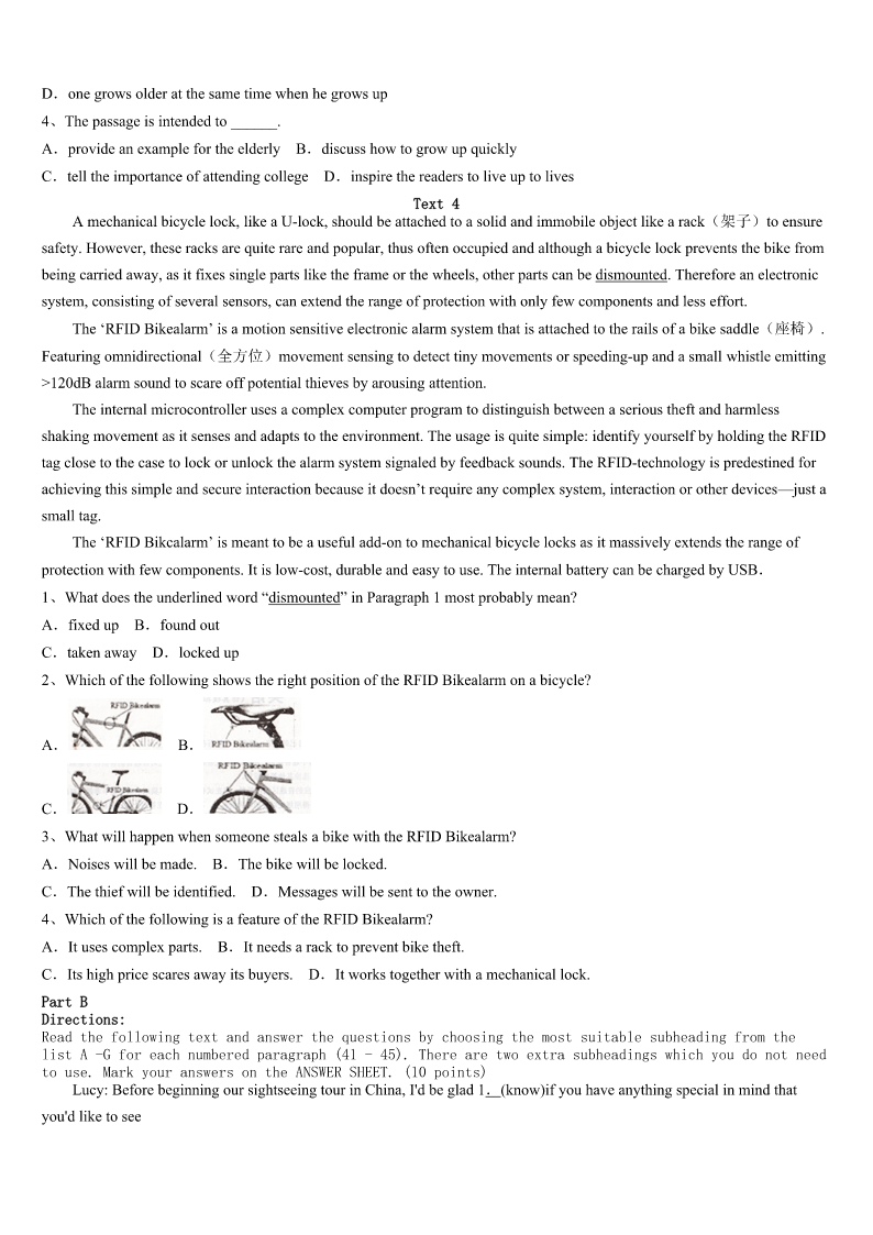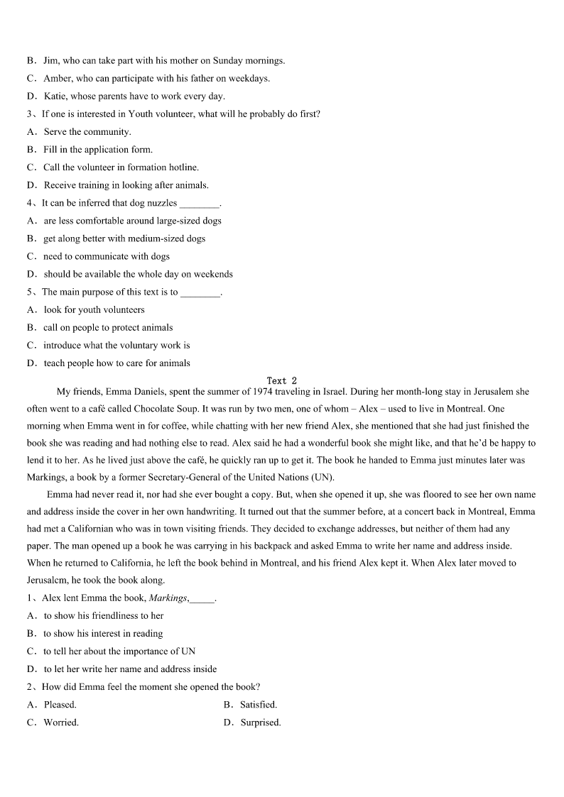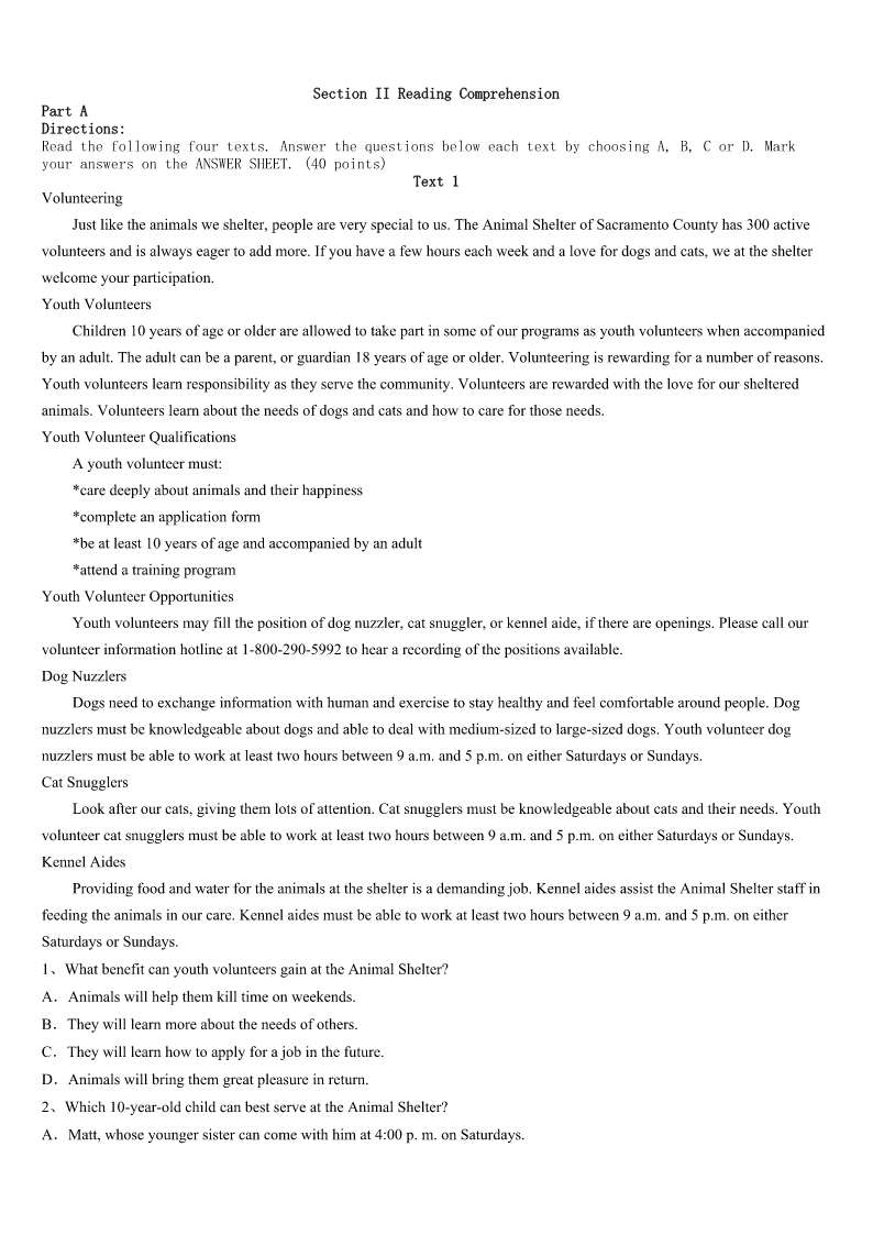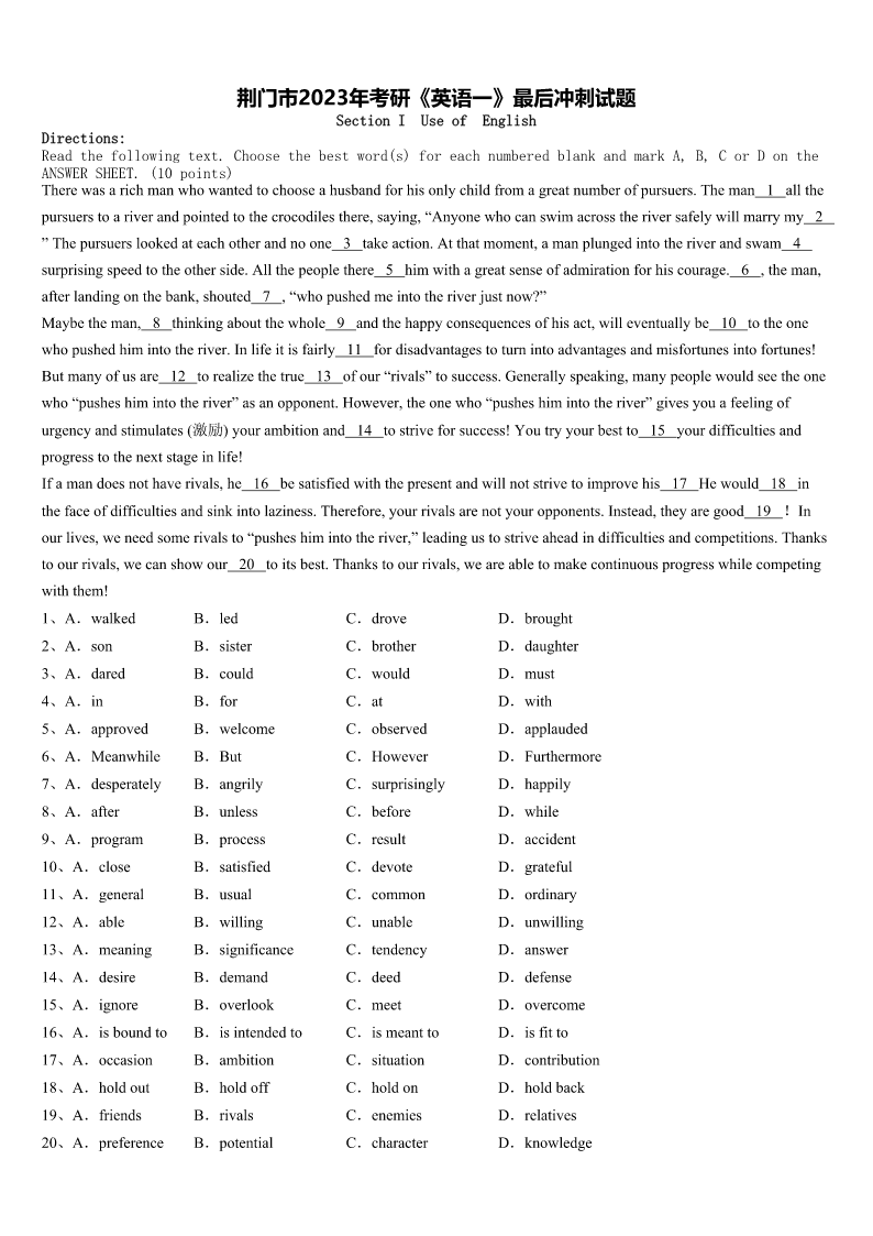 荆门市2023年考研《英语一》最后冲刺试题 SectionIUseofEnglish Directions: Readthefollowingtext.Choosethebestword(s)foreachnumberedblankandmarkA,B,CorDonthe ANSWERSHEET.(10points) Therewasarichmanwhowantedtochooseahusbandforhisonlychildfromagreatnumberofpursuers.Theman1allthe pursuerstoariverandpointedtothecrocodilesthere,saying,“Anyonewhocanswimacrosstheriversafelywillmarrymy2 ”Thepursuerslookedateachotherandnoone3takeaction.Atthatmoment,amanplungedintotheriverandswam4 surprisingspeedtotheotherside.Allthepeoplethere5himwithagreatsenseofadmirationforhiscourage.6,theman, afterlandingonthebank,shouted7,“whopushedmeintotheriverjustnow?” Maybetheman,8thinkingaboutthewhole9andthehappyconsequencesofhisact,willeventuallybe10totheone whopushedhimintotheriver.Inlifeitisfairly11fordisadvantagestoturnintoadvantagesandmisfortunesintofortunes! Butmanyofusare12torealizethetrue13ofour“rivals”tosuccess.Generallyspeaking,manypeoplewouldseetheone who“pusheshimintotheriver”asanopponent.However,theonewho“pusheshimintotheriver”givesyouafeelingof urgencyandstimulates(激励)yourambitionand14tostriveforsuccess!Youtryyourbestto15yourdifficultiesand progresstothenextstageinlife! Ifamandoesnothaverivals,he16besatisfiedwiththepresentandwillnotstrivetoimprovehis17Hewould18in thefaceofdifficultiesandsinkintolaziness.Therefore,yourrivalsarenotyouropponents.Instead,theyaregood19!In ourlives,weneedsomerivalsto“pusheshimintotheriver,”leadingustostriveaheadindifficultiesandcompetitions.Thanks toourrivals,wecanshowour20toitsbest.Thankstoourrivals,weareabletomakecontinuousprogresswhilecompeting withthem! 1、A.walkedB.ledC.droveD.brought 2、A.sonB.sisterC.brotherD.daughter 3、A.daredB.couldC.wouldD.must 4、A.inB.forC.atD.with 5、A.approvedB.welcomeC.observedD.applauded 6、A.MeanwhileB.ButC.HoweverD.Furthermore 7、A.desperatelyB.angrilyC.surprisinglyD.happily 8、A.afterB.unlessC.beforeD.while 9、A.programB.processC.resultD.accident 10、A.closeB.satisfiedC.devoteD.grateful 11、A.generalB.usualC.commonD.ordinary 12、A.ableB.willingC.unableD