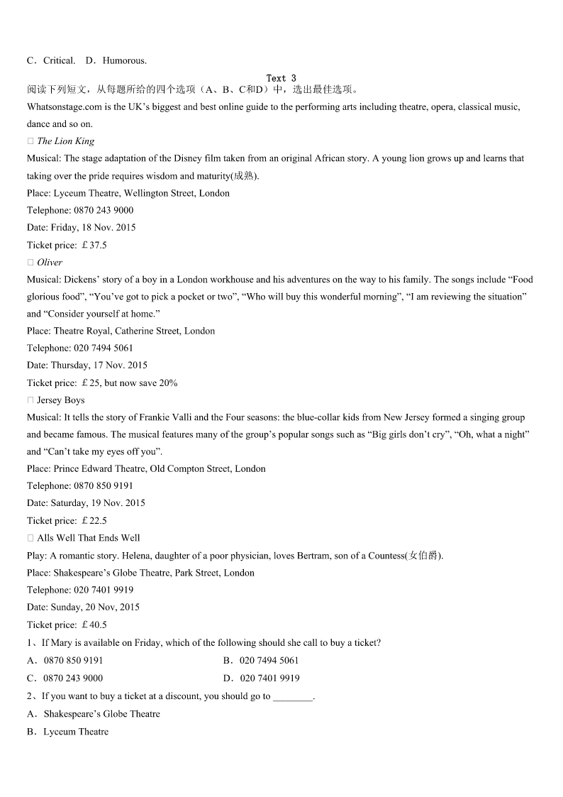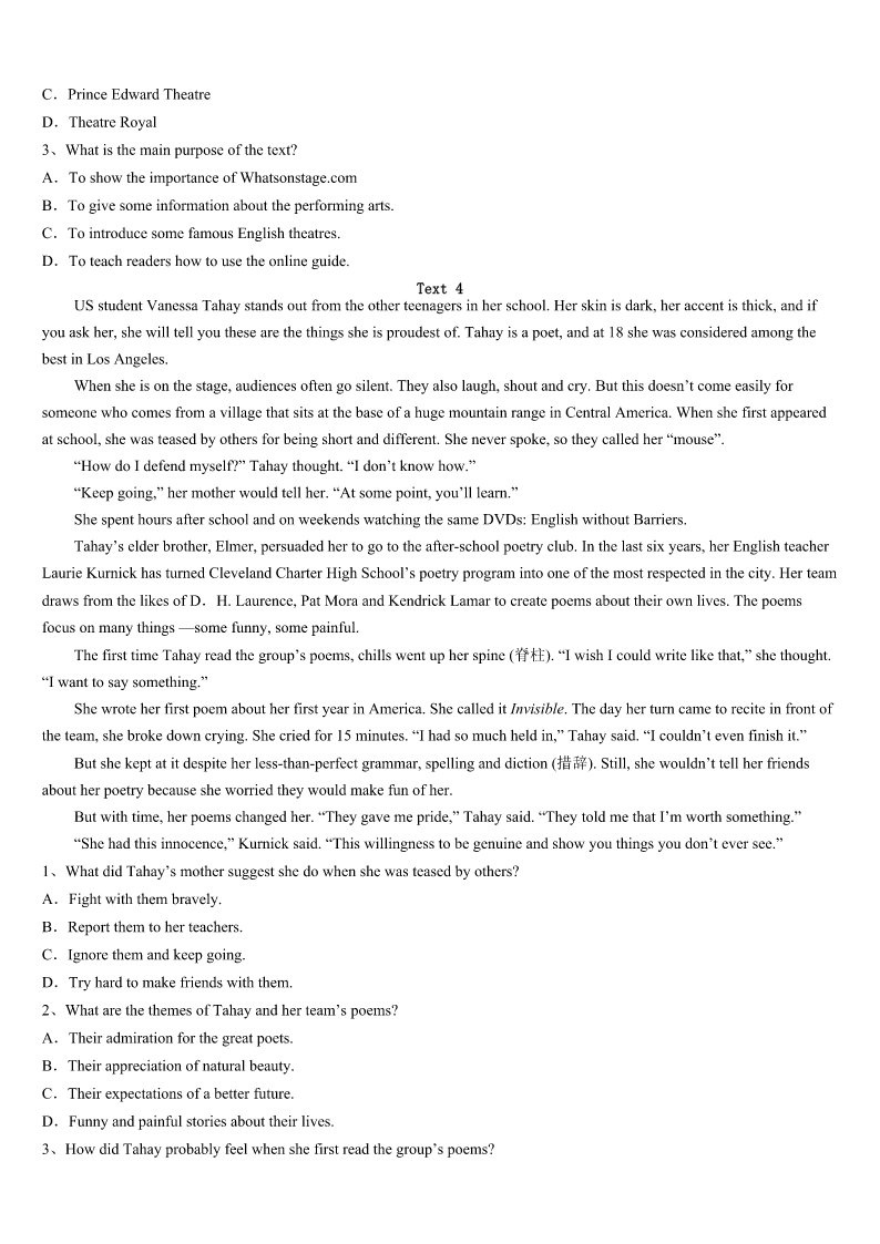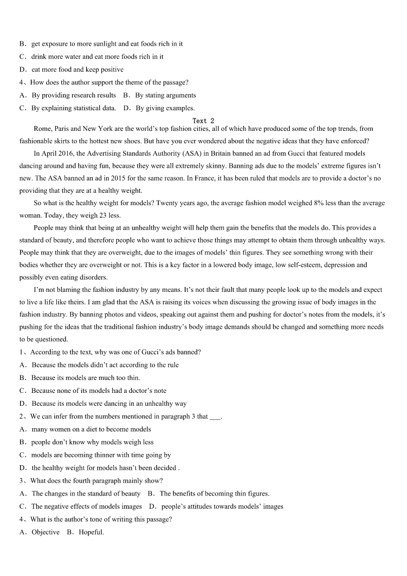 考研《英语一》齐齐哈尔市讷河市2023年预测密卷 SectionIUseofEnglish Directions: Readthefollowingtext.Choosethebestword(s)foreachnumberedblankandmarkA,B,CorDonthe ANSWERSHEET.(10points) “Mom,Idon’tlikeyou,”mytwo-year-oldsonsaid. “Okay...isthat1youloveme?”Iasked. “No,you’renotlovely.” Thatnight,asIwashedmyface,I2alittlelongerinthemirror—notbecauseIwashurtbyhis3,butbecauseI noticedtherewasnolightinmy4. Itookoutapenandstartedwritingalist—alistto5myself;alisttoputsparkle(火花)backintomyeyes.Ionce mademanylistsbut6accomplishedanything.Thistimewouldbe7! ThefirstgoalonmylistIwantedtoachievewas8aPolarPlungetoraisemoneyfortheSpecialOlympics.Onthat day,whenI9intomy1980sworkoutclothes,Jacksmiled,“Mom,youlook10.”Maybe,justmaybesomelight11 myeyes. WhencomingoutofthecoldlakeIfelthappyandproud.Ikeptscreaming,“I12it!”Butoneofthemostexciting partsofthedaywaswhenIstoodinfrontofmy13,whichwastapedontherefrigeratordoor.I14itemnumberone. Withthat,Ibegantotakebackmylife. EveryonetakingpartinthePolarPlungereceiveda15.WheneverIworeit,Jackasked,“IsthatyourPolarPlunge clothing?”Ianswered16,“Yes!”“Iwanttodothattoo.”IwashappyherememberedIjumpedintoa17lake,andthat hewantedtodoactivitieswithme. Witheach18crossedoff(划掉)thelist,apieceofmyselfis19.NotonlyamIshowingmyfamilyit’s importantto20,butI’mshowingmyselfthatI’mworthit. 1、A.howB.whereC.whetherD.because 2、A.washedB.lookedC.stayedD.felt 3、A.behaviorB.statementC.questionD.rudeness 4、A.faceB.lifeC.eyesD.thoughts 5、A.defeatB.saveC.explainD.teach 6、A.seldomB.alwaysC.yetD.almost 7、A.completeB.similarC.unforgettableD.different 8、A.learningfromB.settingupC.lookingintoD.participatingin 9、A.jumpedB.changedC.ranD.burst 10、A.nervousB.calmC.prettyD.cold 11、A.slidawayB.approachedtoC.gotoutofD.camebackto 12、A.didB.gotC.missedD.appreciated 13、A.mirrorB.sonC.listD.photo 14、A.tickedB.addedC.builtD.enlarged 15、A.souvenirB.medalC.capD.shirt 16、A.patientlyB.embarrassinglyC.proudlyD.unwillingly 17、A.hugeB.freezingC.beautifulD.deep 18、A.letterB.dateC.nameD.goal 19、A.returningB.disappearingC.