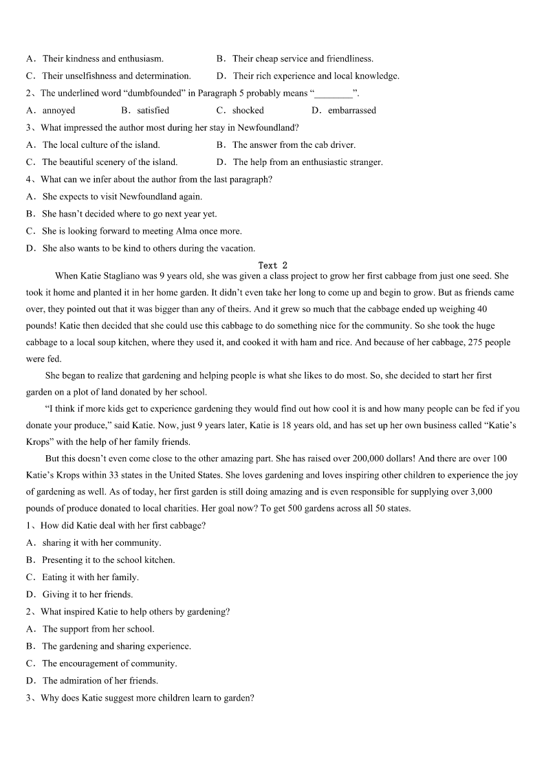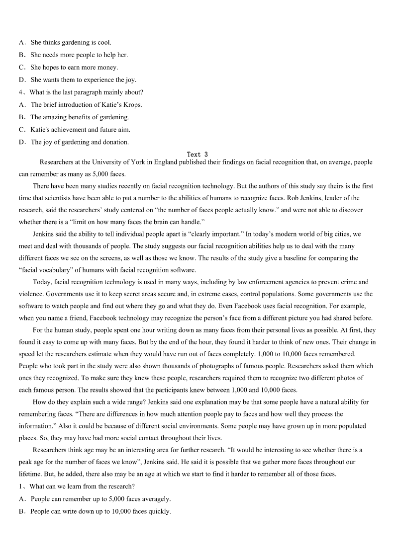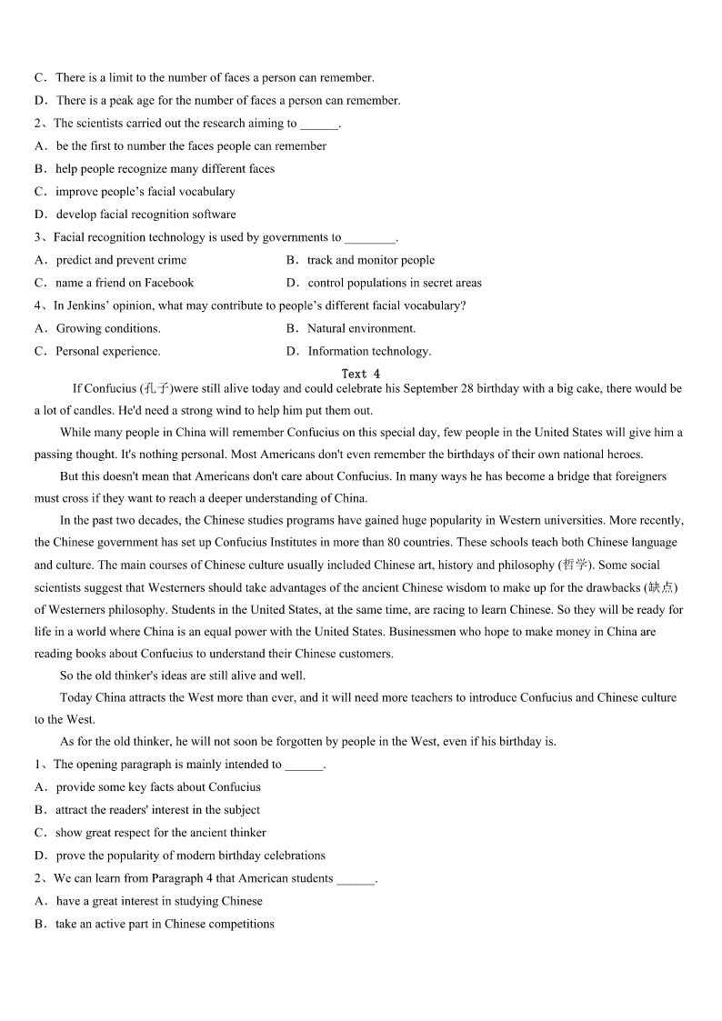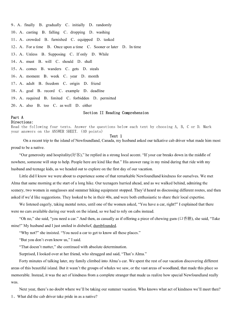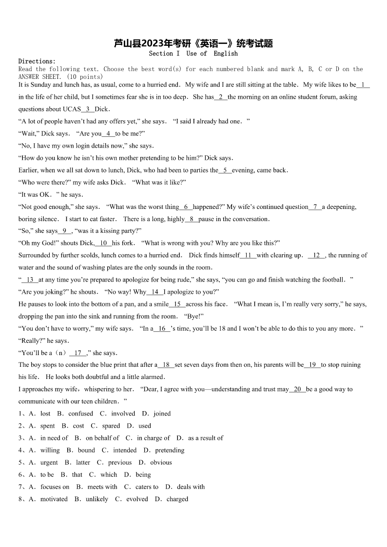 芦山县2023年考研《英语一》统考试题 SectionIUseofEnglish Directions: Readthefollowingtext.Choosethebestword(s)foreachnumberedblankandmarkA,B,CorDonthe ANSWERSHEET.(10points) ItisSundayandlunchhas,asusual,cometoahurriedend.MywifeandIarestillsittingatthetable.Mywifelikestobe1 inthelifeofherchild,butIsometimesfearsheisintoodeep.Shehas2themorningonanonlinestudentforum,asking questionsaboutUCAS3Dick. “Alotofpeoplehaven’thadanyoffersyet,”shesays.“IsaidIalreadyhadone.” “Wait,”Dicksays.“Areyou4tobeme?” “No,Ihavemyownlogindetailsnow,”shesays. “Howdoyouknowheisn’thisownmotherpretendingtobehim?”Dicksays. Earlier,whenweallsatdowntolunch,Dick,whohadbeentopartiesthe5evening,cameback. “Whowerethere?”mywifeasksDick.“Whatwasitlike?” “ItwasOK.”hesays. “Notgoodenough,”shesays.“Whatwastheworstthing6happened?”Mywife’scontinuedquestion7adeepening, boringsilence.Istarttoeatfaster.Thereisalong,highly8pauseintheconversation. “So,”shesays9,“wasitakissingparty?” “OhmyGod!”shoutsDick,10hisfork.“Whatiswrongwithyou?Whyareyoulikethis?” Surroundedbyfurtherscolds,lunchcomestoahurriedend.Dickfindshimself11withclearingup.12,therunningof waterandthesoundofwashingplatesaretheonlysoundsintheroom. “13atanytimeyou’repreparedtoapologizeforbeingrude,”shesays,“youcangoandfinishwatchingthefootball.” “Areyoujoking?”heshouts.“Noway!Why14Iapologizetoyou?” Hepausestolookintothebottomofapan,andasmile15acrosshisface.“WhatImeanis,I’mreallyverysorry,”hesays, droppingthepanintothesinkandrunningfromtheroom.“Bye!” “Youdon’thavetoworry,”mywifesays.“Ina16’stime,you’llbe18andIwon’tbeabletodothistoyouanymore.” “Really?”hesays. “You’llbea(n)17,”shesays. Theboystopstoconsidertheblueprintthataftera18setsevendaysfromthenon,hisparentswillbe19tostopruining hislife.Helooksbothdoubtfulandalittlealarmed. Iapproachesmywife,whisperingtoher.“Dear,Iagreewithyou—understandingandtrustmay20beagoodwayto communicatewithourteenchildren.” 1、A.lostB.confusedC.involvedD.joined 2、A.spentB.costC.sparedD.used 3、A.inneedofB.onbehalfofC.inchargeofD.asaresultof 4、A.w