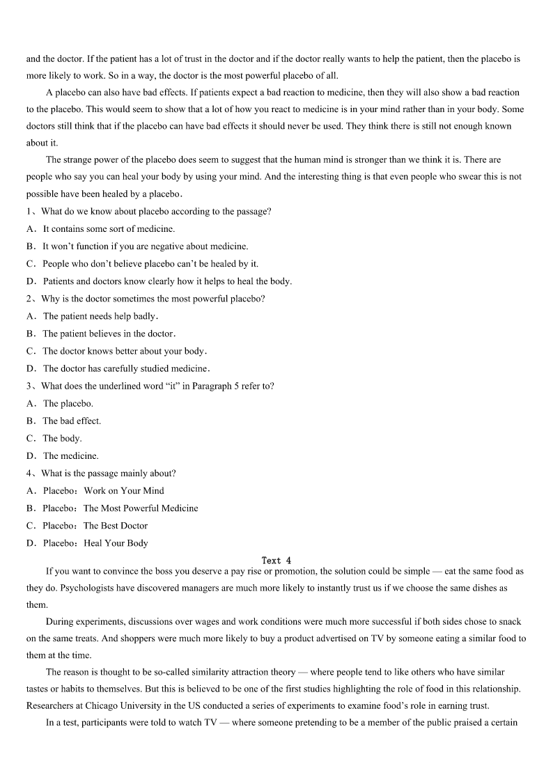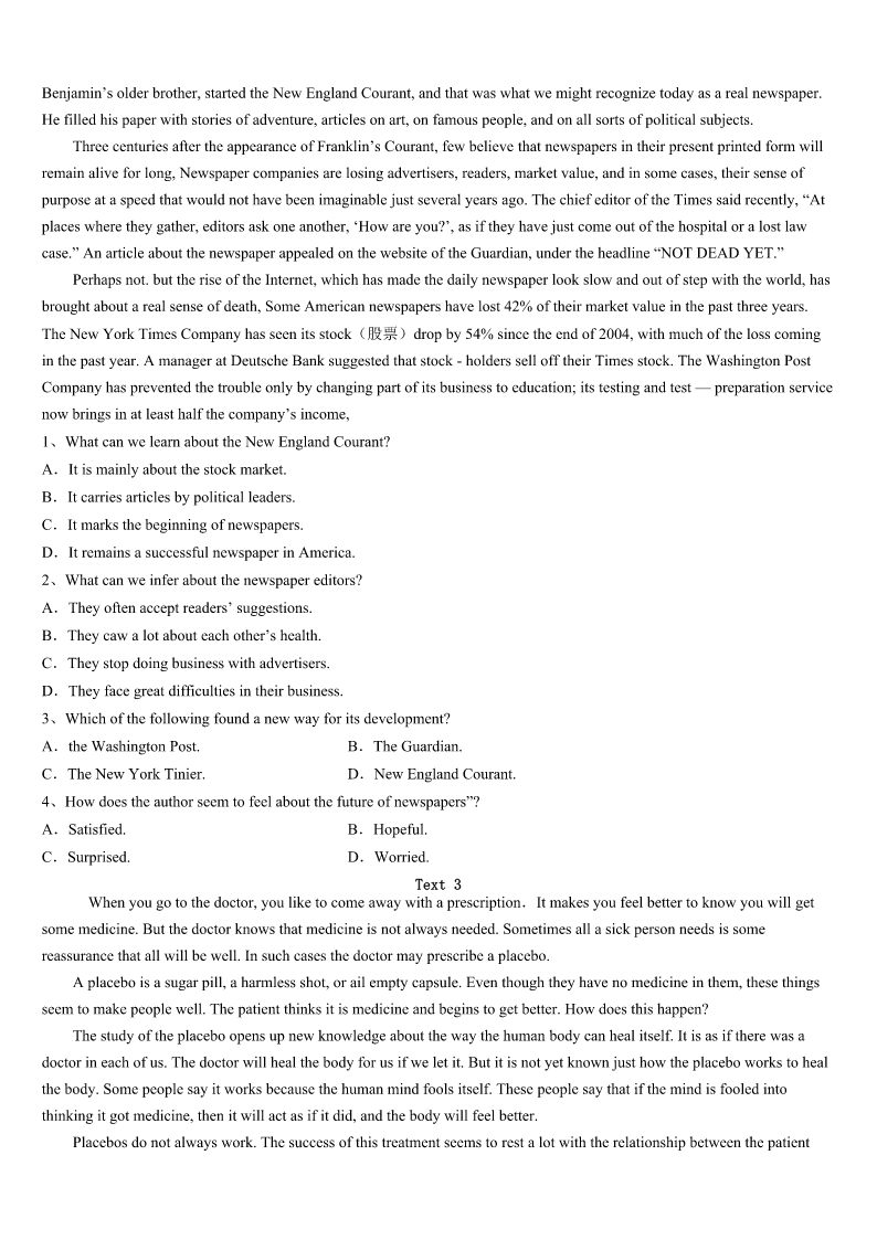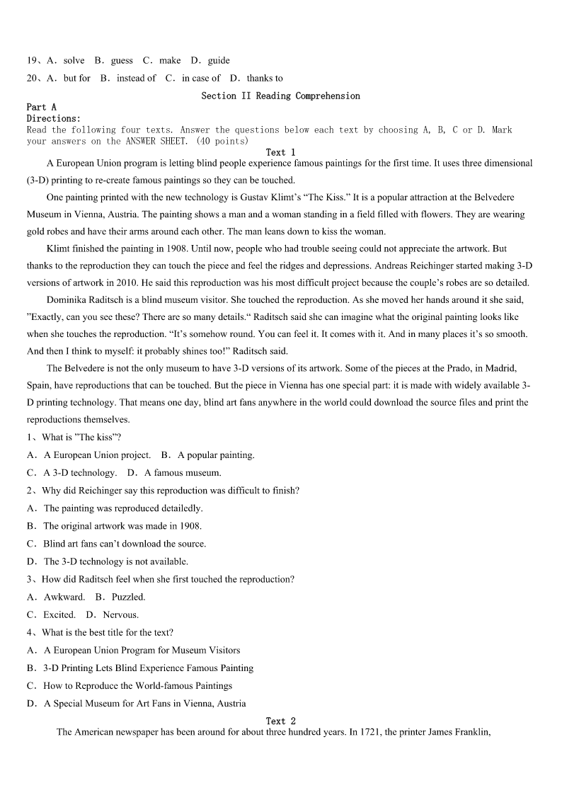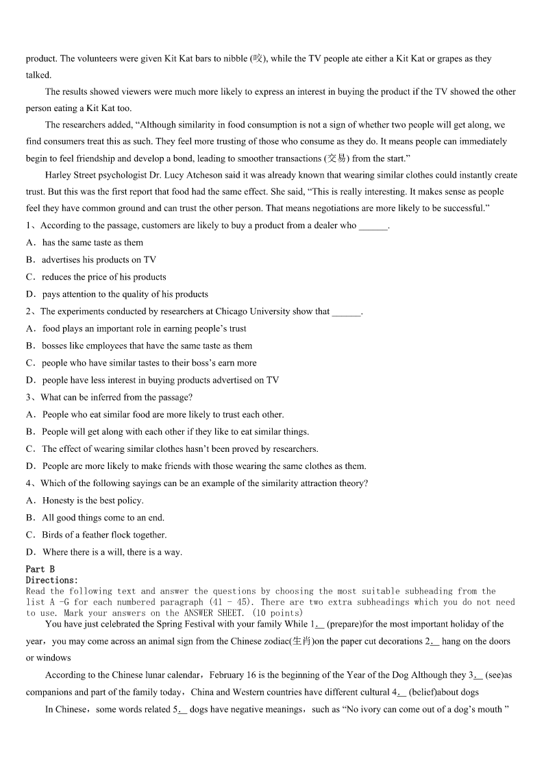 腾冲县2023年考研《英语一》考前冲刺试题 SectionIUseofEnglish Directions: Readthefollowingtext.Choosethebestword(s)foreachnumberedblankandmarkA,B,CorDonthe ANSWERSHEET.(10points) BillGatesdoesn’tpretendhelivesinanequalhousehold.Whenit1parentinghisthreechildren,thebillionaireadmits hiswifeMelindahasdonemorethanher2oftheworkraisingthekids. Gatesspenttwoyearstakingmathandcomputersciencecourses,butnever3hisdegree.“Myeldestdaughter graduatesfromStanfordinJune,soI’m4shewon’tfallintomyfootsteps.”Gatesjoked. Gatessaidheandhiswifehavebeenquitecautiousaboutthe5they’veusedtoraisetheirthreechildren.Hesaysthe couple6a1970s“LoveandLogic”parentingmodel.Thecoreideaofthephilosophyiscenteredontheideathattaking emotionalcontrol,essentiallyreducingemotional7likeshoutingorblamingkids,is8forparents. “Oneofthegreatestbenefitsof9LoveandLogicisthatithelpsuslearnhowtokeepatightercontrolonouremotions andonour10.”Gatessaid. Gatesadmitsheandhiswifehaven’tbeenperfectat11theapproach. “Canyougetridoftheemotion?Youcan’t12doit.”hesaid. Besides,theLoveandLogicmodelalso13theimportanceofnotrelyingonrewardsforkids,butinsteadshowing unconditionalloveandpraisingkidsforwhotheyare,notwhattheydo(ordon’t)14,likeapoortestscoreora(n)15 grade. “Manyhighlysuccessfulpeople16withgradesaschildren.”Gatessaid,“What’smostimportantisthatour17 developgoodcharacter,curiosityandproblem-solvingskills.” ThemodelisabitliketheSocraticmethod,18itpushesparentstofocusonaskingquestionsoftheirkidsandgetting themtothinkabouthowto19theirownproblems,20feedingthemanswers. 1、A.devotestoB.looksforwardtoC.comestoD.leadsto 2、A.shareB.sightC.reachD.power 3、A.finishedB.missedC.lostD.purchased 4、A.sorryB.pessimisticC.normalD.optimistic 5、A.theoryB.modelC.practiceD.idea 6、A.evaluatedB.dislikedC.followedD.adapted 7、A.displaysB.apartmentsC.mistakesD.reactions 8、A.expensiveB.usefulC.meaninglessD.familiar 9、A.facingB.lackingC.applyingD.repairing 10、A.mindsB.handsC.eyesD.tongues 11、A.carryingoutB.studyinginC.believinginD.survivingon 12、A.roughlyB.commonlyC.totallyD.g