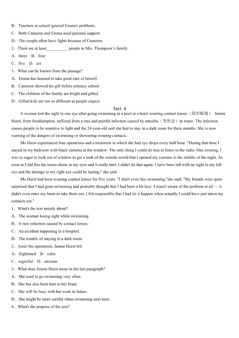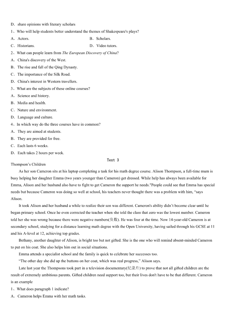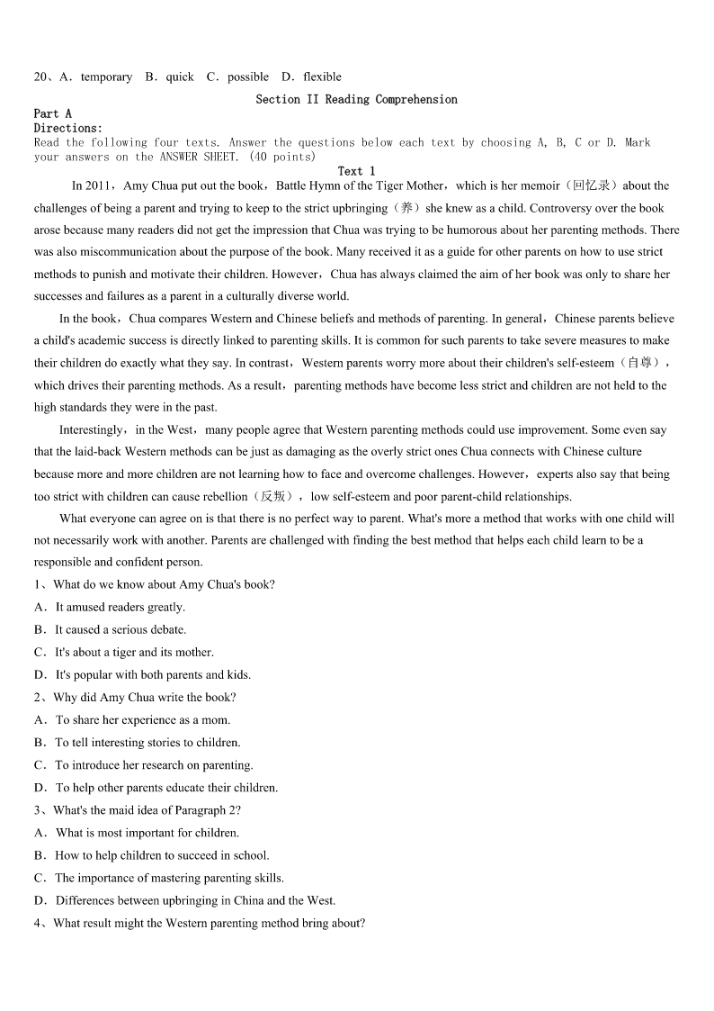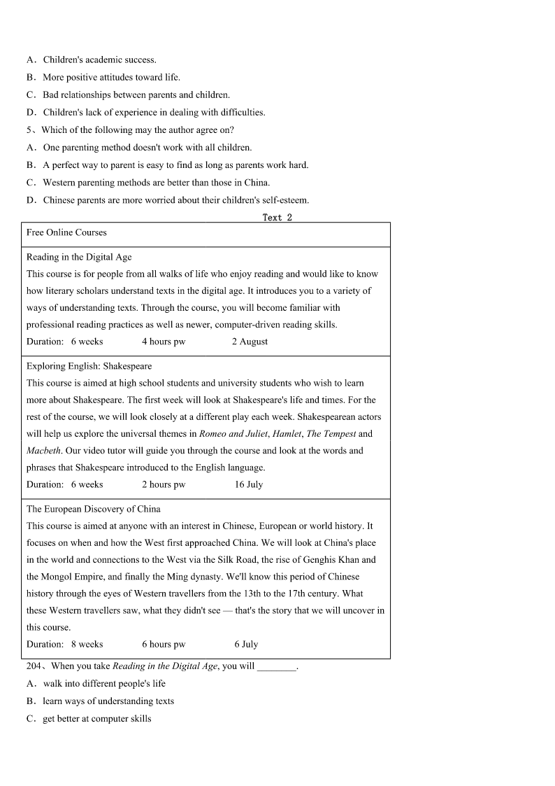 2023年成都市新津县考研《英语一》考前冲刺预测试卷 SectionIUseofEnglish Directions: Readthefollowingtext.Choosethebestword(s)foreachnumberedblankandmarkA,B,CorDonthe ANSWERSHEET.(10points) Ifirststartedwritinginthesummerof1998.BackthenIwasateacher.Afteryearsofdreaming,Idecideditwasfinally timetowriteabook.For10yearsIwrote,1fourmiddlegradenovelsandsixpicturesbooksalmostonlytoeditors.This was2inthesnailmailage.Rememberthe3youexperiencedasachildwaitingforbirthdaypresentstoarriveinthe mail?Thatwasmeforthebetterpartofadecade. InSpring2009,atthelastminute,Idecidedtohandinamiddlegradehistoricalnovelinversetoa4atalocalwriting conference.Iknewinmyheartthatitwasmy5work,butIwasn’tsurehowitwouldbe6alongsidepiecesmeantfor theadultmarket.ButthenIwon.Myprize7aoneononeinterviewwithaneditorwho,after8mymanuscript, asked,“Whydon’tyouhavea(n)9yet?” Notlongafterthat,I10withmyfirstagent.Thenin2013,afterpartingwithmyfirstagent,Iwasagainfacedwiththe 11forrepresentation.ThistimeIsubmittedtothreeagenciesandgottwo12.Overthespanof20years,I’vegot18 completedmanuscriptsandwas13almost350times.Ittookme14yearstoseemyfirstbook14theshelf.Youcould lookatthesenumbersandgetpretty15.Icanlookatthesenumbersandfeelthesame.Iknowplentyofpeoplewitha16 apprenticeship(学徒期).Ihavefriendswhohavebeenmore17.AllsortsofauthorsI18within2012havepublishedfar morethanIhave.Buthere’sthe19thingI’velearnedinthelast20years:Myprocessismine.Myjourneyismine.Each bookfindsitswayonitsown. Thewritinglifeisalongtermjourney.Thereisnorightway.Thereisno20fix.Thereisnoeasyroad.Thereisalot offrustrationanddisappointment,butthereisjoyandsatisfaction,too. 1、A.submittingB.lendingC.keepingD.presenting 2、A.soonB.backC.alreadyD.later 3、A.appreciationB.entertainmentC.anticipationD.embarrassment 4、A.publisherB.newspaperC.receptionD.competition 5、A.initialB.casualC.innovativeD.subjective 6、A.criticizedB.processedC.receivedD.distributed 7、A.followedB.concludedC.ensuredD.confirmed 8、A.correctingB.polishingC.monitoringD.reviewing 9、A.agentB.clientC.instructorD.f