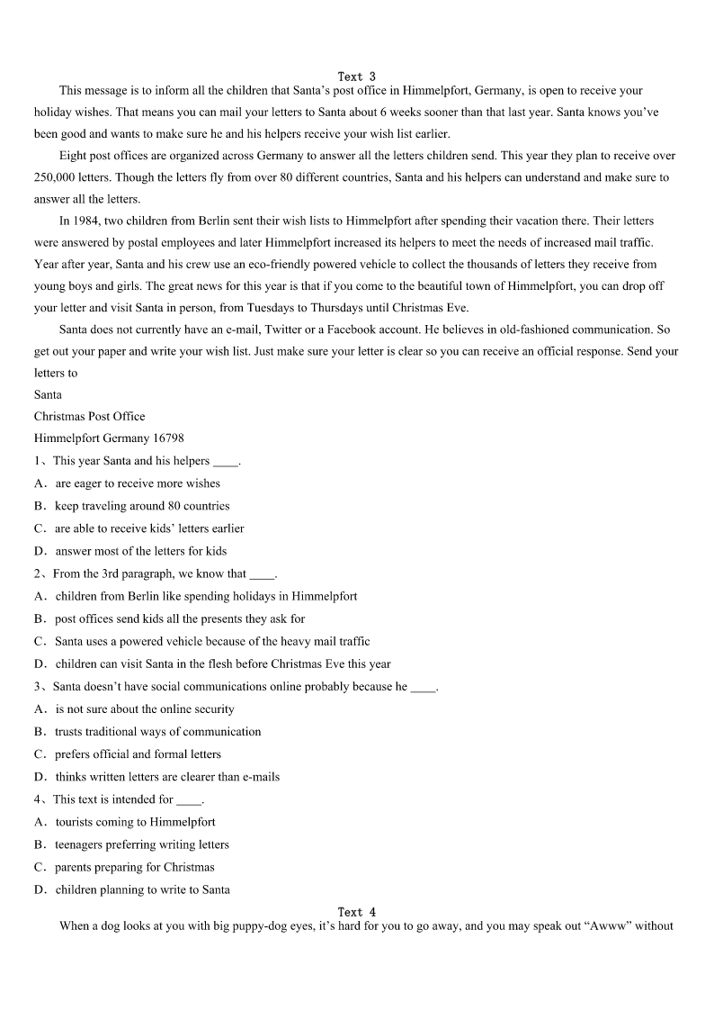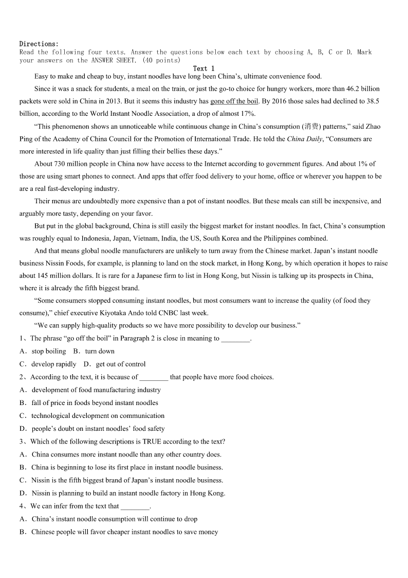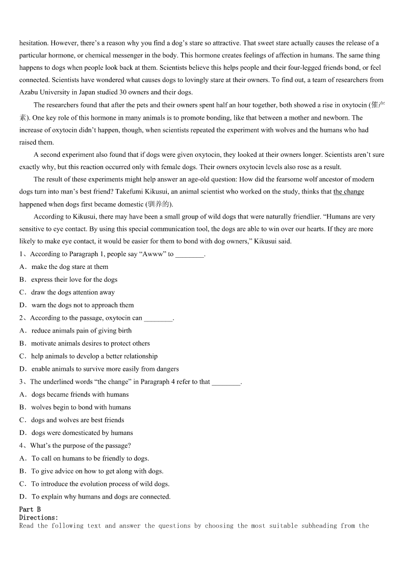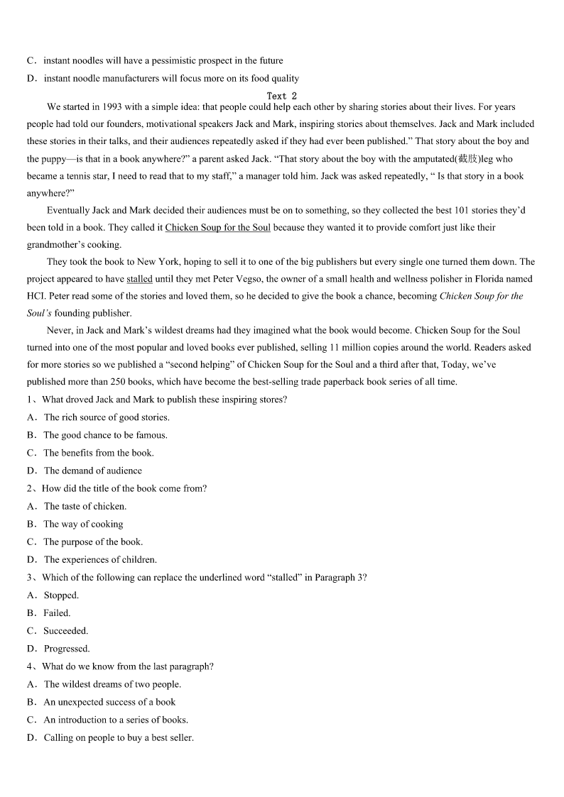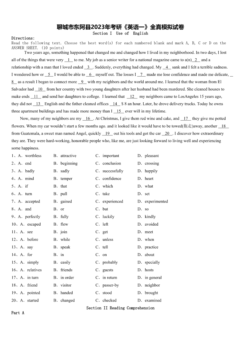 聊城市东阿县2023年考研《英语一》全真模拟试卷 SectionIUseofEnglish Directions: Readthefollowingtext.Choosethebestword(s)foreachnumberedblankandmarkA,B,CorDonthe ANSWERSHEET.(10points) Twoyearsago,somethinghappenedthatchangedmeandchangedhowIlivedinmyneighborhood.Intwodays,Ilost allofthethingsthatwerevery1tome.Myjobasaseniorwriterforanationalmagazinecametoa(n)2anda relationshipwithamanthatIlovedended3.Suddenly,everythinghadchanged.My4sankandIfeltaterriblesadness. Iwonderedhowor5Iwouldbeableto6myselfout.ThelossesI7mademeloseconfidenceandmademedelicate, 8asaresultIbegantoconnectmore9withmyneighborsandtheworldaroundme.IlearnedthatthewomanfromEl Salvadorhad10fromhercountrywithtwoyoungdaughtersafterherhusbandhadbeenmurdered.Shecleanedhousesto makeends11andsendherdaughterstocollege.Ilearnedthat12myneighborscametoLosAngeles15yearsago, theydidnot13Englishandthefathercleanedoffices14$8anhour.Later,hedrovedeliverytrucks.Todayheowns threeapartmentbuildingsandhasmademoremoneythanI15everwillinmylifetime. Now,manyofmyneighborsaremy16.AtChristmas,Igivethemredwineandcake,and17theygivemepotted flowers.Whenmycarwouldn’tstartafewmonthsago.anditlookedlikeitwouldhavetobetowed(拖走)away,another18 fromGuatemala,asweetmannamedAngel,quickly19outhistoolsandgotthecar20.Idiscoverhowextraordinary theyare.Theywerehard-working,honorablepeoplewho,likeme,arejustlookingforwardtolivingwellandexperiencing somehappiness. 1、A.worthlessB.attractiveC.importantD.pleasant 2、A.endB.beginningC.conclusionD.crossing 3、A.badlyB.sadlyC.successfullyD.happily 4、A.mindB.temperC.confidenceD.heart 5、A.ifB.thatC.whichD.what 6、A.turnB.pullC.takeD.set 7、A.acceptedB.gainedC.experiencedD.experimented 8、A.andB.orC.butD.so 9、A.perfectlyB.fullyC.luckilyD.kindly 10、A.escapedB.flewC.leftD.avoided 11、A.seeB.joinC.getD.meet 12、A.beforeB.whileC.unlessD.when 13、A.sayB.speakC.tellD.practice 14、A.forB.inC.onD.about 15、A.simplyB.easilyC.probablyD.specially 16、A.relativesB.friendsC.guestsD.hosts 17、A.inturnB.inorderC.inreturnD.ingeneral 18、A.friendB.visitorC.p