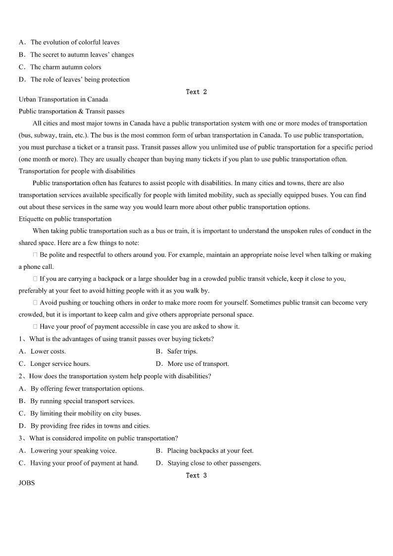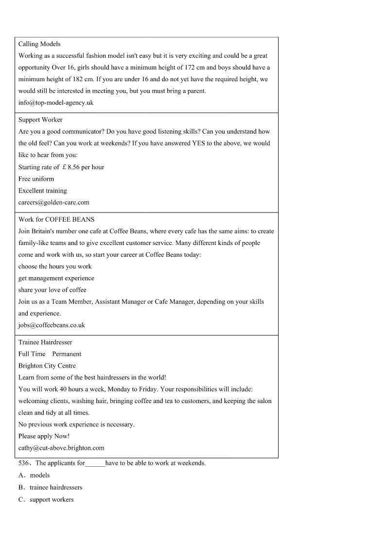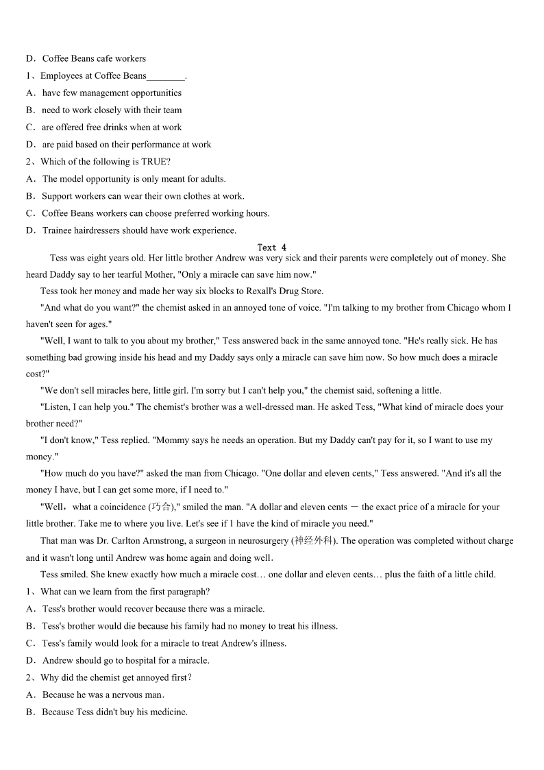 茂县2023年考研《英语一》全真模拟试卷 SectionIUseofEnglish Directions: Readthefollowingtext.Choosethebestword(s)foreachnumberedblankandmarkA,B,CorDonthe ANSWERSHEET.(10points) Iamatimetraveller.Atthemoment,IamtalkingtoyoufromtheDarkAges,where1andtechnologyhasbeen forgotten. Well...not2.ButIdofeelso! Abouttwoandahalfmonthsago,mycomputer3andIhavebeenlivingwithoutoneathome.Themanintherepair shopsaiditwouldbemoreexpensiveto4mycomputerthantobuyanewone! Now,IcanadmitthatIam5totheInternet.Ispendhoursofmy6timeonline.WhenIwastoldmycomputer couldn’tbefixed,Iwas7!Idon’thaveenoughmoneyto8anewoneatthemomentandIwillhavetowait9 December. Ihavebeentryingto10thingtodowithoutacomputer,butitisalotmore11thanIwasexpecting!Igotmyfirst 12whenIwassixoldandIhave13technologyeversince. Thisexperiencehasmademe14justhowusefulcomputersreallyare.IusetheInternetforschoolwork,shopping,and allmybankingisdone15.WithouttheInternet,itfeelslikeyou’re16outonsomething.However,it’snotall17.I amsleepingalotbetternowandIhavebeenbakingalot,whichIlove18neverusedtofindenough19todo. LivingwithoutacomputermaynotbeasIthoughtitwasgoingtobe,butIamreadyto20theDarkAgesandreturnto the21stcentury! 1、A.scienceB.reputationC.communicationD.information 2、A.curiouslyB.exactlyC.violentlyD.angrily 3、A.explodedB.lostC.brokeD.sank 4、A.arrangeB.solveC.combineD.fix 5、A.accustomedB.contributedC.addictedD.devoted 6、A.simpleB.freeC.limitedD.flexible 7、A.sadB.amazedC.puzzledD.nervous 8、A.rentB.buyC.useD.build 9、A.sinceB.afterC.untilD.in 10、A.learnfromB.hearfromC.speakofD.thinkof 11、A.complexB.interestingC.difficultD.surprising 12、A.presentB.computerC.sweaterD.watch 13、A.lovedB.inventedC.discoveredD.changed 14、A.realizeB.possessC.believeD.remember 15、A.outsideB.onlineC.behindD.upstairs 16、A.missingB.takingC.puttingD.holding 17、A.dustyB.carelessC.popularD.bad 18、A.soB.orC.andD.but 19、A.beliefB.courageC.energyD.time 20、A.createB.forgetC.leaveD.prevent SectionIIReadingComprehension PartA Directions: Readthefollowingfourtexts.Answerthequestionsbeloweachte