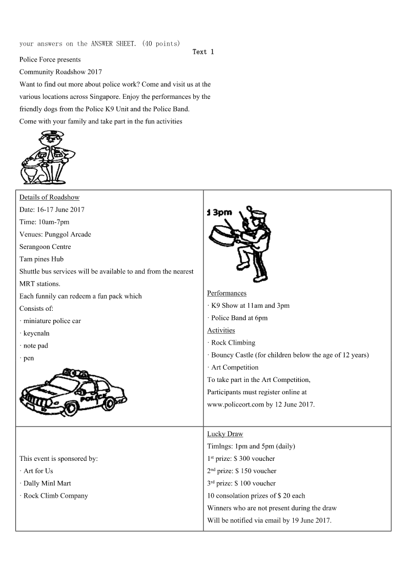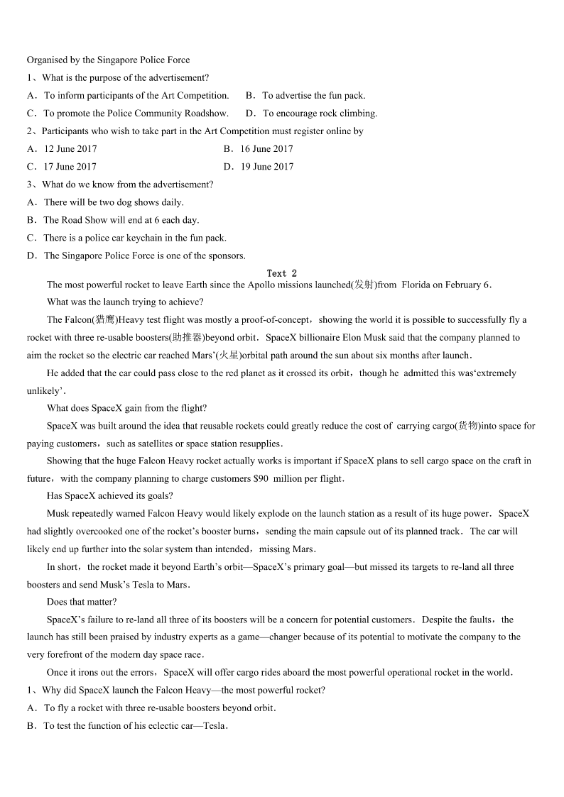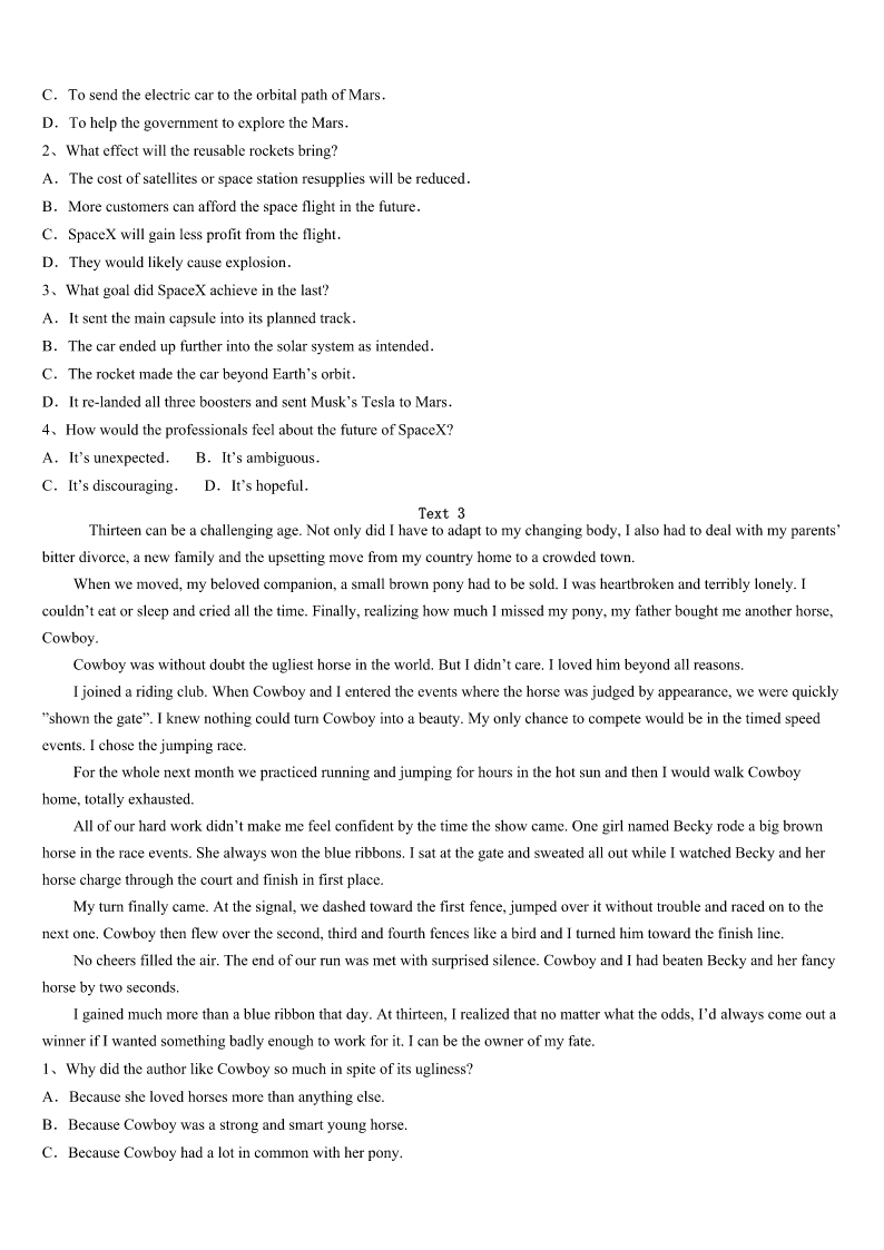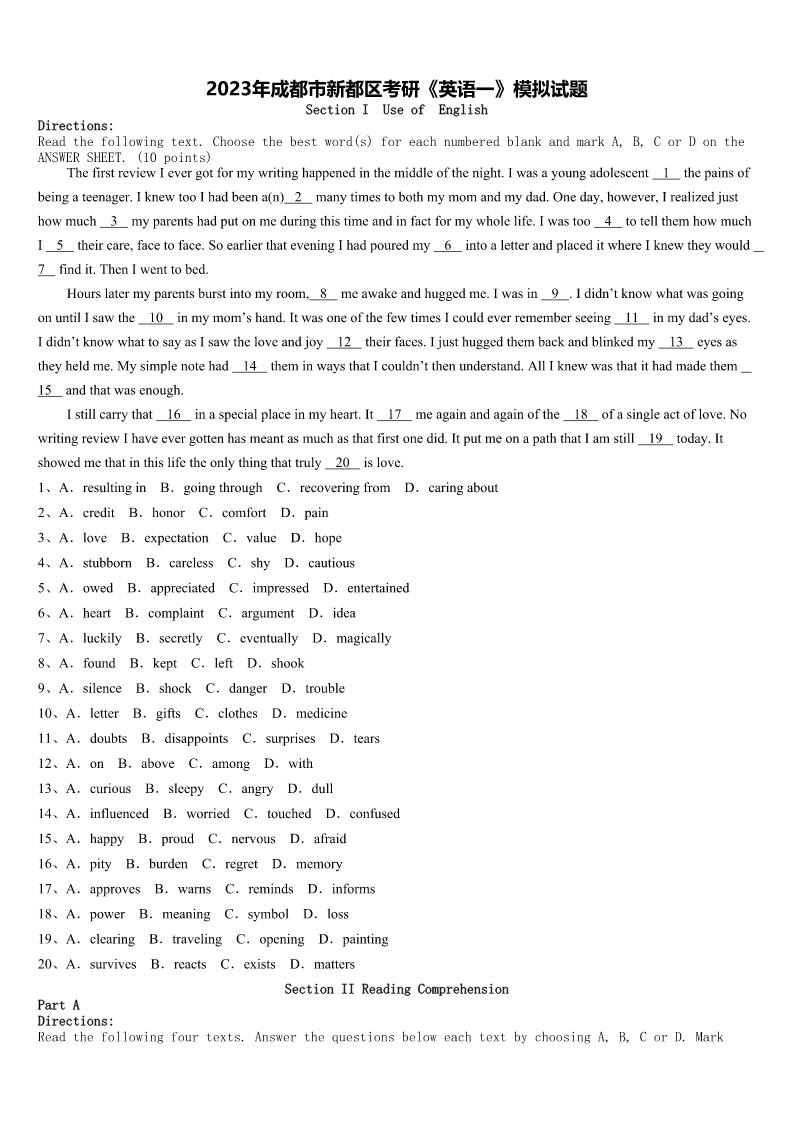 2023年成都市新都区考研《英语一》模拟试题 SectionIUseofEnglish Directions: Readthefollowingtext.Choosethebestword(s)foreachnumberedblankandmarkA,B,CorDonthe ANSWERSHEET.(10points) ThefirstreviewIevergotformywritinghappenedinthemiddleofthenight.Iwasayoungadolescent1thepainsof beingateenager.IknewtooIhadbeena(n)2manytimestobothmymomandmydad.Oneday,however,Irealizedjust howmuch3myparentshadputonmeduringthistimeandinfactformywholelife.Iwastoo4totellthemhowmuch I5theircare,facetoface.SoearlierthateveningIhadpouredmy6intoaletterandplaceditwhereIknewtheywould 7findit.ThenIwenttobed. Hourslatermyparentsburstintomyroom,8meawakeandhuggedme.Iwasin9.Ididn’tknowwhatwasgoing onuntilIsawthe10inmymom’shand.ItwasoneofthefewtimesIcouldeverrememberseeing11inmydad’seyes. Ididn’tknowwhattosayasIsawtheloveandjoy12theirfaces.Ijusthuggedthembackandblinkedmy13eyesas theyheldme.Mysimplenotehad14theminwaysthatIcouldn’tthenunderstand.AllIknewwasthatithadmadethem 15andthatwasenough. Istillcarrythat16inaspecialplaceinmyheart.It17meagainandagainofthe18ofasingleactoflove.No writingreviewIhaveevergottenhasmeantasmuchasthatfirstonedid.ItputmeonapaththatIamstill19today.It showedmethatinthislifetheonlythingthattruly20islove. 1、A.resultinginB.goingthroughC.recoveringfromD.caringabout 2、A.creditB.honorC.comfortD.pain 3、A.loveB.expectationC.valueD.hope 4、A.stubbornB.carelessC.shyD.cautious 5、A.owedB.appreciatedC.impressedD.entertained 6、A.heartB.complaintC.argumentD.idea 7、A.luckilyB.secretlyC.eventuallyD.magically 8、A.foundB.keptC.leftD.shook 9、A.silenceB.shockC.dangerD.trouble 10、A.letterB.giftsC.clothesD.medicine 11、A.doubtsB.disappointsC.surprisesD.tears 12、A.onB.aboveC.amongD.with 13、A.curiousB.sleepyC.angryD.dull 14、A.influencedB.worriedC.touchedD.confused 15、A.happyB.proudC.nervousD.afraid 16、A.pityB.burdenC.regretD.memory 17、A.approvesB.warnsC.remindsD.informs 18、A.powerB.meaningC.symbolD.loss 19、A.clearingB.travelingC.openingD.painting 20、A.survivesB.reactsC.existsD.matters SectionIIReadingComprehension PartA Dire
