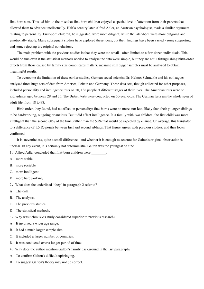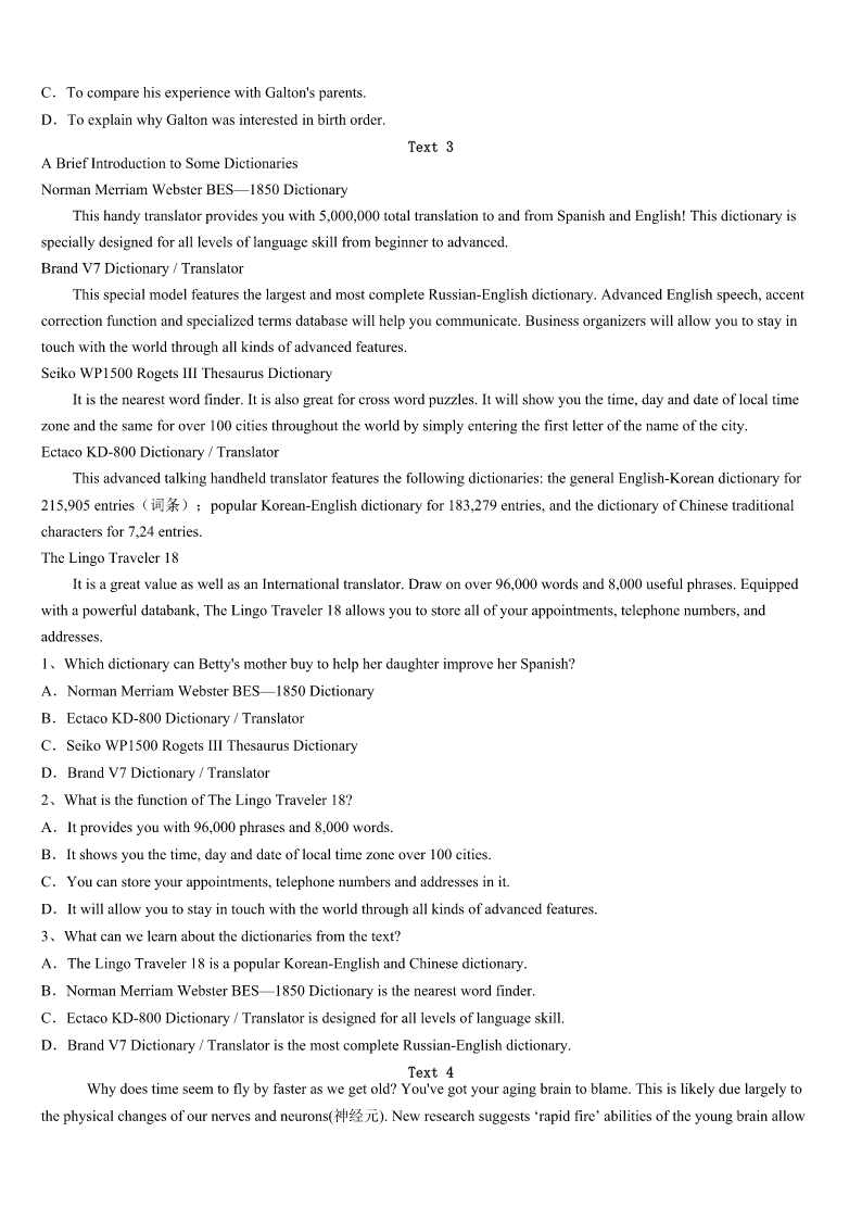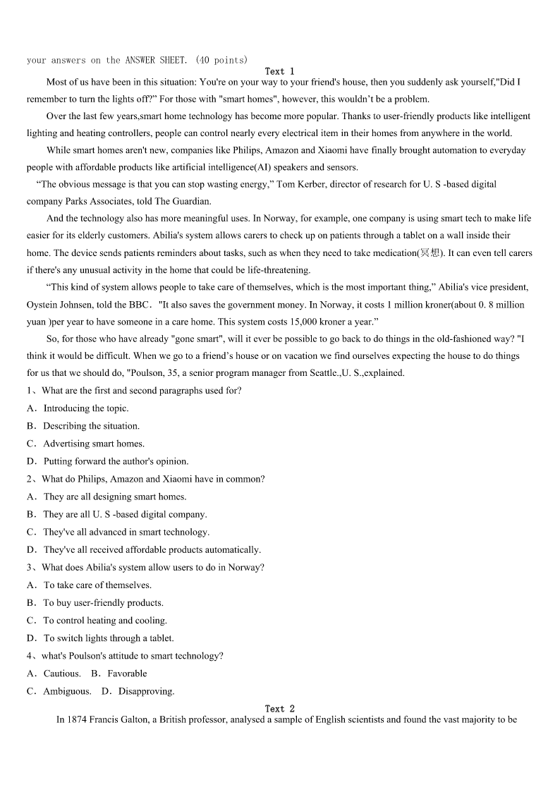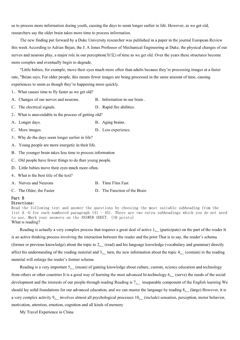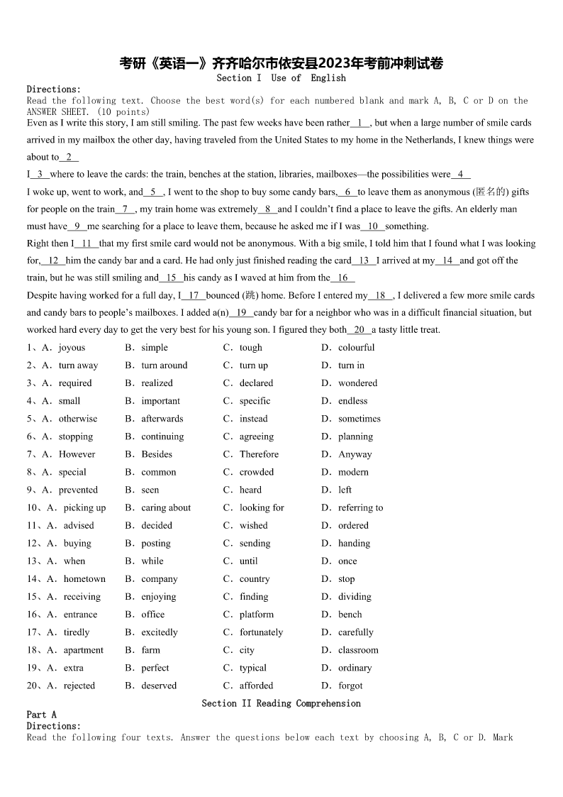 考研《英语一》齐齐哈尔市依安县2023年考前冲刺试卷 SectionIUseofEnglish Directions: Readthefollowingtext.Choosethebestword(s)foreachnumberedblankandmarkA,B,CorDonthe ANSWERSHEET.(10points) EvenasIwritethisstory,Iamstillsmiling.Thepastfewweekshavebeenrather1,butwhenalargenumberofsmilecards arrivedinmymailboxtheotherday,havingtraveledfromtheUnitedStatestomyhomeintheNetherlands,Iknewthingswere aboutto2 I3wheretoleavethecards:thetrain,benchesatthestation,libraries,mailboxes—thepossibilitieswere4 Iwokeup,wenttowork,and5,Iwenttotheshoptobuysomecandybars,6toleavethemasanonymous(匿名的)gifts forpeopleonthetrain7,mytrainhomewasextremely8andIcouldn’tfindaplacetoleavethegifts.Anelderlyman musthave9mesearchingforaplacetoleavethem,becauseheaskedmeifIwas10something. RightthenI11thatmyfirstsmilecardwouldnotbeanonymous.Withabigsmile,ItoldhimthatIfoundwhatIwaslooking for,12himthecandybarandacard.Hehadonlyjustfinishedreadingthecard13Iarrivedatmy14andgotoffthe train,buthewasstillsmilingand15hiscandyasIwavedathimfromthe16 Despitehavingworkedforafullday,I17bounced(跳)home.BeforeIenteredmy18,Ideliveredafewmoresmilecards andcandybarstopeople’smailboxes.Iaddeda(n)19candybarforaneighborwhowasinadifficultfinancialsituation,but workedhardeverydaytogettheverybestforhisyoungson.Ifiguredtheyboth20atastylittletreat. 1、A.joyousB.simpleC.toughD.colourful 2、A.turnawayB.turnaroundC.turnupD.turnin 3、A.requiredB.realizedC.declaredD.wondered 4、A.smallB.importantC.specificD.endless 5、A.otherwiseB.afterwardsC.insteadD.sometimes 6、A.stoppingB.continuingC.agreeingD.planning 7、A.HoweverB.BesidesC.ThereforeD.Anyway 8、A.specialB.commonC.crowdedD.modern 9、A.preventedB.seenC.heardD.left 10、A.pickingupB.caringaboutC.lookingforD.referringto 11、A.advisedB.decidedC.wishedD.ordered 12、A.buyingB.postingC.sendingD.handing 13、A.whenB.whileC.untilD.once 14、A.hometownB.companyC.countryD.stop 15、A.receivingB.enjoyingC.findingD.dividing 16、A.entranceB.officeC.platformD.bench 17、A.tiredlyB.excitedlyC.fortunatelyD.carefully 18、A.apartmentB.farmC.cityD.c