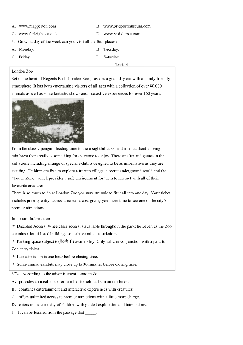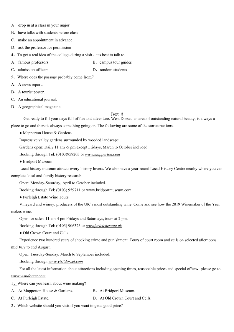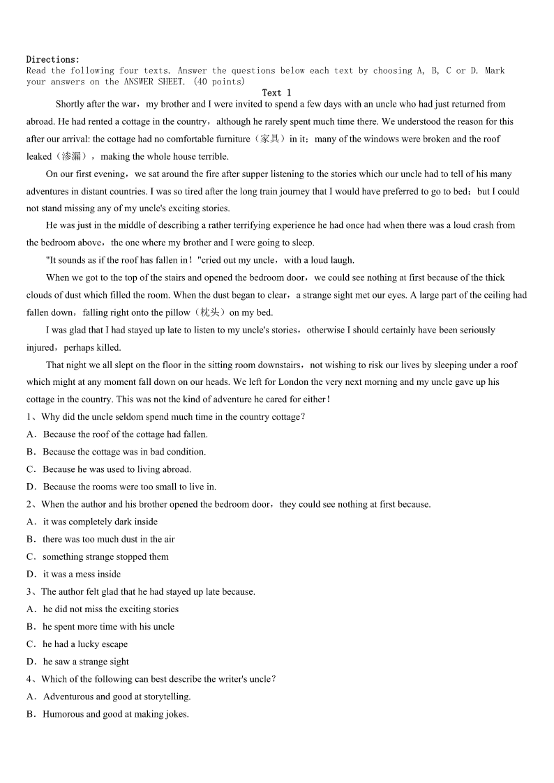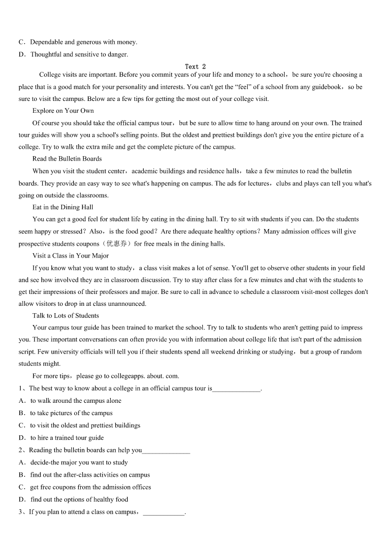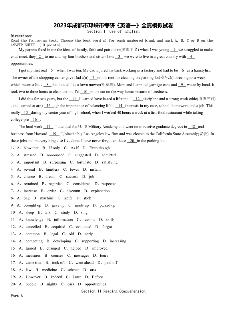 2023年成都市邛崃市考研《英语一》全真模拟试卷 SectionIUseofEnglish Directions: Readthefollowingtext.Choosethebestword(s)foreachnumberedblankandmarkA,B,CorDonthe ANSWERSHEET.(10points) Myparentsfixedinmetheideasoffamily,faithandpatriotism(爱国主义)whenIwasyoung.1westruggledtomake endsmeet,they2tomeandmyfourbrothersandsistershow3weweretoliveinagreatcountrywith4 opportunities. Igotmyfirstreal5whenIwasten.Mydadinjuredhisbackworkinginafactoryandhadtobe6asahairstylist. TheowneroftheshoppingcentergaveDada(n)7onhisrentforcleaningtheparkinglot(停车场)threenightsaweek, whichmeantalittle8thatlookedlikealawnmower(割草机).MomandIemptiedgarbagecansand9wastebyhand.It tooktwotothreehourstocleanthelot.I’d10inthecaronthewayhomebecauseoftiredness. Ididthisfortwoyears,butthe11Ilearnedhavelastedalifetime.I12disciplineandastrongworkethic(道德准则) ,andlearnedata(n)13agetheimportanceofbalancinglife’s14interestsinmycase,school,homeworkandajob.This really15duringmysenioryearofhighschool,whenIworked40hoursaweekatafastfoodrestaurantwhiletaking collegepre16. Thehardwork17.IattendedtheU.SMilitaryAcademyandwentontoreceivegraduatedegreesin18and businessfromHarvard.19,IjoinedabigLosAngeleslawfirmandwaselectedtotheCaliforniaStateAssembly(议会).In thesejobsandineverythingelseI’vedone.Ihaveneverforgottenthose20intheparkinglot. 1、A.NowthatB.IfonlyC.AsifD.Eventhough 2、A.stressedB.announcedC.suggestedD.admitted 3、A.importantB.surprisingC.fortunateD.satisfying 4、A.severalB.limitlessC.fewerD.instant 5、A.chanceB.dreamC.successD.job 6、A.retrainedB.regardedC.consideredD.respected 7、A.increaseB.orderC.discountD.explanation 8、A.bagB.machineC.knifeD.stick 9、A.broughtupB.gaveupC.madeupD.pickedup 10、A.sleepB.talkC.studyD.sing 11、A.knowledgeB.informationC.lessonsD.skills 12、A.cancelledB.acquiredC.evaluatedD.forgot 13、A.commonB.legalC.oldD.early 14、A.competingB.developingC.supportingD.increasing 15、A.turnedB.changedC.helpedD.improved 16、A.measuresB.coursesC.messagesD.tours 17、A.cametrueB.tookoffC.wentaheadD.paidoff 18、A.lawB.medicineC.scienceD.arts