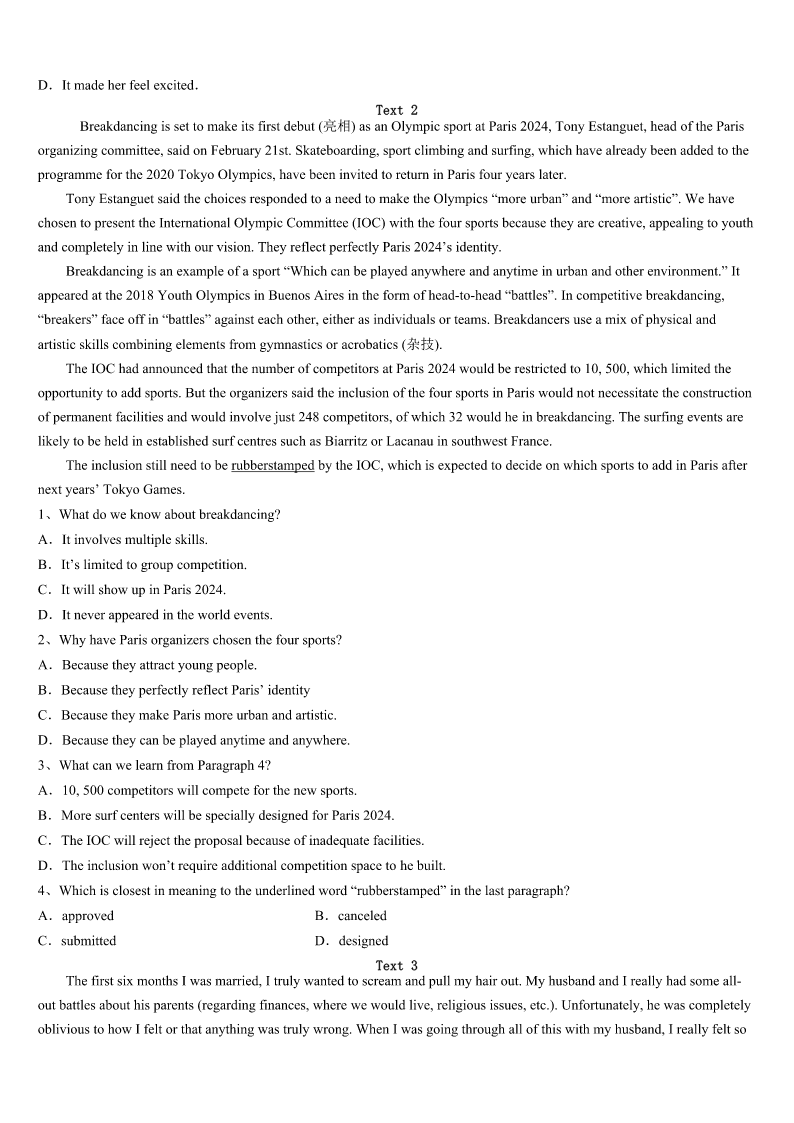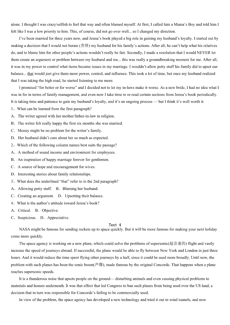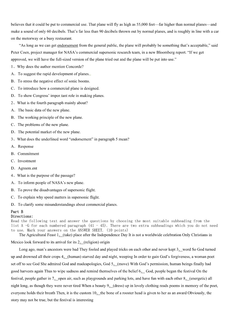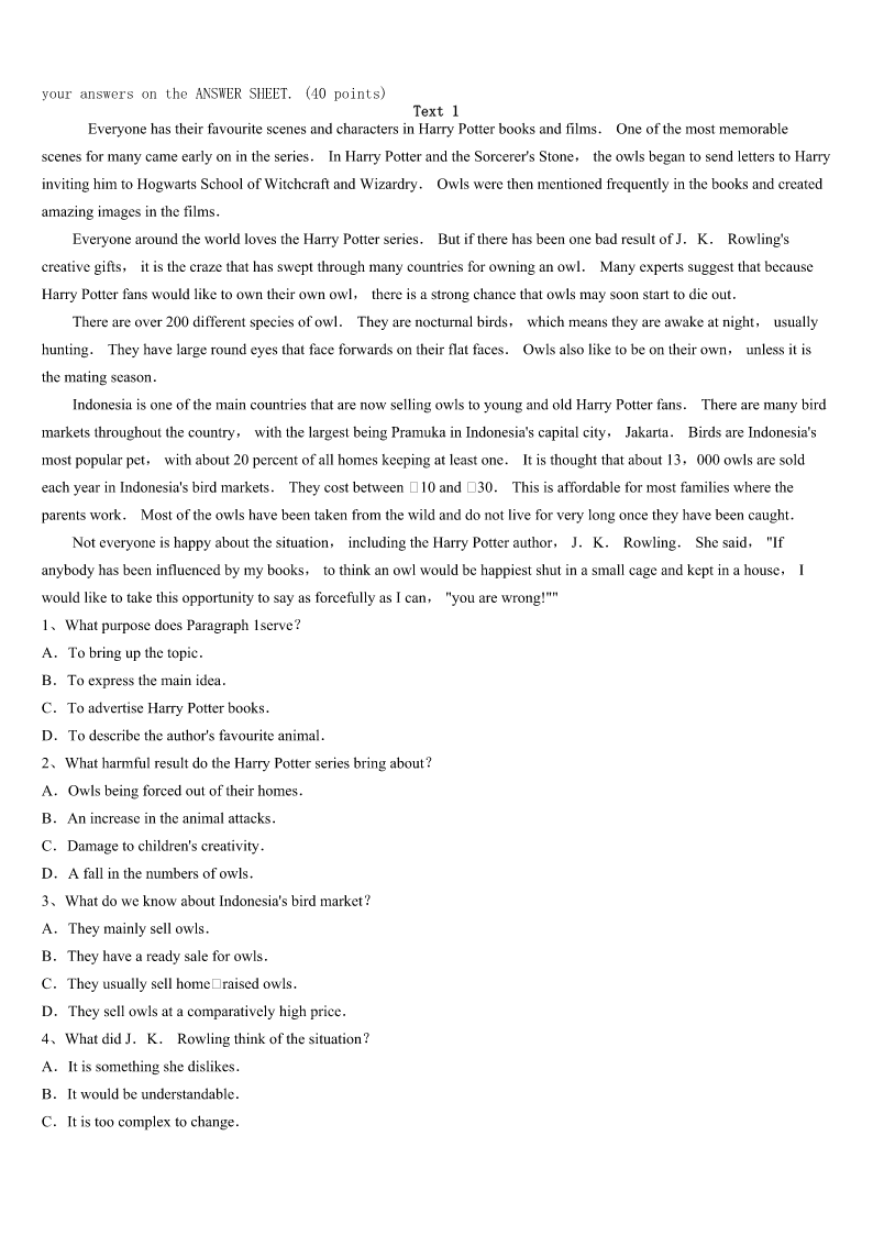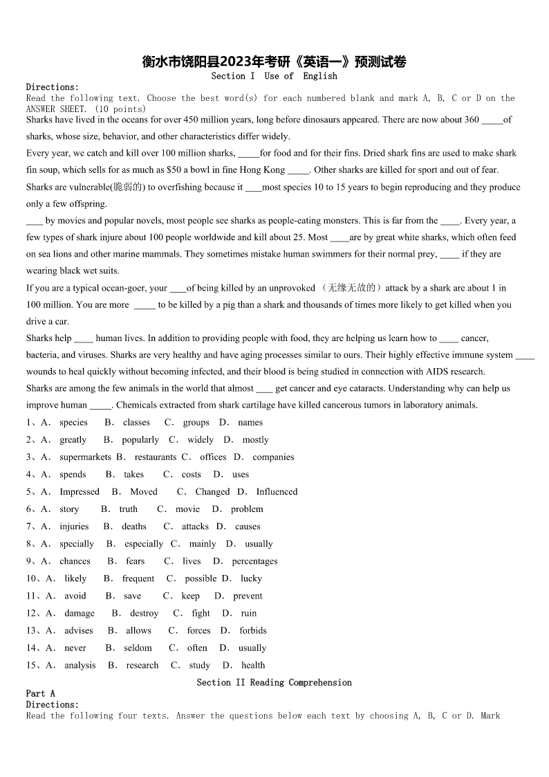 衡水市饶阳县2023年考研《英语一》预测试卷 SectionIUseofEnglish Directions: Readthefollowingtext.Choosethebestword(s)foreachnumberedblankandmarkA,B,CorDonthe ANSWERSHEET.(10points) Sharkshavelivedintheoceansforover450millionyears,longbeforedinosaursappeared.Therearenowabout360of sharks,whosesize,behavior,andothercharacteristicsdifferwidely. Everyyear,wecatchandkillover100millionsharks,forfoodandfortheirfins.Driedsharkfinsareusedtomakeshark finsoup,whichsellsforasmuchas$50abowlinfineHongKong.Othersharksarekilledforsportandoutoffear. Sharksarevulnerable(脆弱的)tooverfishingbecauseitmostspecies10to15yearstobeginreproducingandtheyproduce onlyafewoffspring. bymoviesandpopularnovels,mostpeopleseesharksaspeople-eatingmonsters.Thisisfarfromthe.Everyyear,a fewtypesofsharkinjureabout100peopleworldwideandkillabout25.Mostarebygreatwhitesharks,whichoftenfeed onsealionsandothermarinemammals.Theysometimesmistakehumanswimmersfortheirnormalprey,iftheyare wearingblackwetsuits. Ifyouareatypicalocean-goer,yourofbeingkilledbyanunprovoked(无缘无故的)attackbyasharkareabout1in 100million.Youaremoretobekilledbyapigthanasharkandthousandsoftimesmorelikelytogetkilledwhenyou driveacar. Sharkshelphumanlives.Inadditiontoprovidingpeoplewithfood,theyarehelpinguslearnhowtocancer, bacteria,andviruses.Sharksareveryhealthyandhaveagingprocessessimilartoours.Theirhighlyeffectiveimmunesystem woundstohealquicklywithoutbecominginfected,andtheirbloodisbeingstudiedinconnectionwithAIDSresearch. Sharksareamongthefewanimalsintheworldthatalmostgetcancerandeyecataracts.Understandingwhycanhelpus improvehuman.Chemicalsextractedfromsharkcartilagehavekilledcanceroustumorsinlaboratoryanimals. 1、A.speciesB.classesC.groupsD.names 2、A.greatlyB.popularlyC.widelyD.mostly 3、A.supermarketsB.restaurantsC.officesD.companies 4、A.spendsB.takesC.costsD.uses 5、A.ImpressedB.MovedC.ChangedD.Influenced 6、A.storyB.truthC.movieD.problem 7、A.injuriesB.deathsC.attacksD.causes 8、A.speciallyB.especiallyC.mainlyD.usually 9、A.chancesB.fearsC.livesD.percentages 10、A.like
