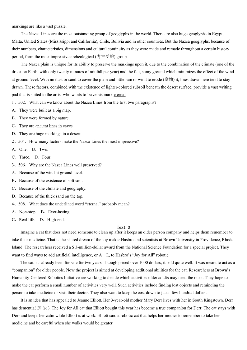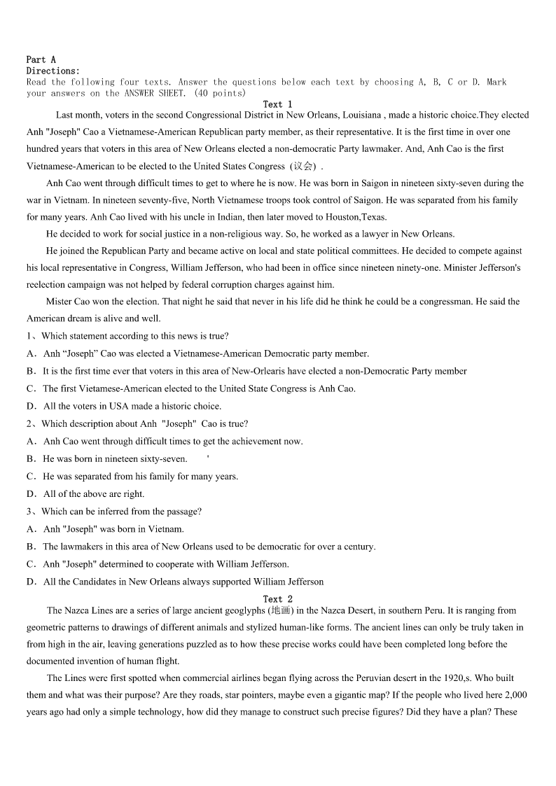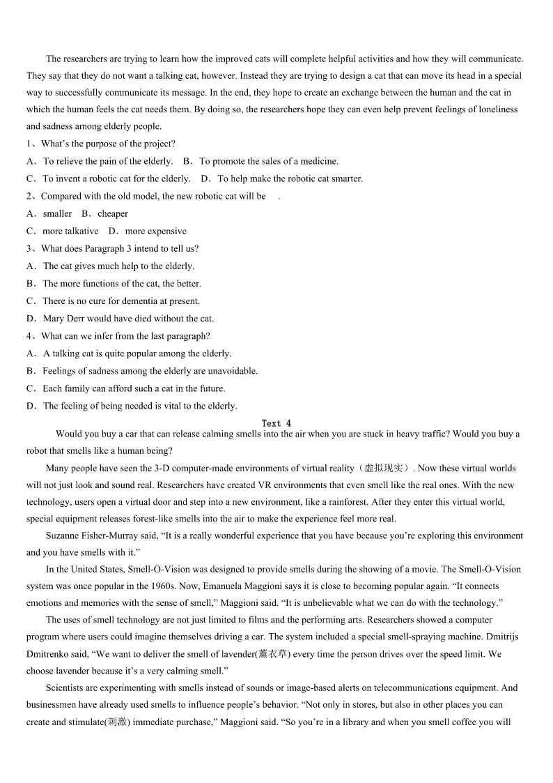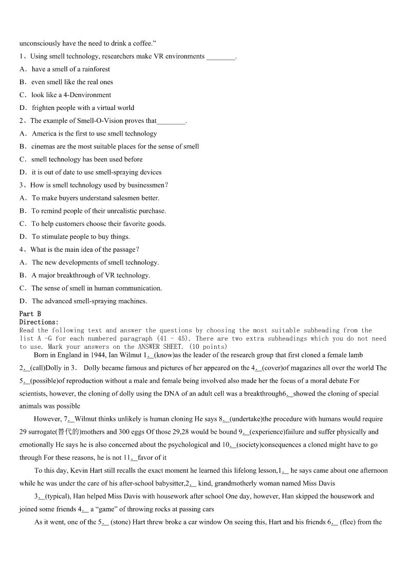 西安市周至县2023年考研《英语一》考前冲刺试卷 SectionIUseofEnglish Directions: Readthefollowingtext.Choosethebestword(s)foreachnumberedblankandmarkA,B,CorDonthe ANSWERSHEET.(10points) “It’stimetowakeup,Emily,”mymomsingsfromthekitchen.I1toopenmyeyes.Whydidn’tthealarmonmy cellphonegooff? Soon,Irealizetodayisthedayformy2:“Adaywithouttechnology.” Ididn’trealizewhatIhadgottenmyselfintountilIwasdrivingtoschoolinmycarin3.Noradiobroadcastingmy favoritesongs.Ihadtosingtomyself. AssoonasIgottoschool,IwenttothelibrarytoprintoutmyEnglishproject.“Uh-oh,”Ithought.“Thisisn’tallowed.” TheschooldaywentonandIfinallygrew4therule.Thiswasn’tso5!Icoulddothiseveryday. Idrovehomeafterschool,andmy6eventuallywentintoafterschoolmode,7onwhatIwouldeatforsupperand whowouldbevotedoffAmericanIdollaterthatnight.The8thingIknew,IwaschattingwithmyfriendsonFacebook, checkingemailandwatchingavideoonYouTube,allatthesametime! Mymomwalkedinandherjawdropped. “Whathappenedtono9?”Sheaskedme.Ifrozeforthesecondtimethatdayandforcedmyselftogobacktoreality.I had10. Thisexperiment,whichmanyteenagerswouldneverhavethecouragetoattempt,wasactually11tome.Eventhough myattemptatgoingaboutmydaywithouttechnologywasafailure,IrealizedthatifIreallytried,Iwouldbecompletely12 withoutmyaddictiontotechnology. Hey,wemayevenfindweliketalkingtoourfamiliesinsteadofwatchingTV.Wemight13abicyclerideorawalkto theparkinsteadoflookingatpagesandpagesofFacebookpictures. Thesedevicescertainlymakemylifeeasier,andIdefinitelywouldn’t14gettingridofthemaltogether,butIdobelieve thelivesoftoday’steenagerswouldbeobviously15withoutourtechnologydependence. 1、A.tryB.pretendC.refuseD.decide 2、A.expectationB.explorationC.experienceD.experiment 3、A.doubtB.silenceC.surpriseD.excitement 4、A.interestedinB.annoyedwithC.impatientwithD.usedto 5、A.hardB.easyC.strangeD.comfortable 6、A.ruleB.planC.mindD.role 7、A.agreeingB.concentratingC.countingD.depending 8、A.oneB.firstC.lastD.next 9、A.homeworkB.controlC.pressureD.technology 10、A.improvedB.startedC.failedD.finished 11、A.availableB.conv