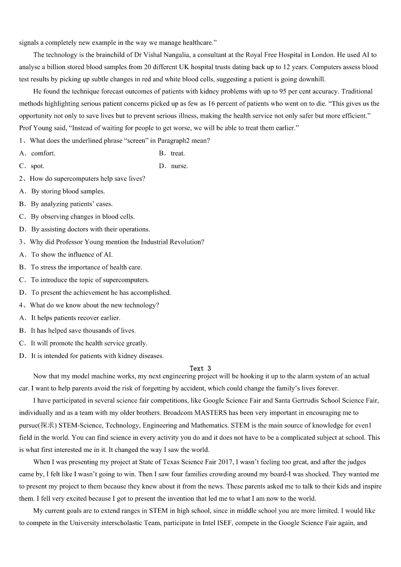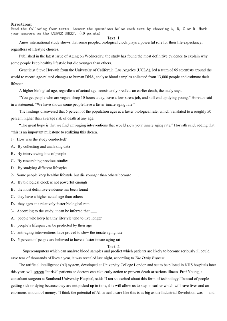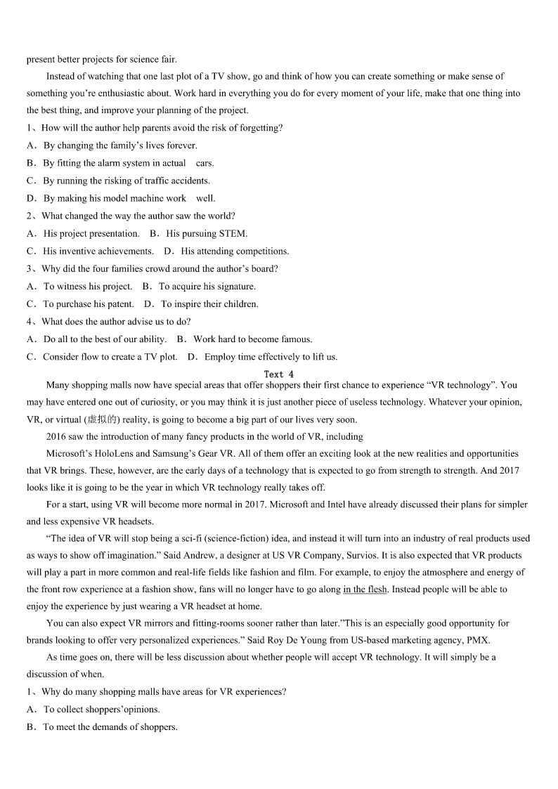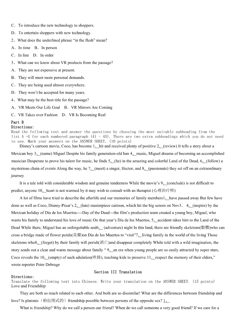 衢州市江山市2023年考研《英语一》全真模拟试卷 SectionIUseofEnglish Directions: Readthefollowingtext.Choosethebestword(s)foreachnumberedblankandmarkA,B,CorDonthe ANSWERSHEET.(10points) Don’tBeAfraidtoMakeaFoolofYourselfandReachouttoStrangers Growingup,Iwasgluedtomymother’ship,readytofollowherwherevertheworldtookus.Iusedtosleepather1 onthefloorofherlawschoollecturehallswhilehundredsof2pouredoverscoresoflegaltermsandhistoricalcourt3. WhenmymotherandIwouldtraveltodifferentcountriestogether,shealwaystalkedto4.Shewouldtellourlifestory andIwasoften5.Ifiguredthatpeoplethoughtshesharedtoomuchanditwas6. Inowrecognizetheimportanceofthe7mymothermade.Aftershedied,Ireceivedhundredsofphonecallsfrom peopleallovertheworld.They8tooffertheircondolences(吊唁),but9tosharehowmuchmymotherhadmeantto them.10sheofferedlegaladviceorsimplysharedastory,they11theirhearttomeabouthowshe12theirlives. WhenshefirstdecidedtobuyanapartmentandsettleddowninParis,she13thewritersofherfavouriteblogsand instantlybegantoformtheirownFrench14.Theyspenthourseatingcarefullyselectedcheesesandsipping(啜饮)coffee while15favoriteParisianrestaurants.ThesearethepeopleInowcallmy16auntsanduncles. WhatIjudgedasmymommakinga17ofherselfwasherwayofsharingher18andcharm.Thistaughtmeto 19intofearandnottoletself-criticismgovernanythingIdo.Now,Ispeakup.Italktostrangers.I20myselfand becauseofit,Ireceive. 1、A.topsB.armsC.elbowsD.feet 2、A.teachersB.studentsC.audienceD.views 3、A.accidentsB.eventsC.casesD.stories 4、A.foreignersB.strangersC.neighborsD.learners 5、A.embarrassedB.excitedC.disappointedD.surprised 6、A.fortunateB.inappropriateC.properD.reasonable 7、A.connectionB.inventionsC.decisionD.possessions 8、A.wroteB.plannedC.calledD.attempted 9、A.purposelyB.usuallyC.mainlyD.accordingly 10、A.WheneverB.WhereverC.HoweverD.Whether 11、A.turnedoutB.pouredoutC.figuredoutD.foundout 12、A.madeB.savedC.earnedD.changed 13、A.contactedB.becameC.namedD.investigated 14、A.communityB.classC.restaurantD.organization 15、A.enteringB.searchingC.exploringD.discussing 16、A.AmericanB.