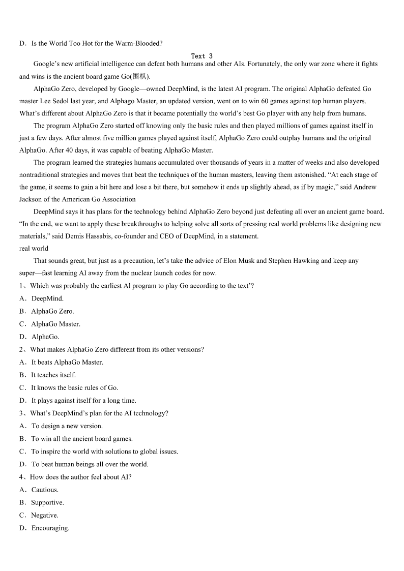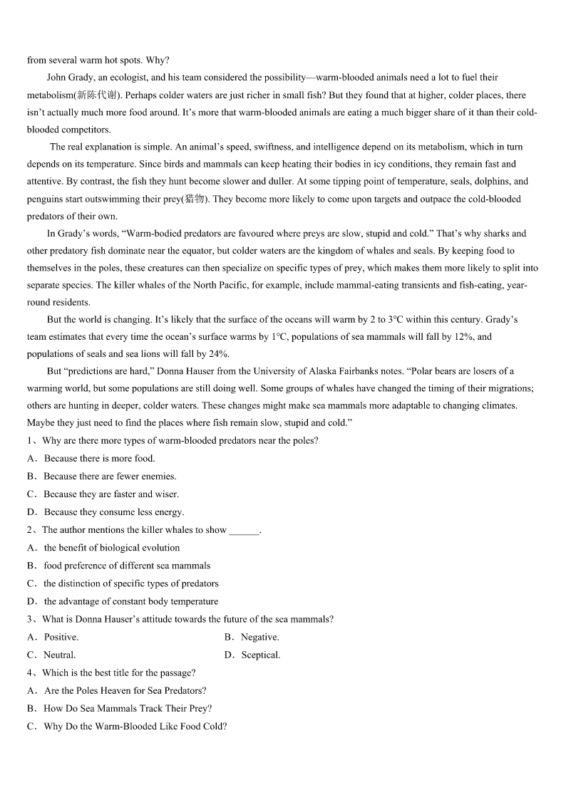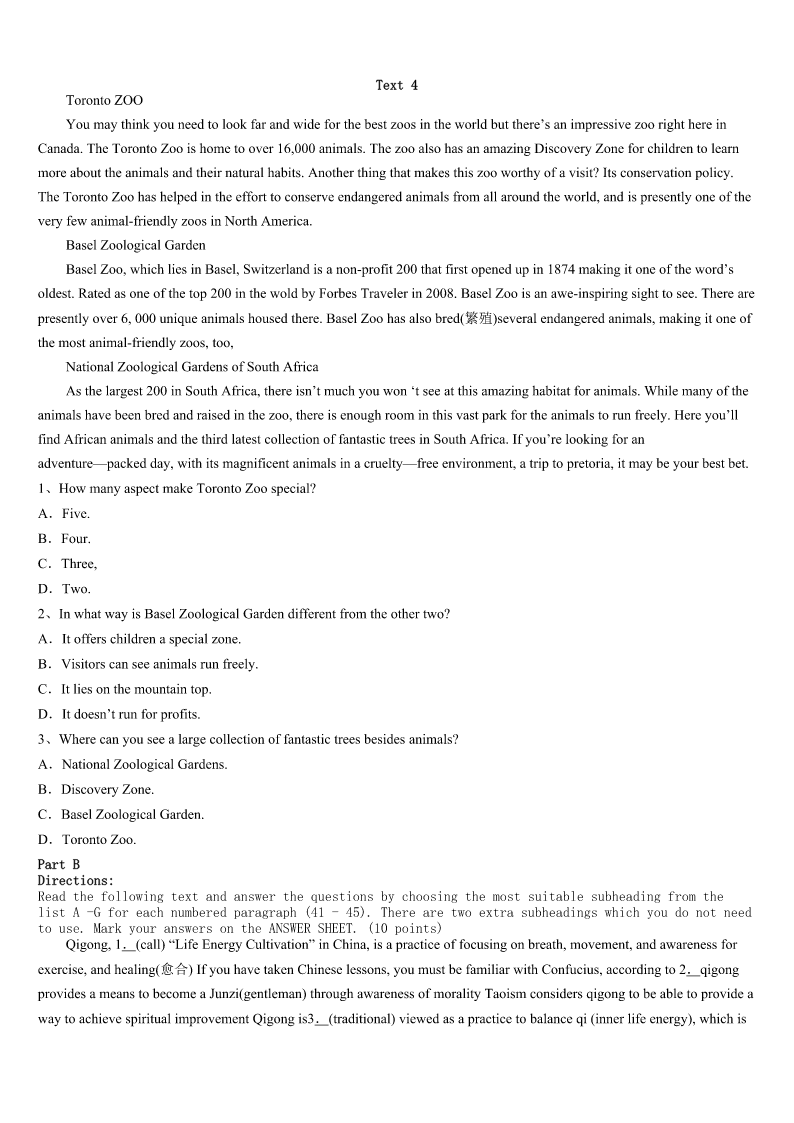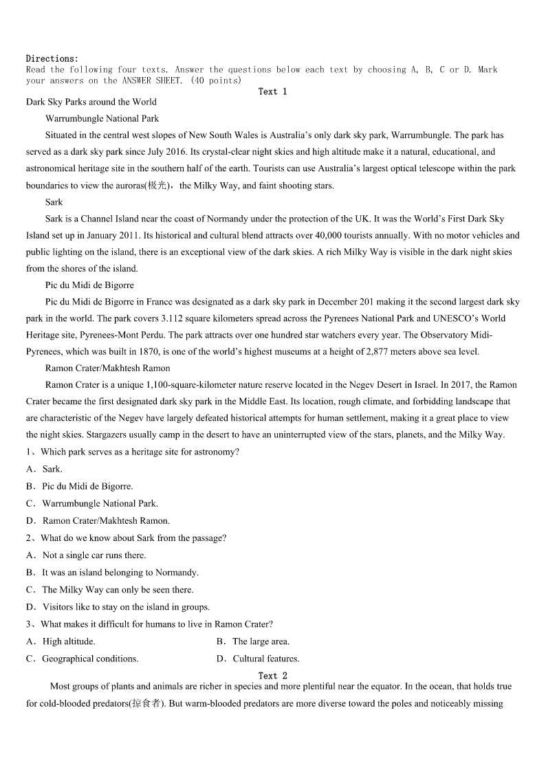 西宁市城北区2023年考研《英语一》全真模拟试卷 SectionIUseofEnglish Directions: Readthefollowingtext.Choosethebestword(s)foreachnumberedblankandmarkA,B,CorDonthe ANSWERSHEET.(10points) Mymomisanawesomehumanbeingjustlikeallothermoms.Sheknowinglyandunknowingly1meawholelot ofthingsabouttheworld.The2whichI'mgoingtosharetodaydeterminedthewayI3everybody. Iwasfouryearsold.Onefineafternoon,mymomandIwere4outdoors,shereadingandIwatchingalineof5.I wasneveranaughtykid;6Iwasknownforkeepingquietevenwhenthingswerenotgoingmyway.SoIdon'tremember whyIdidthisbutIdisrupted(使中断)thelinesofantsandIlikeditwhentheylookedso7.Ievenwentaheadandstepped onacoupleofthem!Mymomsawthisandshewasn’t8withmebutshesaidsomethingIstill9today.Shesaid,“You shouldneverbe10toanybodyhoweverlittletheyare.Everybodyisdifferentandweshouldn’ttreatthem11. IgotupsetwhenIheardthisbecauseIthoughtIhad12mymom.Alsomylittleheartstarted13thefamilyofants Ihadkilled.Ithasbeenmorethan25yearsnowandI've14somanythingsthathavehappenedinmylife;15.Istilldo mybesttobekindtoeverybody. Weshouldteachouryoungkidstoneverbemeantoanybody.Itmakesa16whenpeoplepraiseotherpeoplefortheir effortsandwhen17beingenvious,we’reproudofpeopleachievingtheirgoalshowever18theymaybe.Whenyou’re kindtootherpeople,it’sa19thatgoeson.It’sthekindof20reactionthatupliftsthewholeworldoneheartatatime.I believeinthemagicofkindness! 1、A.offeredB.1eftC.promisedD.taught 2、A.accidentB.informationC.incidentD.conflict 3、A.respectB.treatC.questionD.doubt 4、A.stayingB.chattingC.wanderingD.playing 5、A.treesB.kidsC.antsD.cars 6、A.incaseB.infactC.aboveallD.atfirst 7、A.troubledB.excitedC.uglyD.scary 8、A.patientB.familiarC.annoyedD.honest 9、A.livebyB.disagreewithC.getacrossD.1ookfor 10、A.familiarB.cruelC.similarD.cool 11、A.seriouslyB.hopelesslyC.directlyD.unfairly 12、A.disappointedB.convincedC.comfortedD.terrified 13、A.believinginB.seekingforC.1aughingatD.thinkingabout 14、A.acceptedB.repeatedC.forgottenD.discovered 15、A.thusB.howeverC.thereforeD.besides 16、A.decisionB.differenceC.dealD.living 17、A.inste