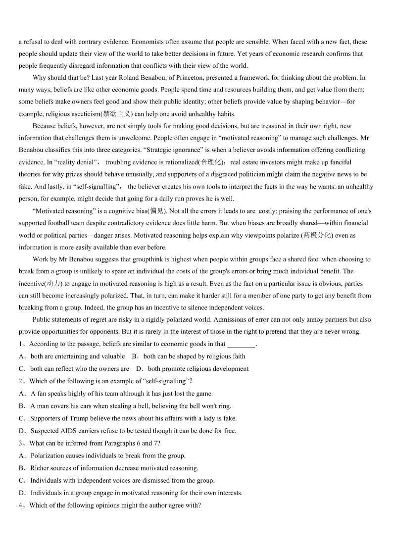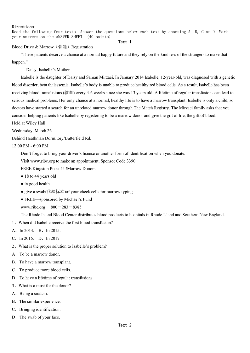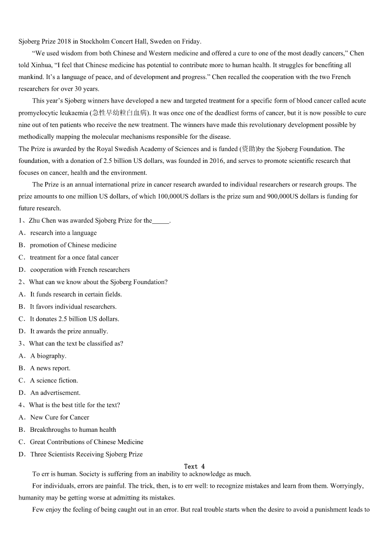 营口市西市区2023年考研《英语一》深度预测试题 SectionIUseofEnglish Directions: Readthefollowingtext.Choosethebestword(s)foreachnumberedblankandmarkA,B,CorDonthe ANSWERSHEET.(10points) 阅读下面短文,从短文后各题所给的四个选项(A、B、C和D)中,选出可以填人空白处的最佳选项。 Onecoldevening,IwaswaitingoutsideforataxiinNewYorkcity.Later,Iwas1byamaninhisthirties.Obviously,he wasangry,complaininghow2NewYorkerswere.Iknewmy3wouldonlybeabout10minutesandapartofmewanted tokeep4andjustmoveon,butIalsowantedtotryandconnect. Iaskedhim5.HetoldmehehadjustcomefromJFKairportwithoutacustomer,whichmeans$10inlostfare(车费),a fairlybigdeal.Itriedtosharehis6.7,hecalmeddown.Hementionedhehadreadanarticlesayingthatthehappiest peoplearethosewhogive.8,hehopedtohavemorechancesto9inhislife,Iwasstartingto10beingwithhim! Arrivingatmydestination,Ipaidhim,givingageneroustip.Ialsopulledoutanextra$20andsaid,“Sir,Isharethesame11 ofgivingwithyou.Here'sanextralittlebit.12it,sinceyou’vealready13$10fromJFK.But,ifyouwantto14the powerofthegift,giveittothenext15.” ForamomentIthoughtIwasso16!Butthedriver17mebysaying,“Sir,Ihavea18idea.Yougivethat$20toa homelesspersonandIwillgiftthenextriderforfree.” Itwasa/an19meetingthedriverandlearningthelessonofhoweveryoneisabletogiveandsurpriseanotherwiththeir20 . 1、A.takenupB.pickedupC.sentupD.putup 2、A.seriousB.cruelC.horribleD.strict 3、A.rideB.flightC.wayD.distance 4、A.freeB.calmC.busyD.silent 5、A.howB.whyC.whatD.where 6、A.delightB.worryC.unhappinessD.surprise 7、A.GraduallyB.FortunatelyC.NormallyD.Obviously 8、A.OtherwiseB.HoweverC.BesidesD.Therefore 9、A.forgiveB.shareC.takeD.give 10、A.mindB.regretC.enjoyD.hate 11、A.ideaB.actionC.practiceD.story 12、A.ForgetB.KeepC.PutD.Pay 13、A.earnedB.savedC.lostD.wasted 14、A.experienceB.exchangeC.transformedD.get 15、A.touristB.conductorC.strangerD.passenger 16、A.badB.coolC.sillyD.simple 17、A.disappointedB.satisfiedC.surprisedD.encouraged 18、A.newerB.furtherC.worseD.better 19、A.honorB.rewardC.amusementD.comfort 20、A.moneyB.generosityC.powerD.gift SectionIIReadingComprehension PartA Directions: Readthef