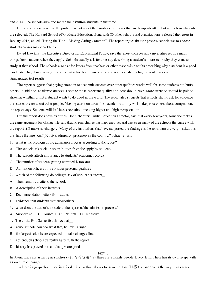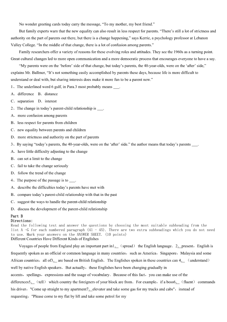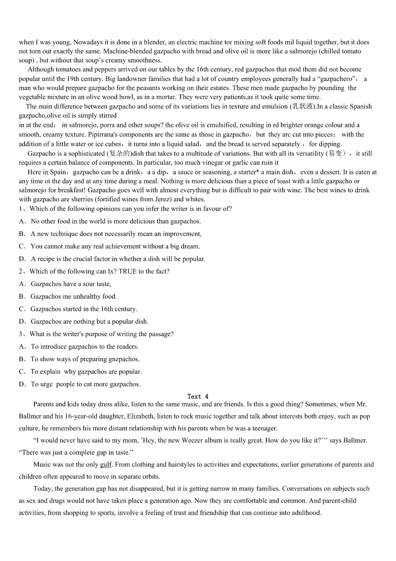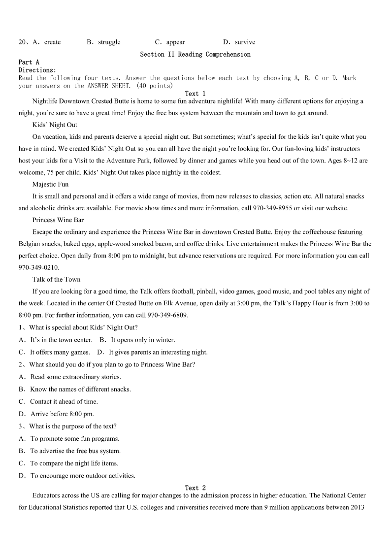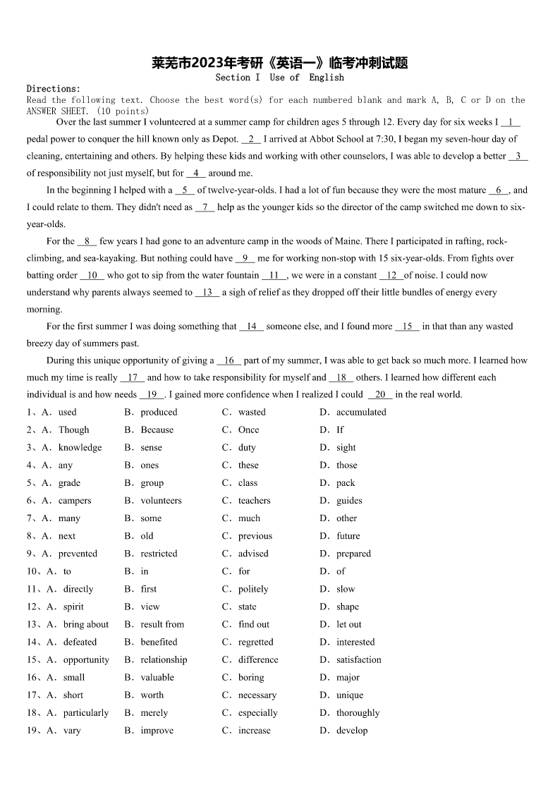 莱芜市2023年考研《英语一》临考冲刺试题 SectionIUseofEnglish Directions: Readthefollowingtext.Choosethebestword(s)foreachnumberedblankandmarkA,B,CorDonthe ANSWERSHEET.(10points) OverthelastsummerIvolunteeredatasummercampforchildrenages5through12.EverydayforsixweeksI1 pedalpowertoconquerthehillknownonlyasDepot.2IarrivedatAbbotSchoolat7:30,Ibeganmyseven-hourdayof cleaning,entertainingandothers.Byhelpingthesekidsandworkingwithothercounselors,Iwasabletodevelopabetter3 ofresponsibilitynotjustmyself,butfor4aroundme. InthebeginningIhelpedwitha5oftwelve-year-olds.Ihadalotoffunbecausetheywerethemostmature6,and Icouldrelatetothem.Theydidn'tneedas7helpastheyoungerkidssothedirectorofthecampswitchedmedowntosix- year-olds. Forthe8fewyearsIhadgonetoanadventurecampinthewoodsofMaine.ThereIparticipatedinrafting,rock- climbing,andsea-kayaking.Butnothingcouldhave9meforworkingnon-stopwith15six-year-olds.Fromfightsover battingorder10whogottosipfromthewaterfountain11,wewereinaconstant12ofnoise.Icouldnow understandwhyparentsalwaysseemedto13asighofreliefastheydroppedofftheirlittlebundlesofenergyevery morning. ForthefirstsummerIwasdoingsomethingthat14someoneelse,andIfoundmore15inthatthananywasted breezydayofsummerspast. Duringthisuniqueopportunityofgivinga16partofmysummer,Iwasabletogetbacksomuchmore.Ilearnedhow muchmytimeisreally17andhowtotakeresponsibilityformyselfand18others.Ilearnedhowdifferenteach individualisandhowneeds19.IgainedmoreconfidencewhenIrealizedIcould20intherealworld. 1、A.usedB.producedC.wastedD.accumulated 2、A.ThoughB.BecauseC.OnceD.If 3、A.knowledgeB.senseC.dutyD.sight 4、A.anyB.onesC.theseD.those 5、A.gradeB.groupC.classD.pack 6、A.campersB.volunteersC.teachersD.guides 7、A.manyB.someC.muchD.other 8、A.nextB.oldC.previousD.future 9、A.preventedB.restrictedC.advisedD.prepared 10、A.toB.inC.forD.of 11、A.directlyB.firstC.politelyD.slow 12、A.spiritB.viewC.stateD.shape 13、A.bringaboutB.resultfromC.findoutD.letout 14、A.defeatedB.benefitedC.regrettedD.interested 15、A.opportunityB.relationshipC.differenceD