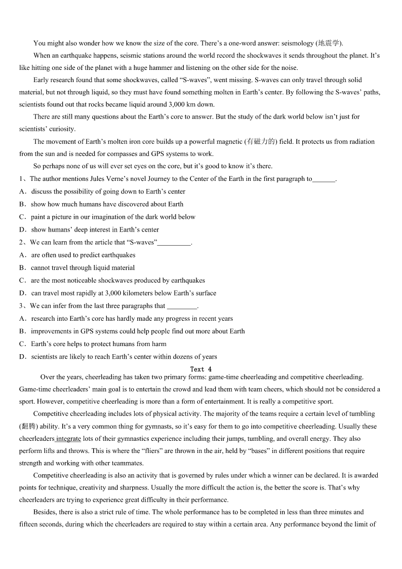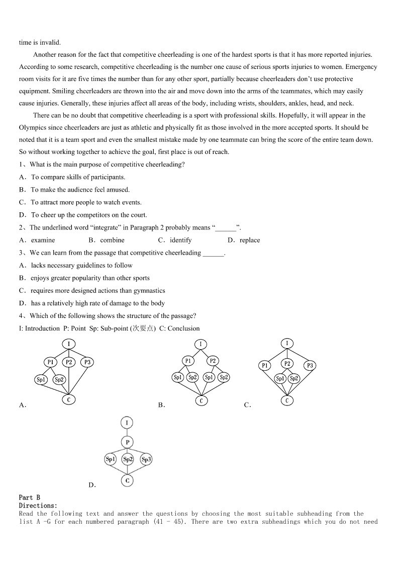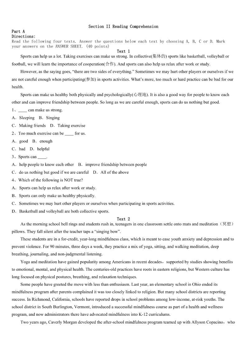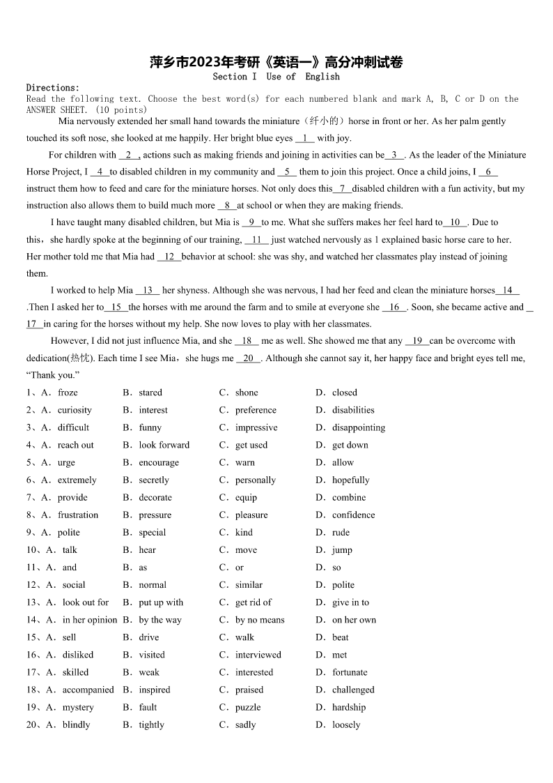 萍乡市2023年考研《英语一》高分冲刺试卷 SectionIUseofEnglish Directions: Readthefollowingtext.Choosethebestword(s)foreachnumberedblankandmarkA,B,CorDonthe ANSWERSHEET.(10points) Mianervouslyextendedhersmallhandtowardstheminiature(纤小的)horseinfrontorher.Asherpalmgently toucheditssoftnose,shelookedatmehappily.Herbrightblueeyes1withjoy. Forchildrenwith2,actionssuchasmakingfriendsandjoininginactivitiescanbe3.AstheleaderoftheMiniature HorseProject,I4todisabledchildreninmycommunityand5themtojointhisproject.Onceachildjoins,I6 instructthemhowtofeedandcarefortheminiaturehorses.Notonlydoesthis7disabledchildrenwithafunactivity,butmy instructionalsoallowsthemtobuildmuchmore8atschoolorwhentheyaremakingfriends. Ihavetaughtmanydisabledchildren,butMiais9tome.Whatshesuffersmakesherfeelhardto10.Dueto this,shehardlyspokeatthebeginningofourtraining,11justwatchednervouslyas1explainedbasichorsecaretoher. HermothertoldmethatMiahad12behavioratschool:shewasshy,andwatchedherclassmatesplayinsteadofjoining them. IworkedtohelpMia13hershyness.Althoughshewasnervous,Ihadherfeedandcleantheminiaturehorses14 .ThenIaskedherto15thehorseswithmearoundthefarmandtosmileateveryoneshe16.Soon,shebecameactiveand 17incaringforthehorseswithoutmyhelp.Shenowlovestoplaywithherclassmates. However,IdidnotjustinfluenceMia,andshe18measwell.Sheshowedmethatany19canbeovercomewith dedication(热忱).EachtimeIseeMia,shehugsme20.Althoughshecannotsayit,herhappyfaceandbrighteyestellme, “Thankyou.” 1、A.frozeB.staredC.shoneD.closed 2、A.curiosityB.interestC.preferenceD.disabilities 3、A.difficultB.funnyC.impressiveD.disappointing 4、A.reachoutB.lookforwardC.getusedD.getdown 5、A.urgeB.encourageC.warnD.allow 6、A.extremelyB.secretlyC.personallyD.hopefully 7、A.provideB.decorateC.equipD.combine 8、A.frustrationB.pressureC.pleasureD.confidence 9、A.politeB.specialC.kindD.rude 10、A.talkB.hearC.moveD.jump 11、A.andB.asC.orD.so 12、A.socialB.normalC.similarD.polite 13、A.lookoutforB.putupwithC.getridofD.giveinto 14、A.inheropinionB.bythewayC.bynomeansD.onherown 15、A.se