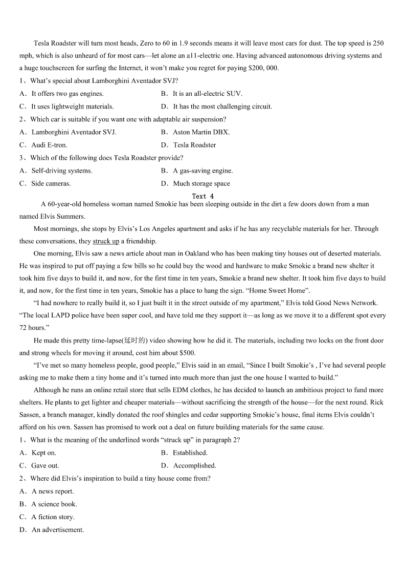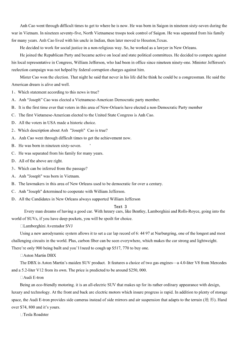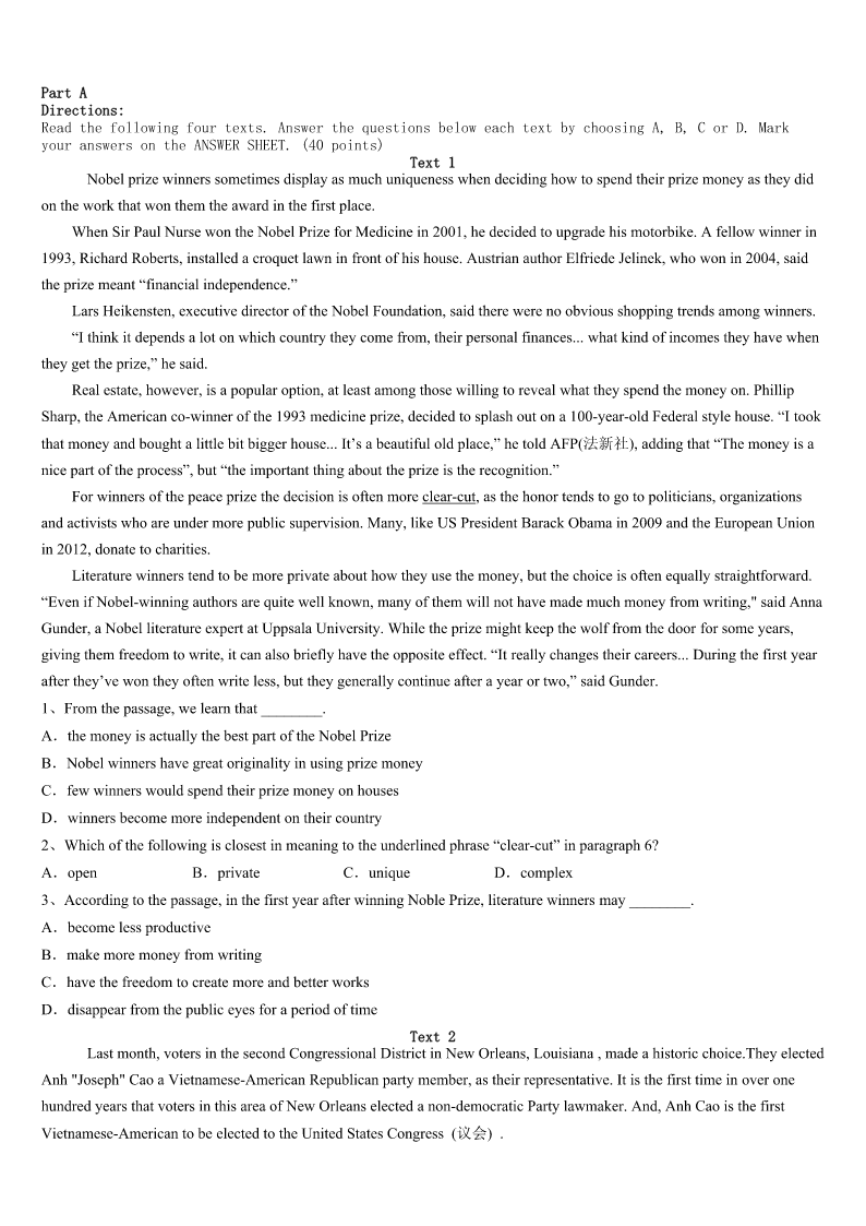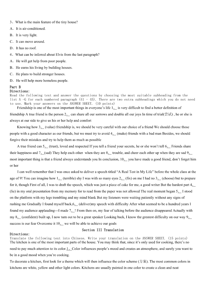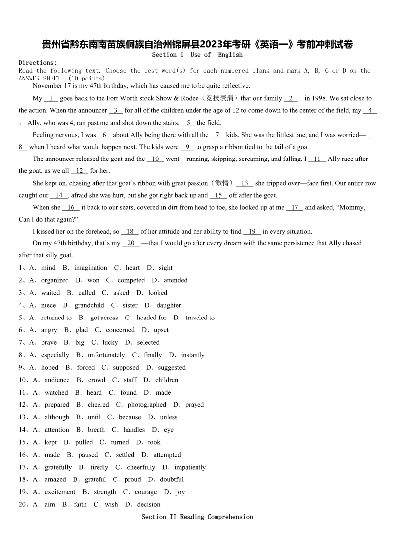 贵州省黔东南南苗族侗族自治州锦屏县2023年考研《英语一》考前冲刺试卷 SectionIUseofEnglish Directions: Readthefollowingtext.Choosethebestword(s)foreachnumberedblankandmarkA,B,CorDonthe ANSWERSHEET.(10points) November17ismy47thbirthday,whichhascausedmetobequitereflective. My1goesbacktotheFortWorthstockShow&Rodeo(竞技表演)thatourfamily2in1998.Wesatcloseto theaction.Whentheannouncer3forallofthechildrenundertheageof12tocomedowntothecenterofthefield,my4 ,Ally,whowas4,ranpastmeandshotdownthestairs,5thefield. Feelingnervous,Iwas6aboutAllybeingtherewithallthe7kids.Shewasthelittlestone,andIwasworried— 8whenIheardwhatwouldhappennext.Thekidswere9tograsparibbontiedtothetailofagoat. Theannouncerreleasedthegoatandthe10went—running,skipping,screaming,andfalling.I11Allyraceafter thegoat,asweall12forher. Shekepton,chasingafterthatgoat’sribbonwithgreatpassion(激情)13shetrippedover—facefirst.Ourentirerow caughtour14,afraidshewashurt,butshegotrightbackupand15offafterthegoat. Whenshe16itbacktoourseats,coveredindirtfromheadtotoe,shelookedupatme17andasked,“Mommy, CanIdothatagain?” Ikissedherontheforehead,so18ofherattitudeandherabilitytofind19ineverysituation. Onmy47thbirthday,that’smy20—thatIwouldgoaftereverydreamwiththesamepersistencethatAllychased afterthatsillygoat. 1、A.mindB.imaginationC.heartD.sight 2、A.organizedB.wonC.competedD.attended 3、A.waitedB.calledC.askedD.looked 4、A.nieceB.grandchildC.sisterD.daughter 5、A.returnedtoB.gotacrossC.headedforD.traveledto 6、A.angryB.gladC.concernedD.upset 7、A.braveB.bigC.luckyD.selected 8、A.especiallyB.unfortunatelyC.finallyD.instantly 9、A.hopedB.forcedC.supposedD.suggested 10、A.audienceB.crowdC.staffD.children 11、A.watchedB.heardC.foundD.made 12、A.preparedB.cheeredC.photographedD.prayed 13、A.althoughB.untilC.becauseD.unless 14、A.attentionB.breathC.handlesD.eye 15、A.keptB.pulledC.turnedD.took 16、A.madeB.pausedC.settledD.attempted 17、A.gratefullyB.tiredlyC.cheerfullyD.impatiently 18、A.amazedB.gratefulC.proudD.doubtful 19、A.excitementB.strengthC.courageD.joy 20、A.aimB.faithC.wishD.decisio