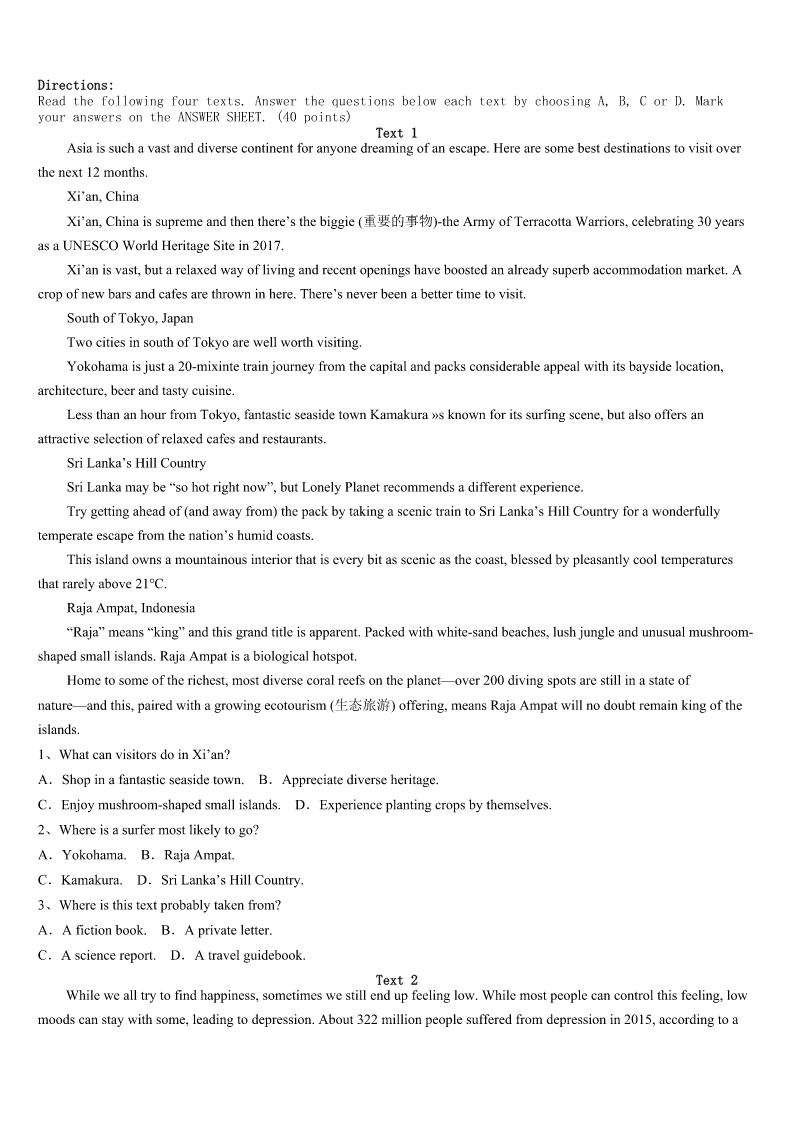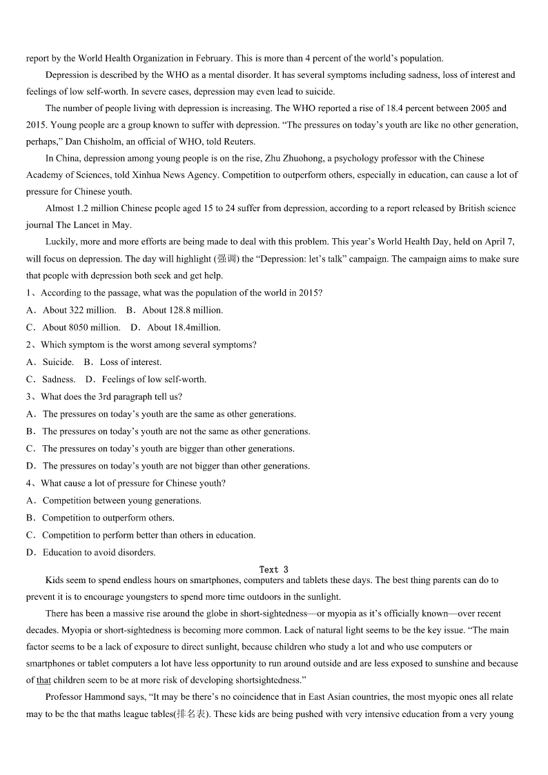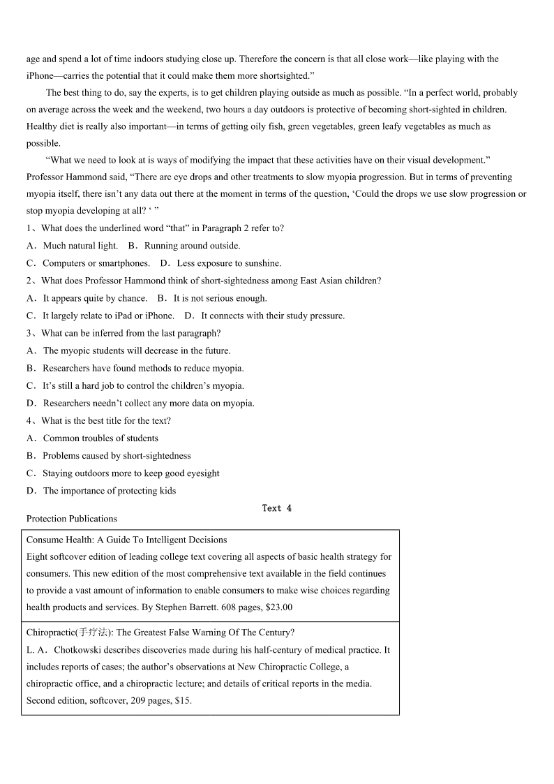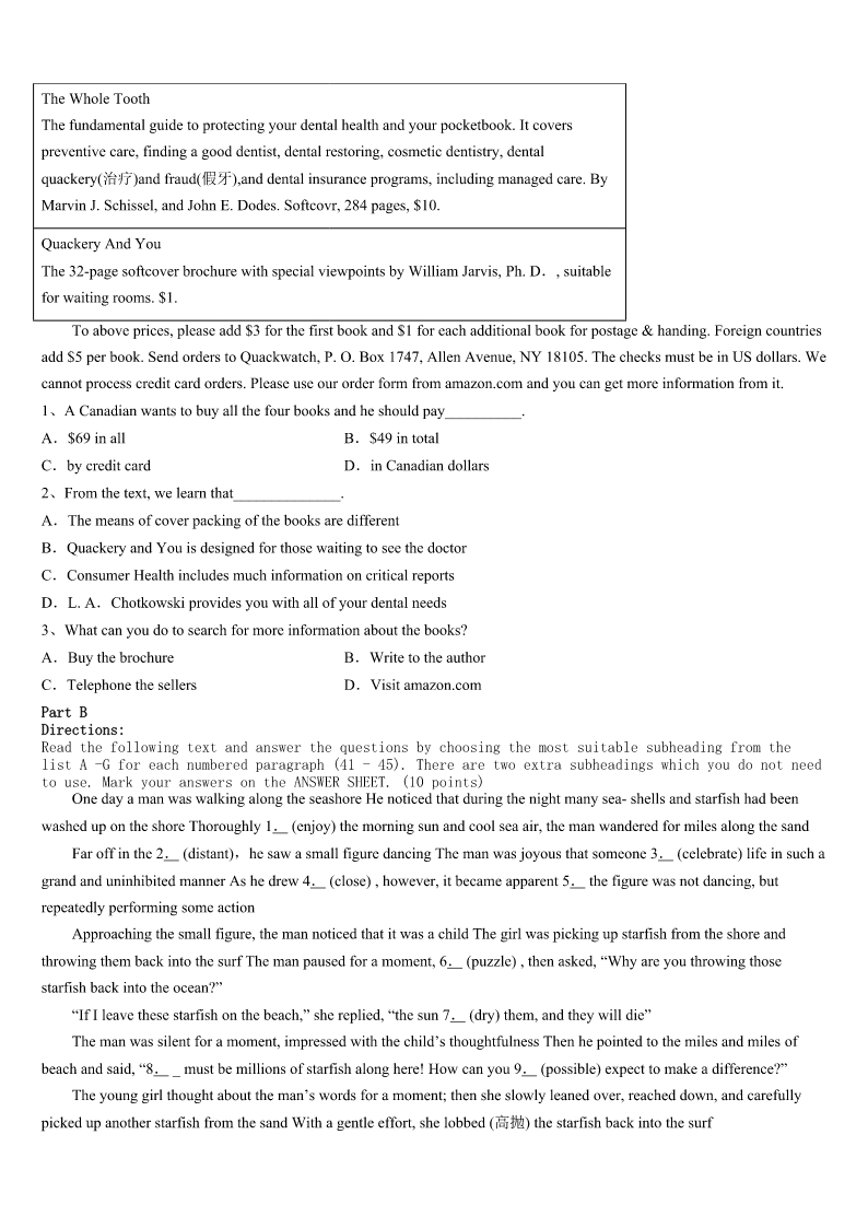 西藏日喀则地区仁布县2023年考研《英语一》模拟试题 SectionIUseofEnglish Directions: Readthefollowingtext.Choosethebestword(s)foreachnumberedblankandmarkA,B,CorDonthe ANSWERSHEET.(10points) 第三节完形填空:(共20小题,每小题1.5分,满分30分) 阅读下面短文,掌握其大意,然后从21-40各题所给的四个选项(A、B、C和D)中,选出最佳选项。 Ayoungstudentwasonedaytakingawalkwithaprofessor,whowascommonly21thestudents’friend.Astheywent22, theysawlyinginthepathapairofold1,whichtheysupposedtobelongtoapoormanwhowasemployedina24closeby. Thestudentsaying,“Let’splaythemana25:Wewillhidehisshoes,and2ourselvesbehindthosebushes,andwaittosee his27whenhecannotfindthem.” “Myyoungfriend,”answeredtheprofessor,“weshouldnever28ourselvesatthe29ofthepoor.Butyouare3,andmay giveyourselfamuchgreater31thepoorman.Putacoinintoeachshoe,andthenwewillhideourselvesand32howthe discoveryaffectshim.”Thestudentdidso,andtheybothplacedthemselvesbehindthebushes.Thepoormansoonfinishedhis work,andcame4thefieldtothepath34hehadlefthiscoatandshoes.While35hiscoatheslippedhisfootintooneofhis shoes;butfeeling5,hestoppeddowntofeel37itwas,andfoundthecoin.Astonishmentandwonderwereseenuponhis face.Henowputthemoneyintohispocket,buthis38wasdoubledonfindingtheothercoin.Hefelluponhisknees,lookedup toheavenandutteredaloudafervent(热烈的)thanksgiving,inwhichhe39hiswife,sickandhelpless,andhischildren withoutbread.Thestudentstoodtheredeeply40,andhiseyesfilledwithtears. 1、A.heldB.keptC.namedD.called 2、A.alongB.onC.overD.back 3、A.socksB.glovesC.shoesD.trousers 4、A.fieldB.factoryC.companyD.shop 5、A.gameB.trickC.jokeD.word 6、A.hideB.haveC.letD.make 7、A.excitementB.sorrowC.disappointmentD.anxiety 8、A.makeB.treatC.amuseD.laugh 9、A.priceB.expenseC.valueD.pay 10、A.poorB.kindC.honestD.rich 11、A.pleasureB.moneyC.thoughtD.benefit 12、A.noticeB.watchC.realizeD.find 13、A.aboutB.acrossC.intoD.by 14、A.whereB.thatC.thereD.which 15、A.wearingonB.dressingupC.puttingonD.pullingin 16、A.softB.terribleC.strangeD.hard 17、A.whatB.howC.whetherD.why 18、A.confidenceB.embarrassmentC.surpriseD.joy 19、A.mentionedB.rememberedC.recommendedD.Reminded 20、A.am