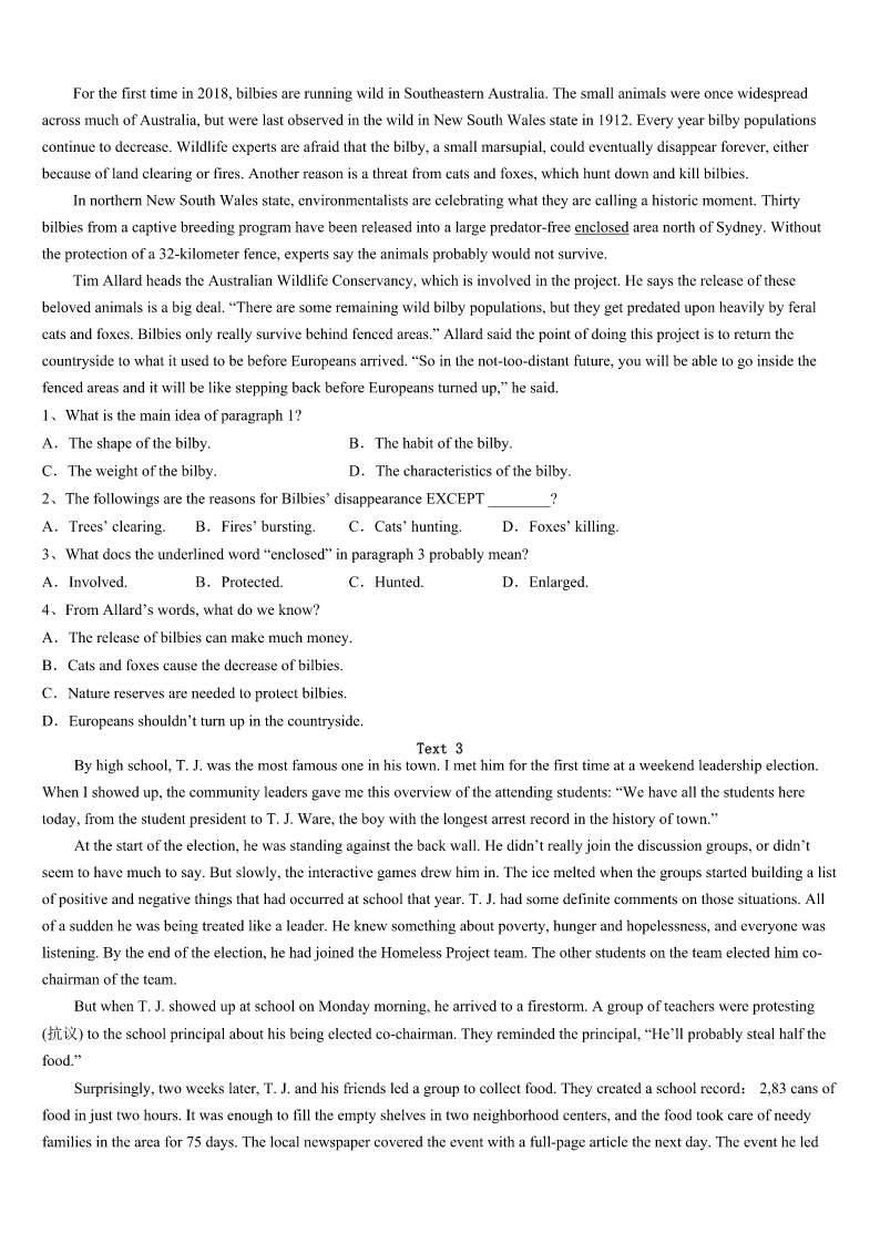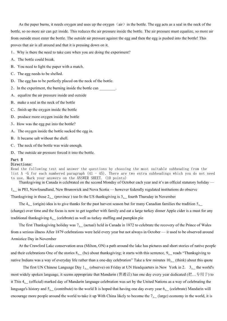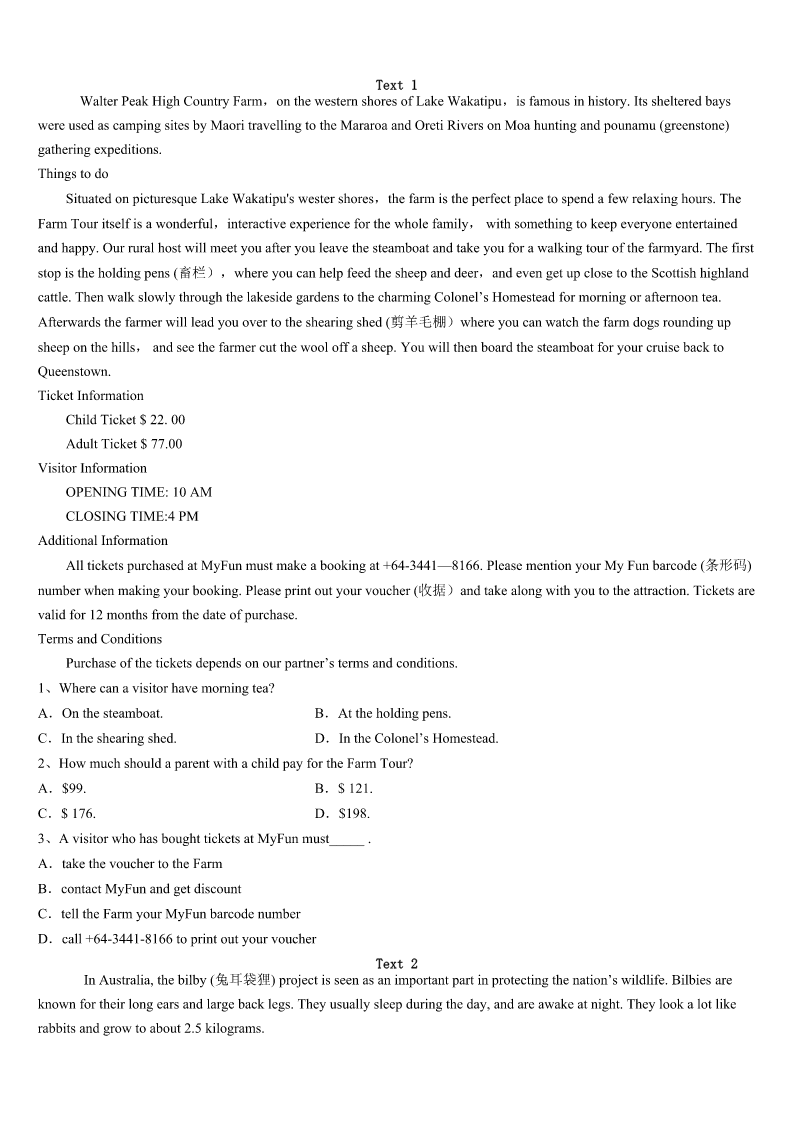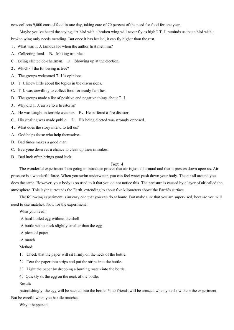 贵德县2023年考研《英语一》全真模拟试卷 SectionIUseofEnglish Directions: Readthefollowingtext.Choosethebestword(s)foreachnumberedblankandmarkA,B,CorDonthe ANSWERSHEET.(10points) Asmydaughterwasridingtoschoolwithhertwofriends,atruckpulledoutinfrontofthem.Theaccident1onMarch 11th,2007-fourdaysbeforeher16thbirthday.Shewas2inthebackseatand3themostinjuries.Shebrokeherface, neck,fourplacesonherbackandrightarmandhadbadbraininjury.The4didnotthinkshewasgoingtosurvive.Shewas known5theonlyrecoveredchildthroughoutthishospital6westayedforoverthreemonths. Ithasbeenoneyear7theaccident.Mydaughterfinally8fromthislife-changingaccident.9myknowledge,our communitychurchhadaBBQand10allraisedmoneytomydaughterforher11expenses.WhenIknowthatthe12 wasdoingforher,youcanimaginemyshock.Sinceithasbeenoneyear,fewpeopleremembermydaughterandmanypeople have13callingherandvisitingher.ByhavingtheBBQ,oursmallcommunityhasshownmydaughterthattherearepeople who14thinkofherandcareabouther. Ihopeif15knowsofsomeonewhoisina(n)16suchasthis,theywillrememberthatthe17ofbeingaloneisvery 18.Showkindnessbyvisitingor19thosewhohadalife-changingevent.Mydaughter'saccident20lessthanaminute butchangedherlife,plusourentirefamily'slifeforever. 1、A.appearedB.reachedC.happenedD.arrived 2、A.ridingB.walkingC.hurryingD.moving 3、A.acceptedB.sufferedC.refusedD.knocked 4、A.patientsB.classmatesC.doctorsD.teachers 5、A.forB.toC.asD.on 6、A.thatB.whereC.whichD.when 7、A.sinceB.beforeC.duringD.over 8、A.cameB.becameC.recoveredD.returned 9、A.UnderB.WithC.InD.Without 10、A.lentB.showedC.gaveD.borrowed 11、A.physicsB.medicalC.chemicalD.schooling 12、A.communityB.neighborC.relationD.street 13、A.forgottenB.regrettedC.stoppedD.enjoyed 14、A.alreadyB.neverC.seldomD.still 15、A.anyoneB.someoneC.nooneD.everyone 16、A.conditionB.situationC.positionD.attitude 17、A.mindB.senseC.feelingD.idea 18、A.painfulB.meaningfulC.peacefulD.doubtful 19、A.rescuingB.teachingC.directingD.calling 20、A.continuedB.lastedC.sparedD.paused SectionIIReadingComprehension PartA Directions: Readthefollo
