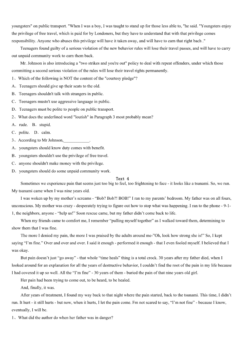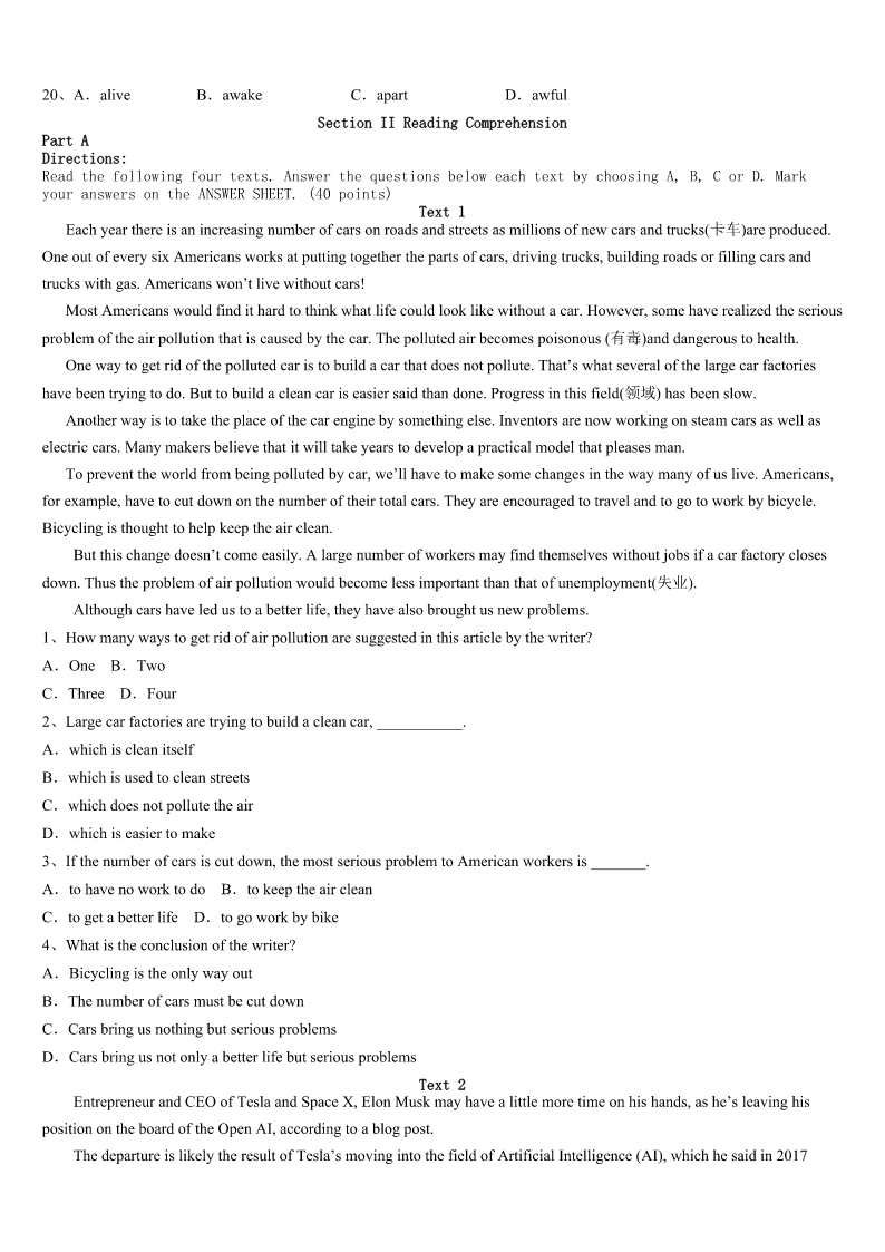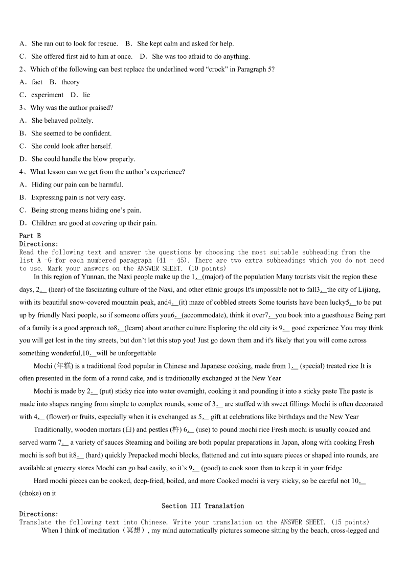 西藏昌都地区贡觉县2023年考研《英语一》临考冲刺试题 SectionIUseofEnglish Directions: Readthefollowingtext.Choosethebestword(s)foreachnumberedblankandmarkA,B,CorDonthe ANSWERSHEET.(10points) ThismorningafterIgotthenewsthatmybestfriend,SeanMisner,whowasoneofthefirefighters,diedinanArizona wildfireinJune,createdaFacebookpageinhis1. SeanandIwerelikebrothers.Wemetplayingbaseballwhenwewereeightyearsold.We2life’supsanddowns together.Hewas26whenhedied. Iwasin3whenIfoundoutthesituation.Friendsofhis4photosandinformationonhispage,andIsetupaway forpeopleto5moneytoSean’swife,Amanda,andtheirson,rightthroughFacebook. Mysisterisajournalist,andshesuggestedthatwearrangeeverything6whilethefirewasgettingnational7.In thefirstcoupleofdays,Sean’spagegot2,000likes.Todayithasmorethan27,000likes. WhenSean’sfamilydrovehisashes500milesfromPrescott,Arizona,tohis8inSantaYnez,California,firefighters hadbeenstandingoneveryhighwayoverpass(立交桥). Iwassurprisedathowmuchit9metoseethatotherpeoplecared.StrangersweresendingFacebookmessages,10 babyclothestoAmandaandwe’ve11about$10,000forhisson’seducation.OnepostisfromalittleboyinNevadawho said,whenhe12hewantstobeafirefighter.It13touchedme.PeoplepostedmessagesaboutwhataheroSeanwasand theywereright.Thereisalotof14onthatFacebookpage.I15oneday,whenSean’sson,SeanJaxon,is16 enough,hewillseehow17hisfatherwasthroughthispage. DuringmomentswhenImissSean,Ivisitthe18,anditmakesmesmile.Onmybirthdayorhisbirthdayorsome19 date,I’llreadthemessagesandlookatthephotosthatpeoplehaveposted.Itsawayformetokeephismemory20. 1、A.honourB.absenceC.existenceD.death 2、A.gotthroughB.passedthroughC.wentthroughD.lookedthrough 3、A.fearB.horrorC.anxietyD.shock 4、A.tookB.hungC.developedD.posted 5、A.saveB.donateC.makeD.earn 6、A.practicallyB.sincerelyC.quicklyD.regularly 7、A.attentionB.supportC.sympathyD.recognition 8、A.officeB.homeC.schoolD.community 9、A.entertainedB.frightenedC.comfortedD.astonished 10、A.offeringB.intendingC.expectingD.conveying 11、A.graspedB.foundedC.figuredD.raised 12、A.turnsupB.picksupC.comesupD.