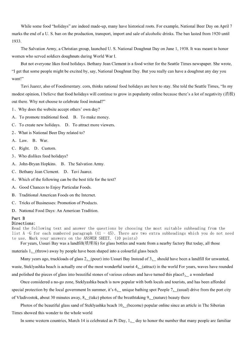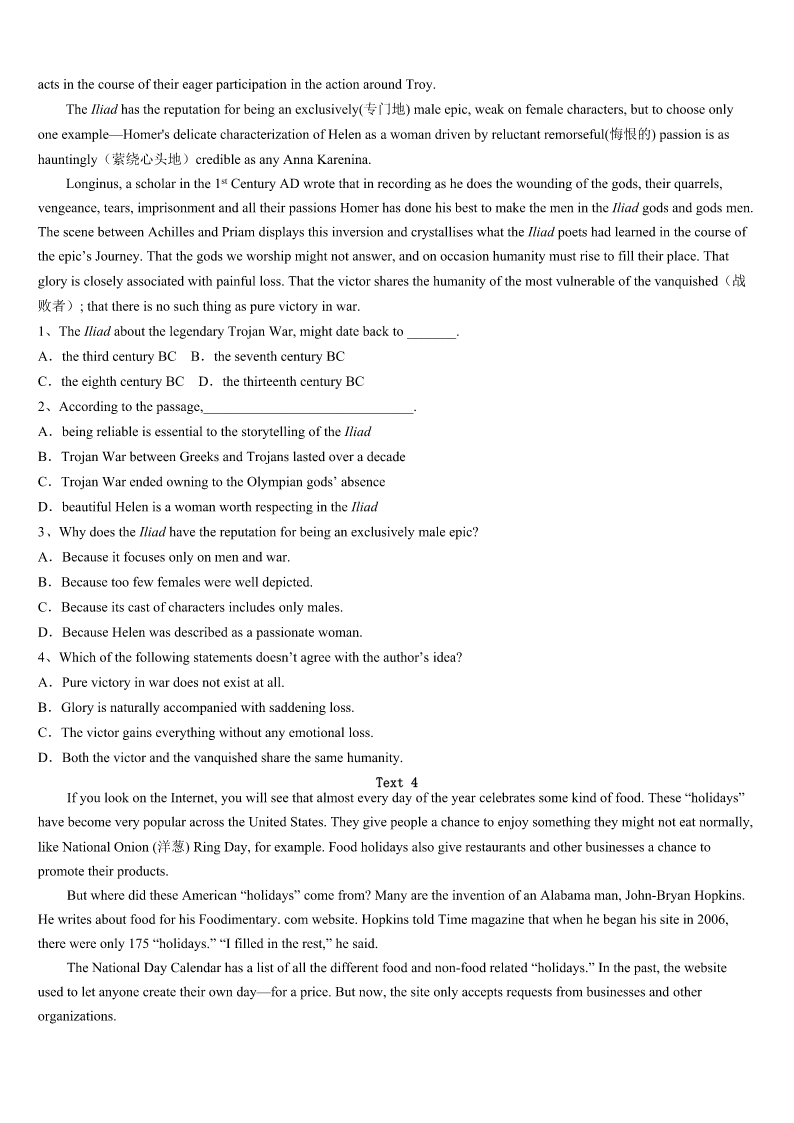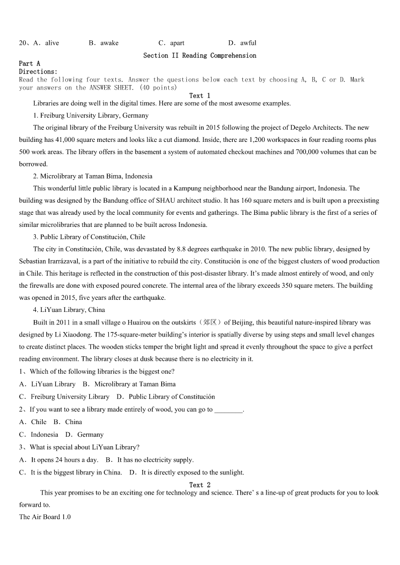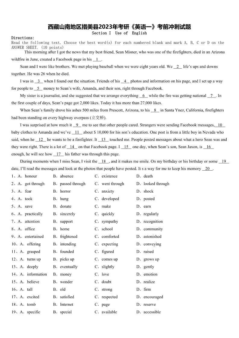 西藏山南地区措美县2023年考研《英语一》考前冲刺试题 SectionIUseofEnglish Directions: Readthefollowingtext.Choosethebestword(s)foreachnumberedblankandmarkA,B,CorDonthe ANSWERSHEET.(10points) ThismorningafterIgotthenewsthatmybestfriend,SeanMisner,whowasoneofthefirefighters,diedinanArizona wildfireinJune,createdaFacebookpageinhis1. SeanandIwerelikebrothers.Wemetplayingbaseballwhenwewereeightyearsold.We2life’supsanddowns together.Hewas26whenhedied. Iwasin3whenIfoundoutthesituation.Friendsofhis4photosandinformationonhispage,andIsetupaway forpeopleto5moneytoSean’swife,Amanda,andtheirson,rightthroughFacebook. Mysisterisajournalist,andshesuggestedthatwearrangeeverything6whilethefirewasgettingnational7.In thefirstcoupleofdays,Sean’spagegot2,000likes.Todayithasmorethan27,000likes. WhenSean’sfamilydrovehisashes500milesfromPrescott,Arizona,tohis8inSantaYnez,California,firefighters hadbeenstandingoneveryhighwayoverpass(立交桥). Iwassurprisedathowmuchit9metoseethatotherpeoplecared.StrangersweresendingFacebookmessages,10 babyclothestoAmandaandwe’ve11about$10,000forhisson’seducation.OnepostisfromalittleboyinNevadawho said,whenhe12hewantstobeafirefighter.It13touchedme.PeoplepostedmessagesaboutwhataheroSeanwasand theywereright.Thereisalotof14onthatFacebookpage.I15oneday,whenSean’sson,SeanJaxon,is16 enough,hewillseehow17hisfatherwasthroughthispage. DuringmomentswhenImissSean,Ivisitthe18,anditmakesmesmile.Onmybirthdayorhisbirthdayorsome19 date,I’llreadthemessagesandlookatthephotosthatpeoplehaveposted.Itsawayformetokeephismemory20. 1、A.honourB.absenceC.existenceD.death 2、A.gotthroughB.passedthroughC.wentthroughD.lookedthrough 3、A.fearB.horrorC.anxietyD.shock 4、A.tookB.hungC.developedD.posted 5、A.saveB.donateC.makeD.earn 6、A.practicallyB.sincerelyC.quicklyD.regularly 7、A.attentionB.supportC.sympathyD.recognition 8、A.officeB.homeC.schoolD.community 9、A.entertainedB.frightenedC.comfortedD.astonished 10、A.offeringB.intendingC.expectingD.conveying 11、A.graspedB.foundedC.figuredD.raised 12、A.turnsupB.picksupC.comesupD.