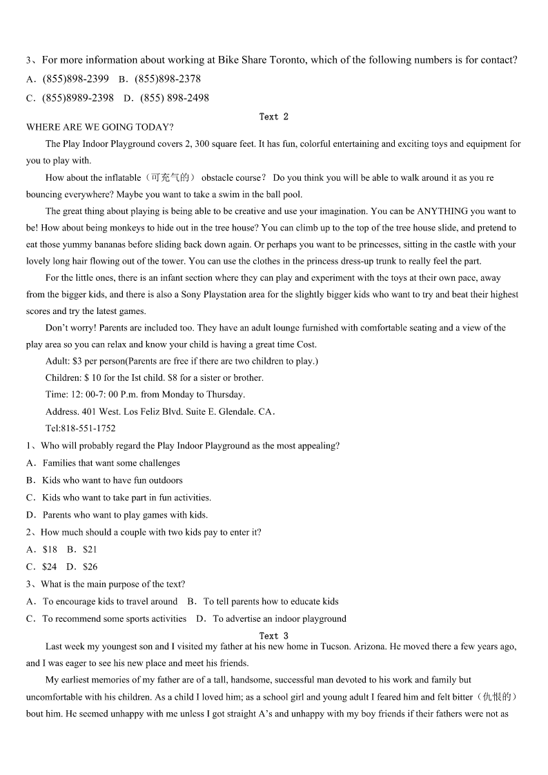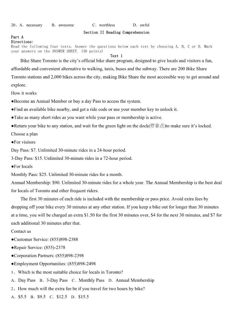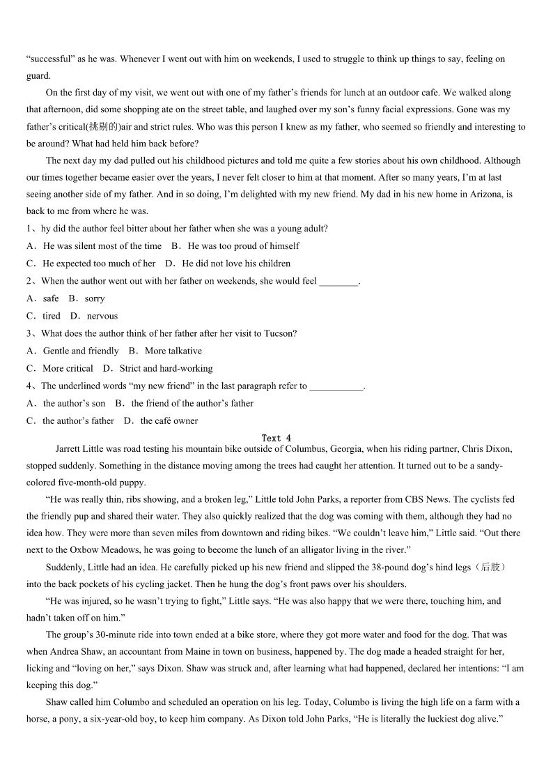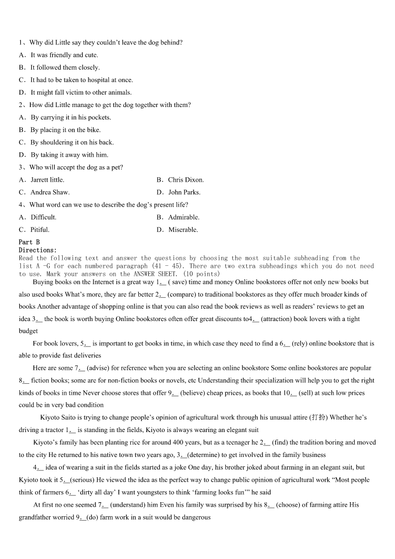 西藏日喀则地区岗巴县2023年考研《英语一》深度预测试卷 SectionIUseofEnglish Directions: Readthefollowingtext.Choosethebestword(s)foreachnumberedblankandmarkA,B,CorDonthe ANSWERSHEET.(10points) Awaveofrecentresearchhaspointedtotherisksofoverpraisingachild.Anditseemsthathowtodrawalinebetweentoo littlepraiseandtoomuchhasbecomeahigh-pressure__actforparents. Self-esteem(自尊)servesasakindoftooltomeasurehowmuchchildrenfeelvaluedandacceptedby1Thissensitivityto others'2developsbecauseofhumans'needforsocialacceptance,whichisconsideredtobe3tosurvival.Asearlyasage 8,children'sself-esteemtendstoriseandfallinresponsetofeedbacksabout4peersseethemaslikableorattractive.5,it canalsobebeneficialforkidstofeelbadaboutthemselvesoccasionally,iftheybehaveinselfish,meanorhurtfulwaysthat might6theirabilitytomaintainrelationshipsorholdajobinthefuture. Inthepast,manyparentsandeducatorsbelievedthathighself-esteem7happinessandsuccess,andkidscouldgainself- esteemsimplybygetting8andawardsfromtheirparents,teachersandpeoplearound.Butrecentlyresearchershavefound self-esteemdoesn't9thesedesiredresults.Instead,ifparentspraisetheirkids10,theirself-esteembecomesfocusedon beingverysmartandbeingthebestandbeingperfect.Buildingtoomuchself-esteemofthechildrencannotgoasplanned, makingthemfeel11lateronwhentheyhitsetbacks(挫折). Accordingtosomeexperts,itcanactuallybegoodforkidstohave12self-esteem,atleastonceinawhile.Andpraisecanbe 13ifitdisregardstheworldoutsidethehome.Childrenwhohavea14understandingofhowtheyareseenbyotherstendto getrecoveredmorereadily15disappointment,depressionorthelike.Thebestpathisa16road,helpingchildrendevelop apositivebut17viewofthemselvesinrelationtoothersbypraisingthemforthe18theyinvestandbehaviorstheyare abletosustain,like"It's19thatyou'reworkingsohardonyourhomework." 1、A.balancingB.crashingC.forcingD.embarrassing 2、A.themselvesB.parentsC.othersD.teachers 3、A.viewsB.enviesC.favorsD.blames 4、A.irrelevantB.similarC.importantD.sensitive 5、A.whenB.whetherC.howD.where 6、A.IndeedB.OtherwiseC.ThereforeD.However 7、A.improv