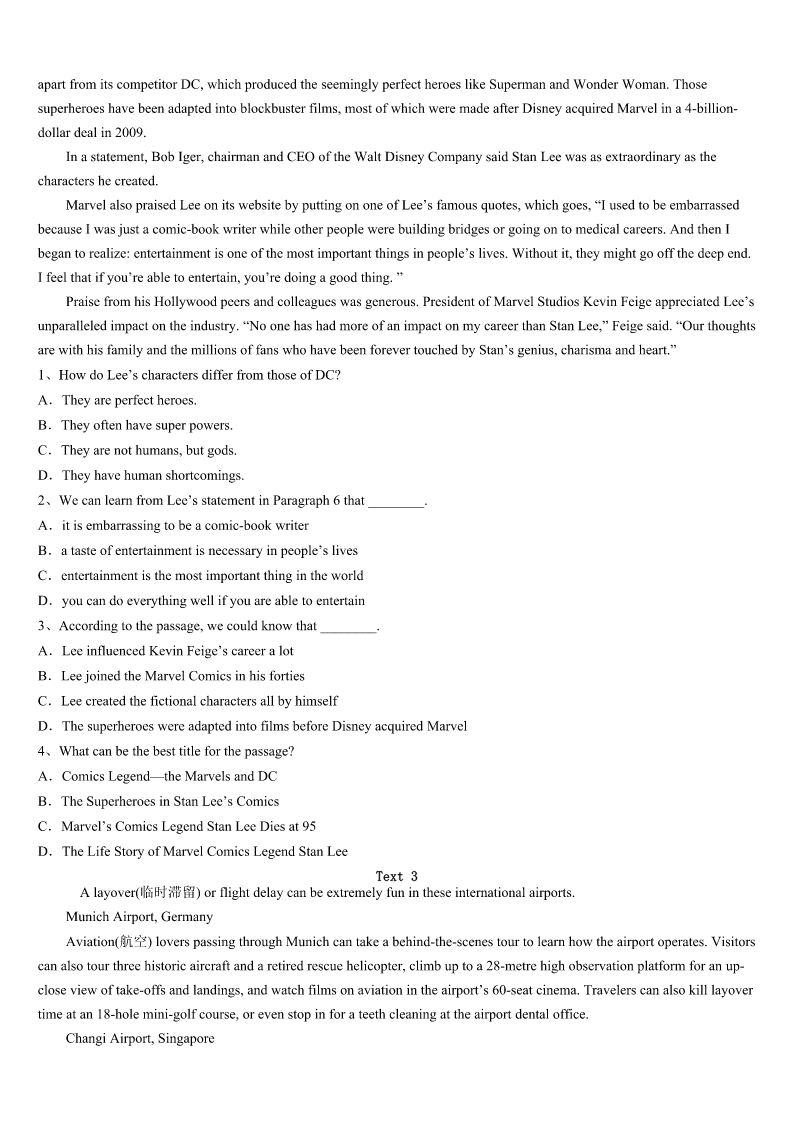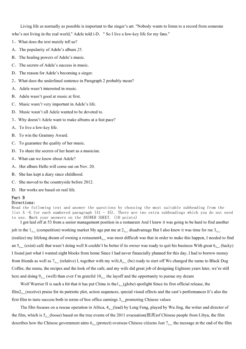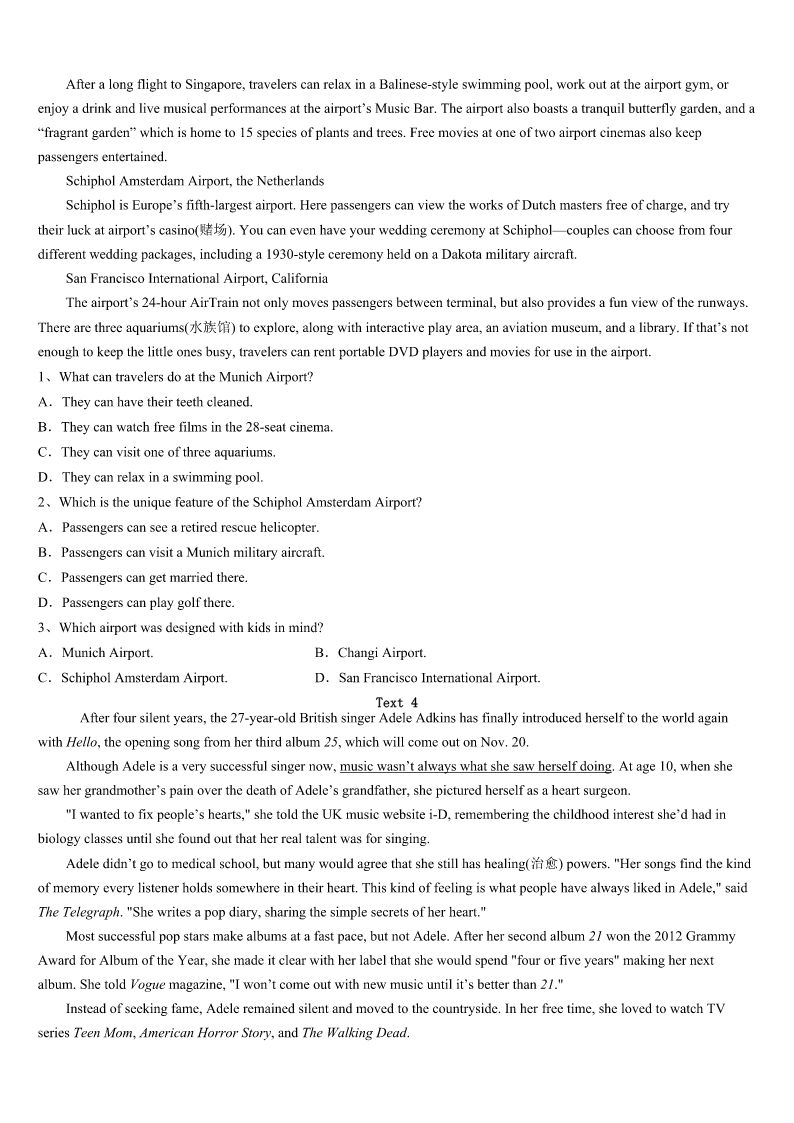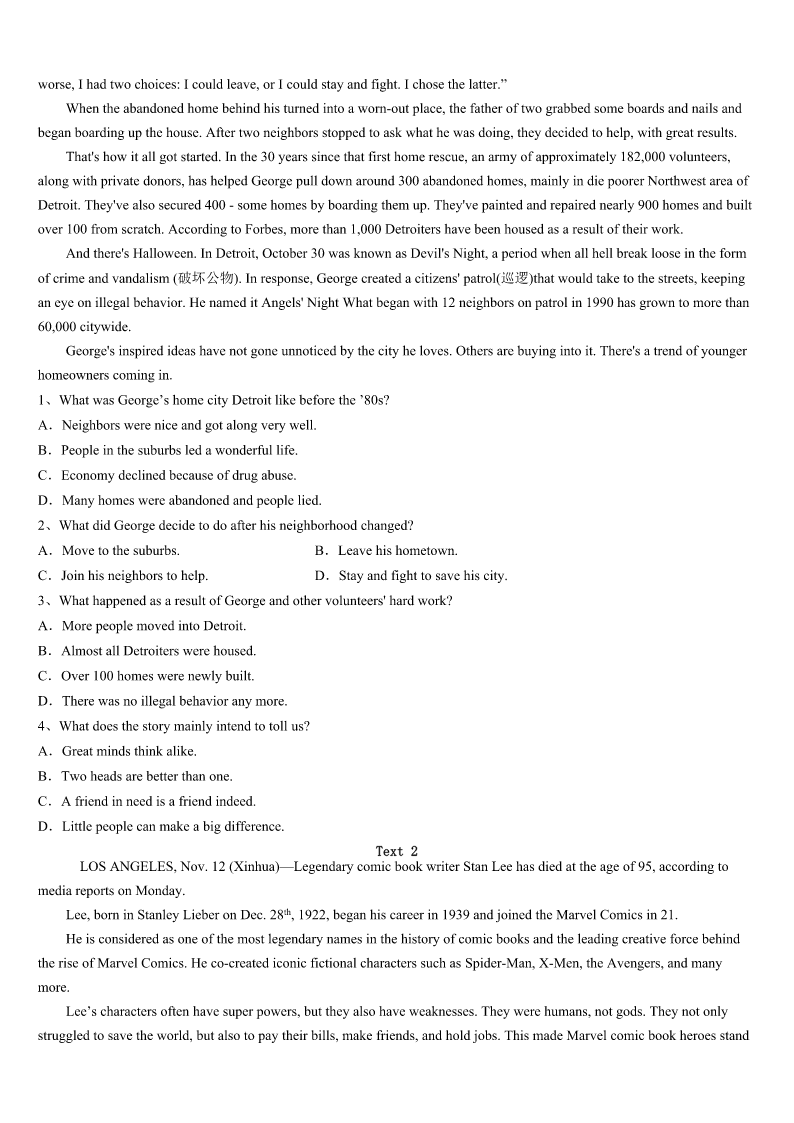 2023年承德市围场满族蒙古族自治县考研《英语一》全真模拟试卷 SectionIUseofEnglish Directions: Readthefollowingtext.Choosethebestword(s)foreachnumberedblankandmarkA,B,CorDonthe ANSWERSHEET.(10points) 完形填空(本题共10小题, 阅读下面短文,然后从各题所给的四个选项中选出一个最佳答案。 Willtheskyeverfall?Theanswerisno.Butifit________,there’snoneedtobeafraid! ChickenLittleisanAmericancartoonfilm.It’sverypopulararoundtheworld.Itsstoryteachesus:don’tworrytoomuchin your________. OnedayChickenLittleisintheforestwhenanacorn(橡果)fallsonhishead!Thismakeshim________.Hethinksapiece oftheskyisfalling! Hecan’twaittotell________aboutit.Theyrunfortheirlives! Whenpeople________thetruth,noonelikesChickenLittle.Theylaughathim.Hegetsabadnameinthetown.It’stimefor himtochangeothers’________. ChickenLittlebeginstoplaybaseball.Heisnotbiggerthanaball,________heplaysitverywell!Hehelpshisteam________. Nowtheythinkhe’sgreat. Justthen,aspaceshipreallydoesfallfromthe________!Thealiens(外星人)havebadplans.Onceagainhemusttellpeople aboutit. Willhegethelpfromhisfriendsinthetown?Canheshowhimselfa/an________person?Youwillgettheanswerfromthe cartoonfilm. 1、A.takesB.happensC.leavesD.works 2、A.lifeB.familyC.sportsD.study 3、A.happyB.excitedC.surprisedD.afraid 4、A.anyoneB.someoneC.everyoneD.noone 5、A.forgetB.writeC.knowD.ask 6、A.mindsB.plansC.programsD.jobs 7、A.andB.soC.butD.or 8、A.loseB.beatC.missD.win 9、A.landB.waterC.grassD.sky 10、A.difficultB.differentC.outgoingD.beautiful SectionIIReadingComprehension PartA Directions: Readthefollowingfourtexts.AnswerthequestionsbeloweachtextbychoosingA,B,CorD.Mark youranswersontheANSWERSHEET.(40points) Text1 JohnGeorge,60,remembersthathelivedawonderfullifeintheDetroitneighborhoodwherehegrewup.“Weknewall ourneighbors.”GeorgetoldDetroit'sMetroTimes.“OnChristmasEve,we'dallgotomidnightMass,andthere'dbe300 peopleinourhouseatoneo’clocktoaboutfiveinthemorning.Thefolkswerejustreallygood,hardworkingpeople.” Bythe'80s,however,theoldneighborhoodchanged.Dueinparttoeconomicdownturnsanddrugabuse,well-kepthomes hadbeenabandonedandkindlyneighborshadfledto