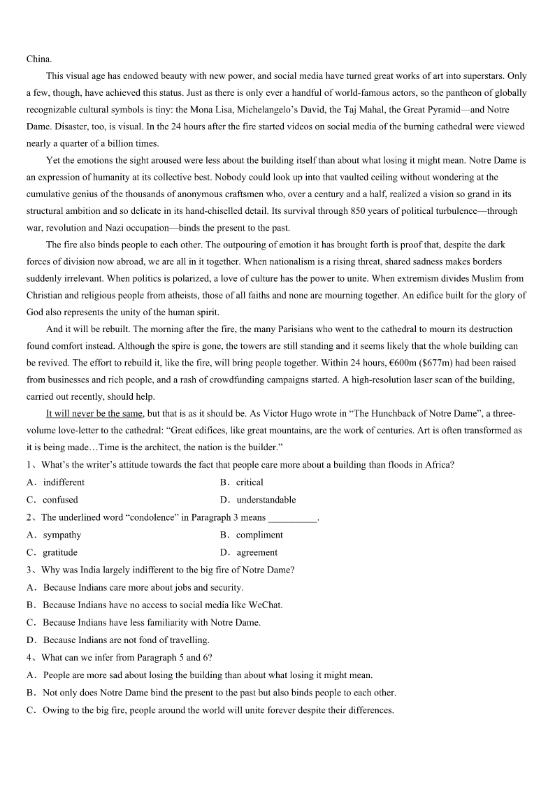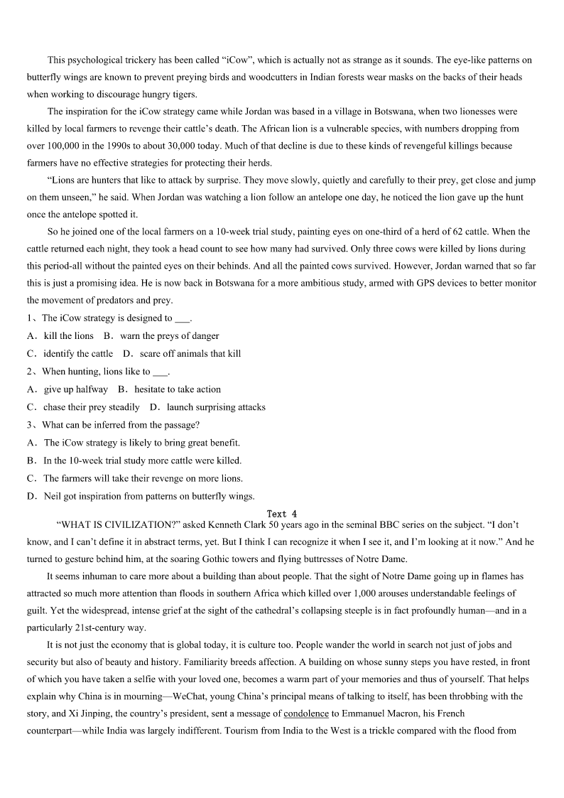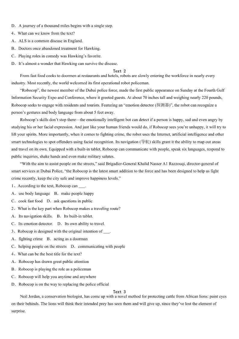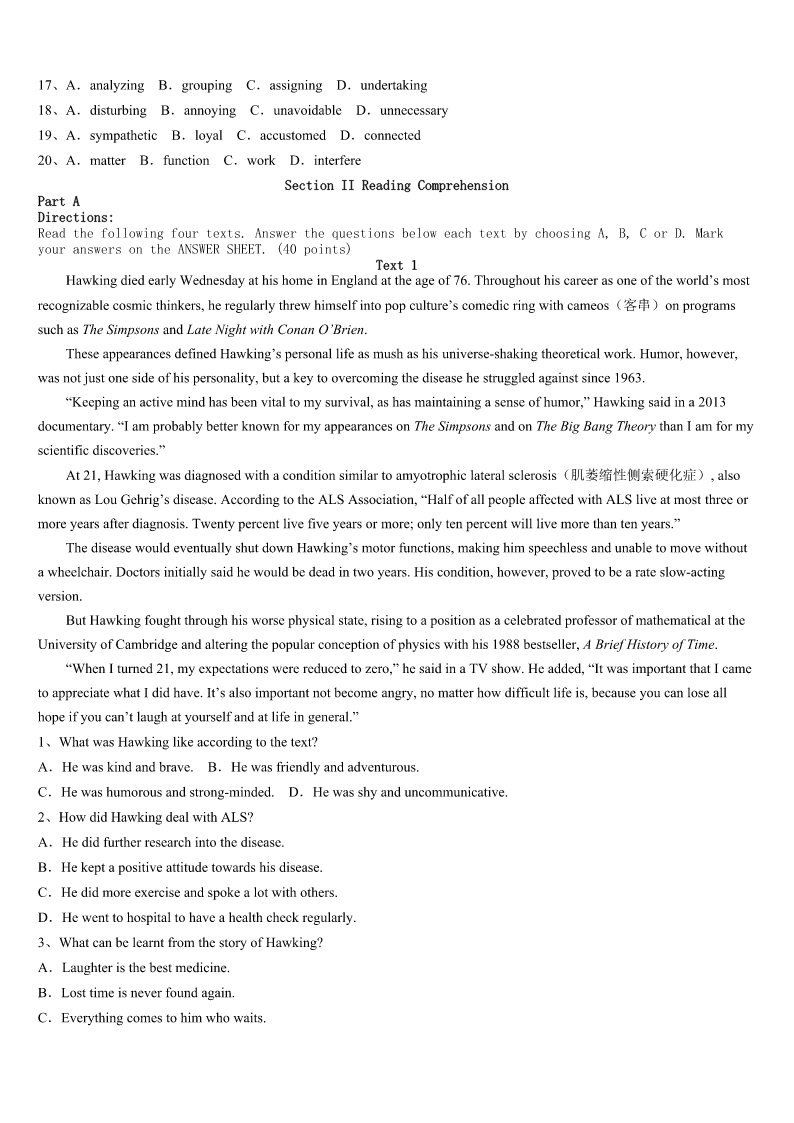 谢家集区2023年考研《英语一》高分冲刺试卷 SectionIUseofEnglish Directions: Readthefollowingtext.Choosethebestword(s)foreachnumberedblankandmarkA,B,CorDonthe ANSWERSHEET.(10points) Researchshowsthatwhenweareabsorbedinanactivity,evenminordistractions(分心)canhaveahugeeffect.According toastudy,regainingour1drivefollowinganinterruptioncantakeabout20minutes. Multitasking(多任务),asmanystudieshaveshown,isamyth(谬论).Amoreaccurate2ofwhathappenswhenwetell ourselveswearemultitaskingisthatwe’rerapidly3betweenactivities,suckingourmentalenergy.Andthe4canbe surprisinglyserious.Anexperimentfoundthatweloseasmanyas10IQpointswhenweallowourworktobe5by distractionslikeemailsandtextmessages. The6isthatmultitaskingisenjoyable.It’sfuntosatisfyyourcuriosity.Whoknowswhatthatnextemailortext messageholds7?Findingoutprovidesimmediatesatisfaction.8,resistingdistractionsandstayingontaskrequires9 andmentaleffort. So,whatarewetodo? Ourstrategyistochangethe10tomovetemptationfurtheraway:shutdownyouremailprogramor11yourphone. It’saloteasiertostayontaskwhenyou’renot12fightingoffmentaldesires. Thealternative,whichmostofusconsidercommon,is13todietinginabakery.Weallneedthewillpowertoresistthe temptations,butdoingsocomeswith14coststoourlimitedsupplyofwillpower. Anotherworthwhile15istocollectsimilaractivitiestogether,keepingtransition(转换)timetoa16point.Instead ofspreadingphonecalls,meetingsandemailsthroughoutyourday,try17relatedtaskssothattherearefewertransitions. Insomejobs,multitaskingis18.Someofustrulydoneedtostay19toourclients,colleaguesandmanagers.Soit's worthnotingthatlimitingdisruptionsistheonlysolution. Rememberthemoreyoudotominimizetask-switchingoverthecourseoftheday,themoreabilityyou’llhaveforactivities thatactually20.Evensmallchangescanmakeabigdifference. 1、A.initialB.personalC.innerD.ambitious 2、A.planB.accountC.predictionD.insight 3、A.switchingB.swingingC.swappingD.shuttling 4、A.benefitsB.reasonsC.consequencesD.challenges 5、A.guidedB.changedC.adaptedD.interrupted 6、A.advantageB.emphasisC.troubleD.practice 7、A.instockB