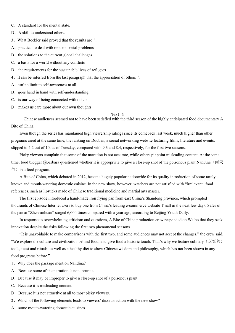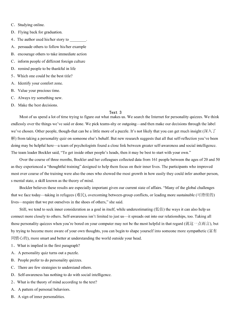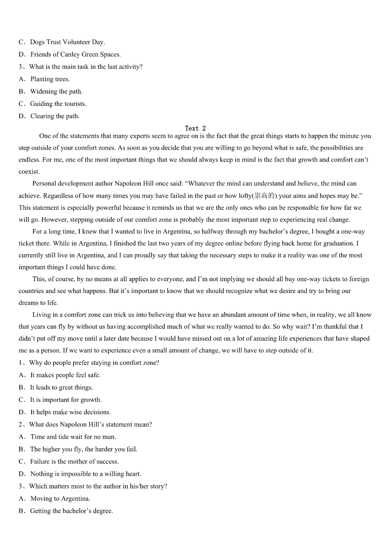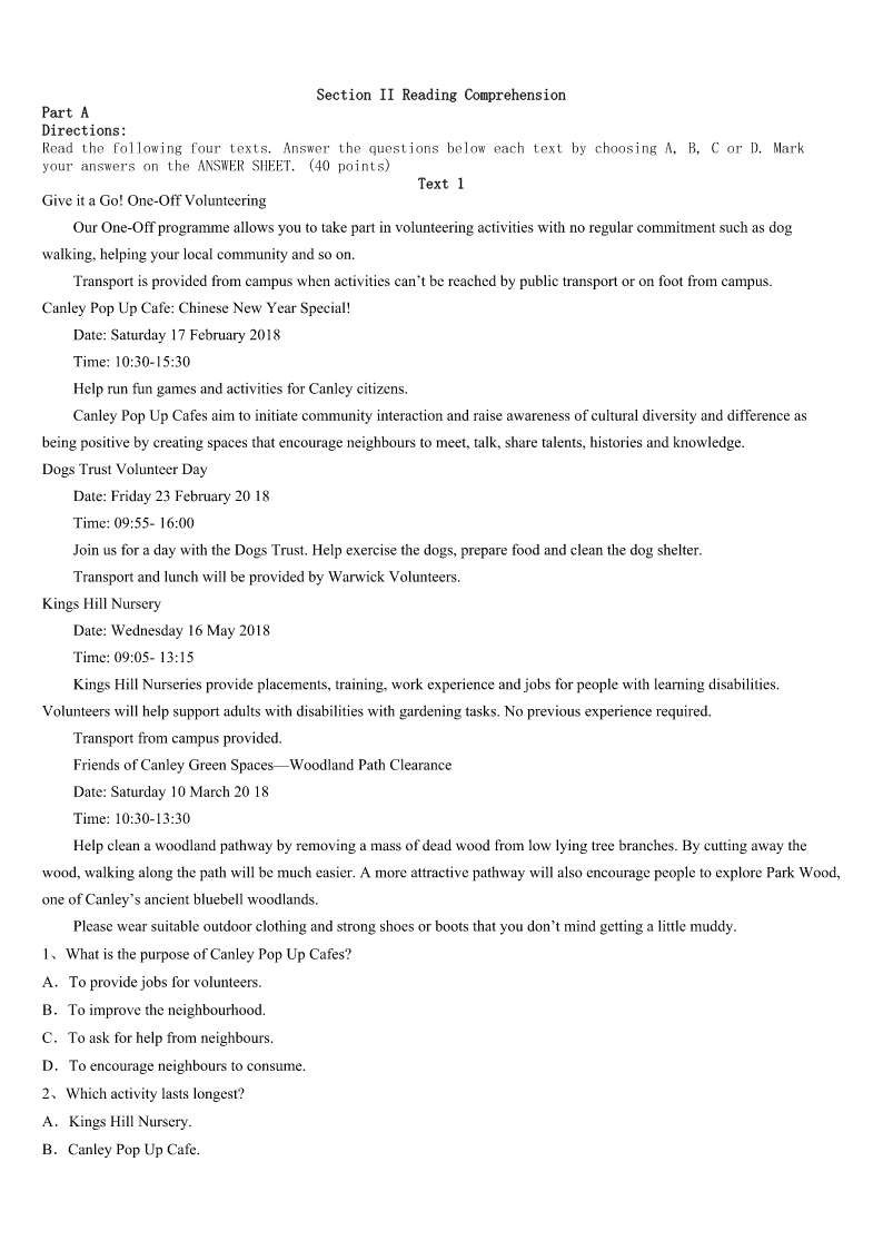 2023年抚顺市新抚区考研《英语一》高分冲刺试卷 SectionIUseofEnglish Directions: Readthefollowingtext.Choosethebestword(s)foreachnumberedblankandmarkA,B,CorDonthe ANSWERSHEET.(10points) WhenIwasyoung,Ibelongedtoaclubthatdidcommunityservicework.Therewasonespecific36thatwasunusualforme.I spentthreeorfourhourshandingoutwarmdinnertothehomeless37inthestreets.AfterthatIwenttoahomelessshelternot farfromtheBayBridge. Iwasinhighschoolandatthetimemysisterwastooyoungto38.Shewantedtohelp,39shemademanychocolatechip cookiesformeto40andhandouttopeople.Whengettingtotheshelter,Ipassedoutthe41.Ibeganmakingsandwiches and42themwiththecrowd.Ihadthecontainerswithmysister’s43inthemandbeganto44around,offeringthemto anyonenearme. Iapproachedan45gentlemanandsaid,“Sir,wouldyoulikeacookie?”Hestoppedandturnedaround,lookedatmeand said,“Whatdidyousay?Didyoucallmesir?”ItoldhimIhad,andhiseyes46alittlebitandsaid,“Noonehas47 calledmesir.’Sohewascompletelymoved. It48me. IexplainedIhadbeenraisedthat49colorandsocialstatus,everyonedeservedrespect.It50metothinkthatjustbecause hewashomeless,noone51himthehonor.Itbrokemyheart.Ijustdidn’tunderstand52nooneevercalledhimsir.Ihad neverthoughtthatanyonewasbelowmebecauseIwasn’traisedthatway.Every53persondeservestobetreatedwith respect.Yearslater,Istillcarrythatmemoryandthe54ittaughtme.Sometimes,whatwetakeforgrantedcan55make adifferenceinsomeone’slife. 1、A.caseB.chanceC.eventD.accident 2、A.outB.farC.awayD.off 3、A.participateB.decideC.chooseD.go 4、A.howeverB.butC.yetD.so 5、A.enjoyB.eatC.collectD.take 6、A.papersB.mealsC.booksD.gifts 7、A.sharedB.providedC.helpedD.returned 8、A.dishesB.fruitsC.cookiesD.sandwiches 9、A.walkB.turnC.runD.show 10、A.well-dressedB.innocentC.oldD.modest 11、A.wateredB.criedC.openedD.closed 12、A.neverB.everC.stillD.yet 13、A.encouragedB.attractedC.struckD.defeated 14、A.inspiteofB.regardlessofC.incaseofD.becauseof 15、A.persuadedB.saddenedC.frightenedD.moved 16、A.handedB.offeredC.remindedD.promised 17、A.whatB.howC.whetherD.why 18、A.singleB.usualC.ordinaryD.normal 19、A.less