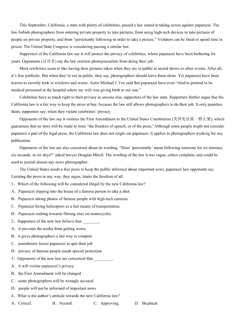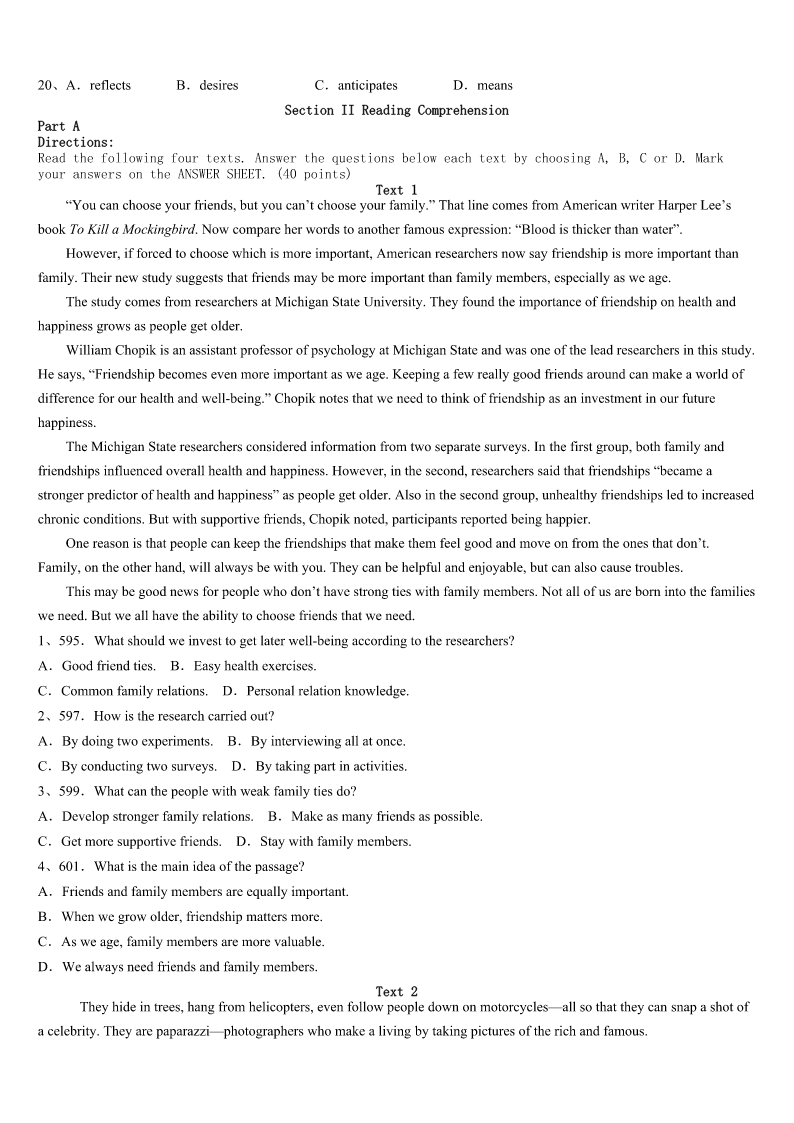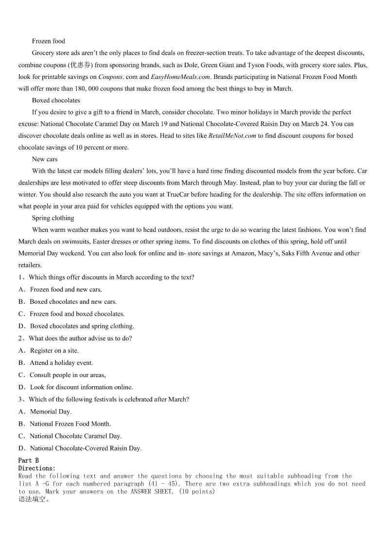 辽宁省鞍山市千山区2023年考研《英语一》高分冲刺试题 SectionIUseofEnglish Directions: Readthefollowingtext.Choosethebestword(s)foreachnumberedblankandmarkA,B,CorDonthe ANSWERSHEET.(10points) MykidssitinGee’slivingroomandcautiouslyliftantiqueChristmasornaments(饰品)outofawell-lovedcardboard box.Geestandsbesidethem,quietly1eachtreasure.ShetellsmethatsheandTombuilttheirornament2pieceby pieceduringeachyear’safter-Christmassale.She3asweleavewiththebox.Herprecioustreasures,gatheredovera lifetime,havefoundanew4. WefirstmetTomandGeeintheearlydaysofourmarriage.Someonehadbeen5ourgarbagecanstothegarageeach garbageday,andJimandIhad6who.Thenonedaywe7him:anelderlymanwholivedacrossthestreet. Ibakedcookiesandleftthemonastooloutsidethegaragewithathank-younote.Whenwegothomefromworkthatday, atypedletterhad8thegift.TheletterwasfromTomandexplainedhowhehadcometowalktheneighborhoodongarbage day,returningcansforpeoplehe9knew.Backwhenhe’dbeenfightingawarIwasn’t10tosee,hisyoungwife,Gee, hadfoundherselflivingalone.Neighborshadtakenthetimetohandlehergarbagecans11shedidn’thaveto,andhenever forgot.Nowhe12itforwardbydoingthesameforallofus. Afewyearsafterwe’dmovedin,Tom13.Wephotocopiedthat14andattachedittooneofourownforGee.We toldherhow15Tomhadbeentousandhowwegrievedforher.Shewrotebackandtoldusshe16talkedtoTomevery day.WhenGeeinvitedusovertolookthroughChristmasornaments,Irealizedhowharditmustbeto17withthatbox,a pieceofTom. JimandIagreeto18ourtreewithGee’sornamentsthisChristmas,outoftheboxthatis19inTom’shandwriting. MaybeI’lltalktohimjustasGeestilldoes.Thankyou,I’llsay,forteachinguswhatit20tobeaneighbor. 1、A.confirmingB.explainingC.revealingD.touching 2、A.shelfB.basementC.artD.collection 3、A.smilesB.weepsC.sighsD.hesitates 4、A.homeB.destinationC.functionD.chance 5、A.distributingB.exposingC.returningD.attaching 6、A.discoveredB.wonderedC.foreseenD.investigated 7、A.spottedB.impressedC.acknowledgedD.grasped 8、A.answeredB.replacedC.deliveredD.rewarded 9、A.especiallyB.thoroughlyC.previouslyD.barely 10、A.willingB.voluntaryC.aliveD.