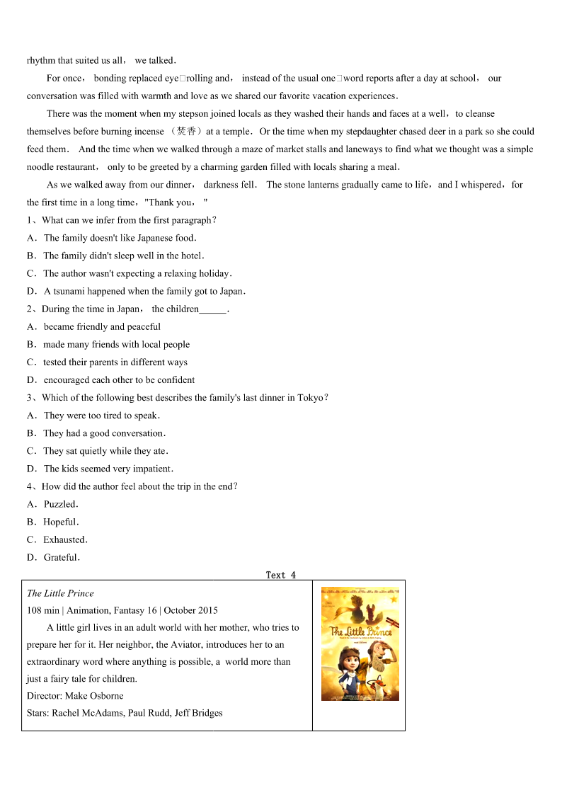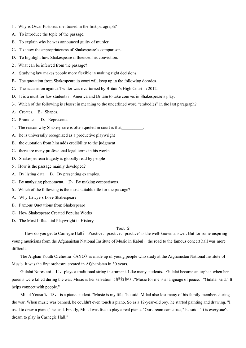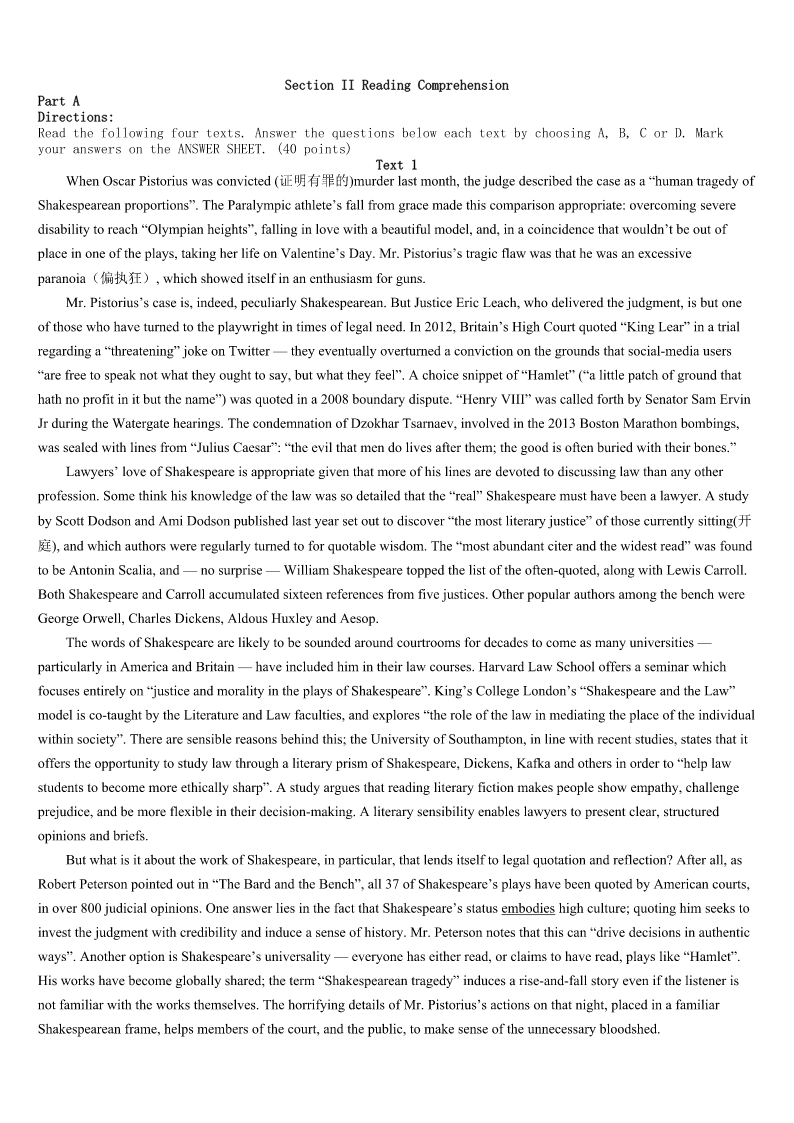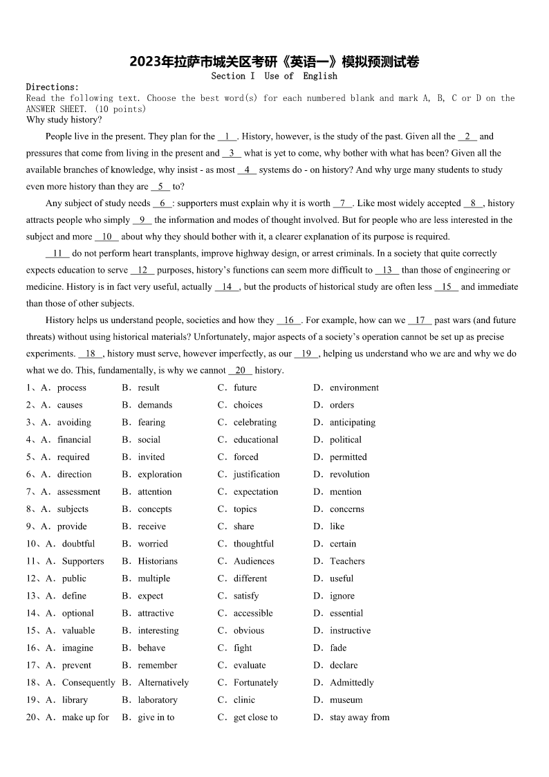 2023年拉萨市城关区考研《英语一》模拟预测试卷 SectionIUseofEnglish Directions: Readthefollowingtext.Choosethebestword(s)foreachnumberedblankandmarkA,B,CorDonthe ANSWERSHEET.(10points) Whystudyhistory? Peopleliveinthepresent.Theyplanforthe1.History,however,isthestudyofthepast.Givenallthe2and pressuresthatcomefromlivinginthepresentand3whatisyettocome,whybotherwithwhathasbeen?Givenallthe availablebranchesofknowledge,whyinsist-asmost4systemsdo-onhistory?Andwhyurgemanystudentstostudy evenmorehistorythantheyare5to? Anysubjectofstudyneeds6:supportersmustexplainwhyitisworth7.Likemostwidelyaccepted8,history attractspeoplewhosimply9theinformationandmodesofthoughtinvolved.Butforpeoplewhoarelessinterestedinthe subjectandmore10aboutwhytheyshouldbotherwithit,aclearerexplanationofitspurposeisrequired. 11donotperformhearttransplants,improvehighwaydesign,orarrestcriminals.Inasocietythatquitecorrectly expectseducationtoserve12purposes,history’sfunctionscanseemmoredifficultto13thanthoseofengineeringor medicine.Historyisinfactveryuseful,actually14,buttheproductsofhistoricalstudyareoftenless15andimmediate thanthoseofothersubjects. Historyhelpsusunderstandpeople,societiesandhowthey16.Forexample,howcanwe17pastwars(andfuture threats)withoutusinghistoricalmaterials?Unfortunately,majoraspectsofasociety’soperationcannotbesetupasprecise experiments.18,historymustserve,howeverimperfectly,asour19,helpingusunderstandwhoweareandwhywedo whatwedo.This,fundamentally,iswhywecannot20history. 1、A.processB.resultC.futureD.environment 2、A.causesB.demandsC.choicesD.orders 3、A.avoidingB.fearingC.celebratingD.anticipating 4、A.financialB.socialC.educationalD.political 5、A.requiredB.invitedC.forcedD.permitted 6、A.directionB.explorationC.justificationD.revolution 7、A.assessmentB.attentionC.expectationD.mention 8、A.subjectsB.conceptsC.topicsD.concerns 9、A.provideB.receiveC.shareD.like 10、A.doubtfulB.worriedC.thoughtfulD.certain 11、A.SupportersB.HistoriansC.AudiencesD.Teachers 12、A.publicB.multipleC.differentD.useful 13、A.defineB.exp
