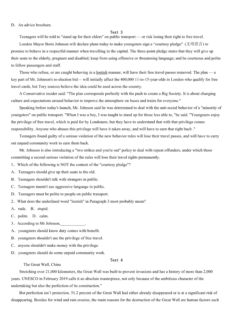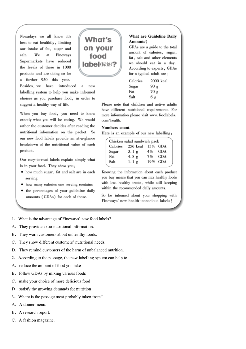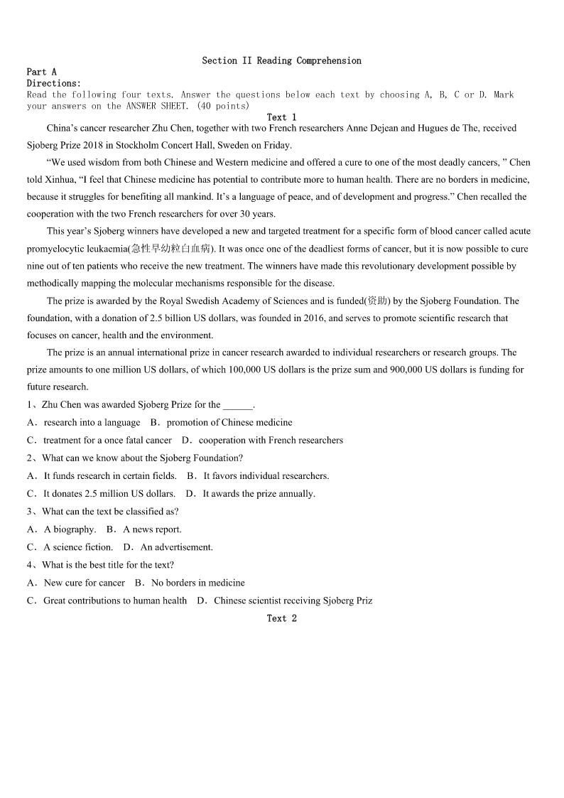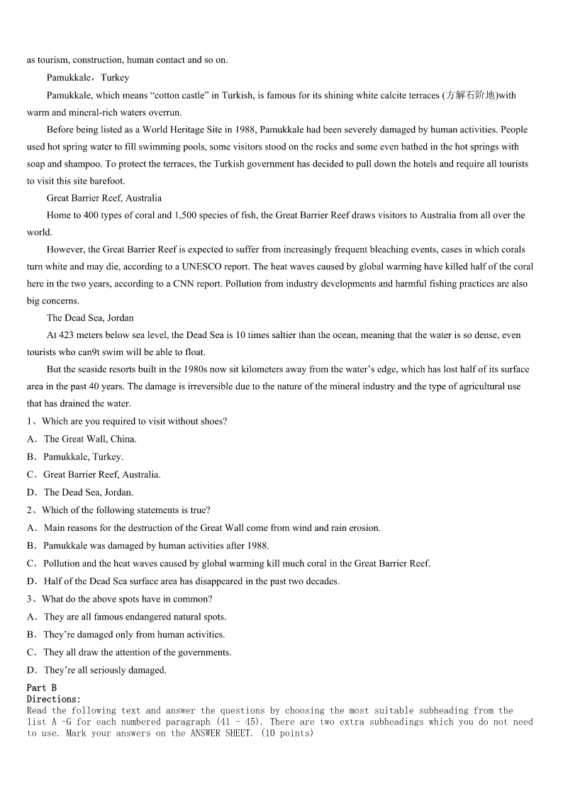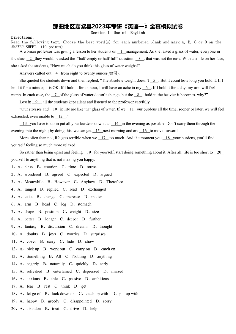 那曲地区嘉黎县2023年考研《英语一》全真模拟试卷 SectionIUseofEnglish Directions: Readthefollowingtext.Choosethebestword(s)foreachnumberedblankandmarkA,B,CorDonthe ANSWERSHEET.(10points) Awomanprofessorwasgivingalessontoherstudentson1management.Assheraisedaglassofwater,everyonein theclass2theywouldbeaskedthe“half-emptyorhalf-full”question.3,thatwasnotthecase.Withasmileonherface, sheaskedthestudents,“Howmuchdoyouthinkthisglassofwaterweighs?” Answerscalledout4fromeighttotwentyounces(盎司). Shequietedthestudentsdownandthenreplied,“Theabsoluteweightdoesn’t5.Butitcounthowlongyouholdit.IfI holditforaminute,itisOK.IfIholditforanhour,Iwillhaveanacheinmy6.IfIholditforaday,myarmwillfeel numb.Ineachcase,the7oftheglassofwaterdoesn’tchange,butthe8Iholdit,theheavieritbecomes.why?” Lostin9,allthestudentskeptsilentandlistenedtotheprofessorcarefully. “Ourstressesand10inlifearelikethatglassofwater.Ifwe11ourburdensallthetime,soonerorlater,wewillfeel exhausted,evenunableto12.” 13youhavetodoinputallyourburdensdown,as14intheeveningaspossible.Don’tcarrythemthroughthe eveningintothenight;bydoingthis,wecanget15nextmorningandare16tomoveforward. Moreoftenthannot,lifegetsterriblewhenwe17toomuch.Andthemomentyou18yourburdens,you’llfind yourselffeelingsomuchmorerelaxed. Soratherthanbeingupsetandfeeling19foryourself,startdoingsomethingaboutit.Afterall,lifeistooshortto20 yourselftoanythingthatisnotmakingyouhappy. 1、A.classB.emotionC.timeD.stress 2、A.wonderedB.agreedC.expectedD.argued 3、A.MeanwhileB.HoweverC.AnyhowD.Therefore 4、A.rangedB.repliedC.readD.exchanged 5、A.existB.changeC.increaseD.matter 6、A.armB.headC.legD.stomach 7、A.shapeB.positionC.weightD.size 8、A.betterB.longerC.deeperD.further 9、A.fantasyB.discussionC.dreamsD.thought 10、A.doubtsB.joysC.worriesD.surprises 11、A.coverB.carryC.hideD.show 12、A.pickupB.workoutC.carryonD.catchon 13、A.SomethingB.AllC.NothingD.anything 14、A.eagerlyB.naturallyC.quicklyD.early 15、A.refreshedB.entertainedC.depressedD.amazed 16、A.anxiousB.ableC.passiveD.ambitious 17、A.fearB.restC.thinkD